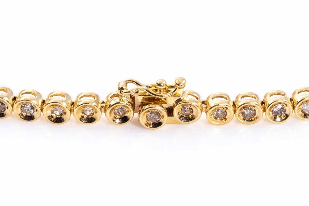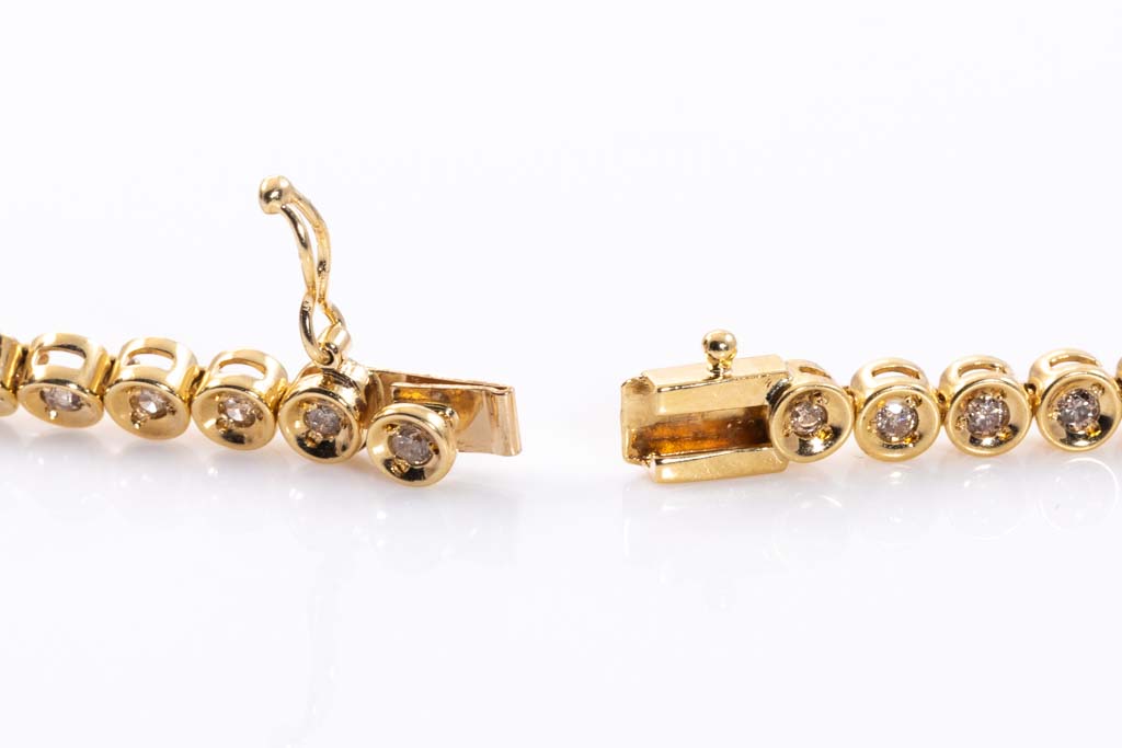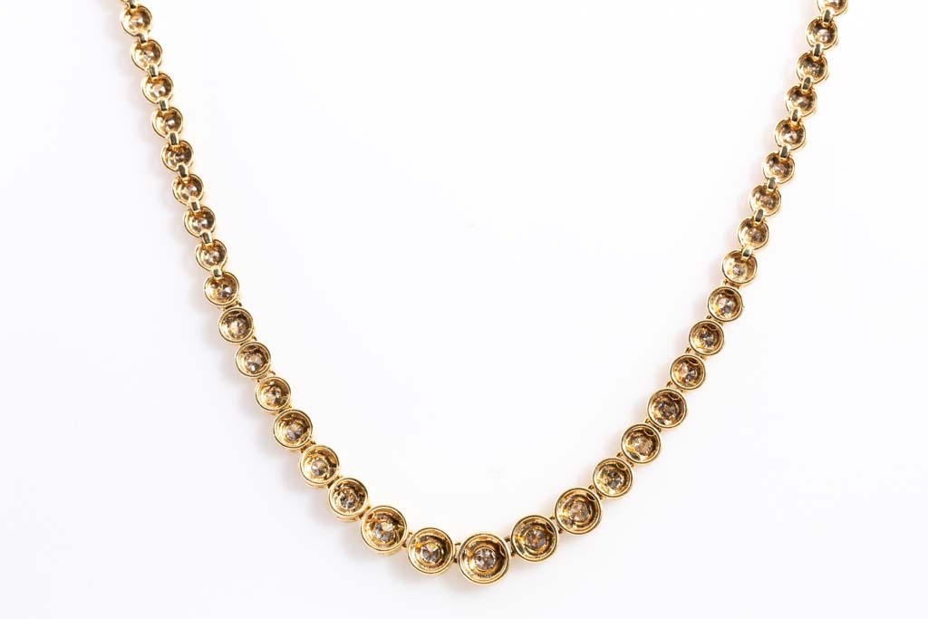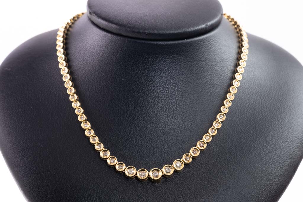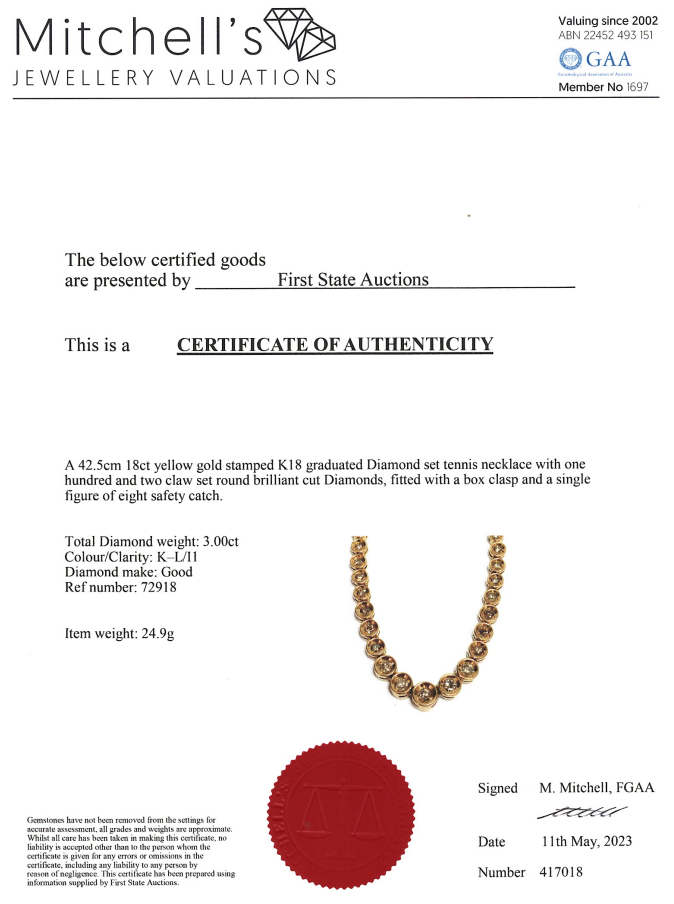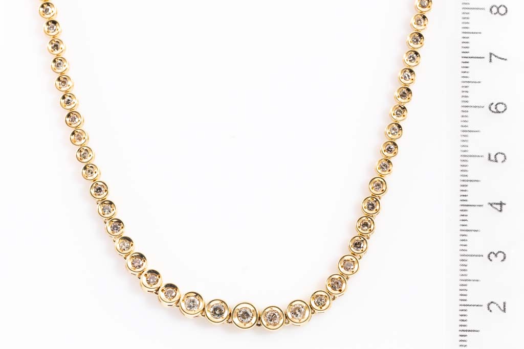Diamond tennis necklace with round Diamonds totalling 3.00cts (Estimated grading: K-L P1). 18ct yellow gold. Length: 42.5cm. Weight: 24.9g. With Certificate #417018. (Pre-owned)