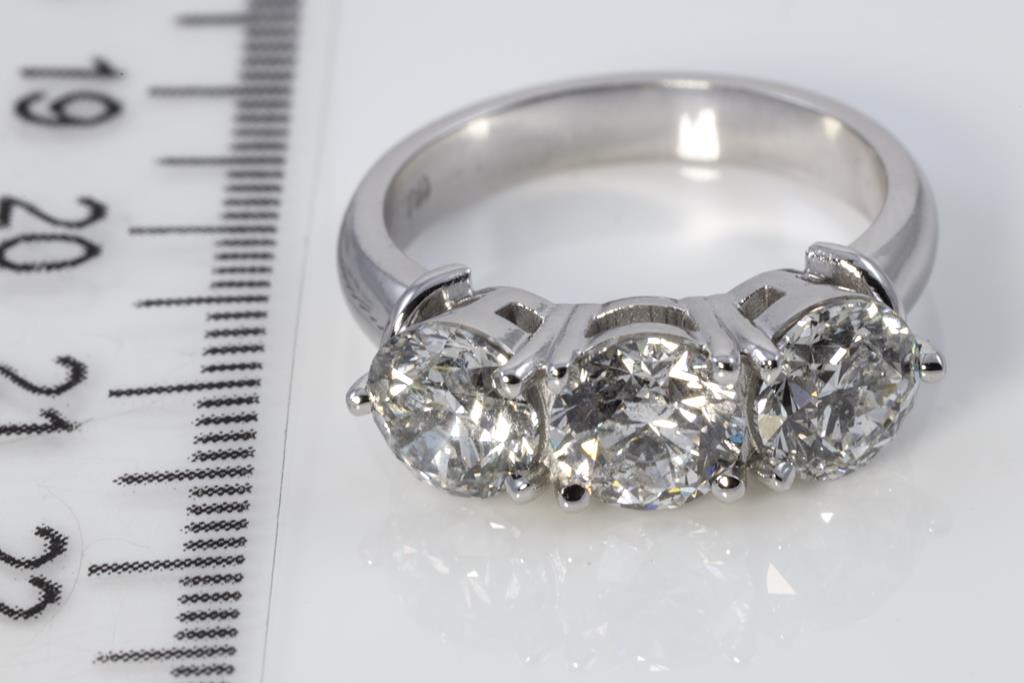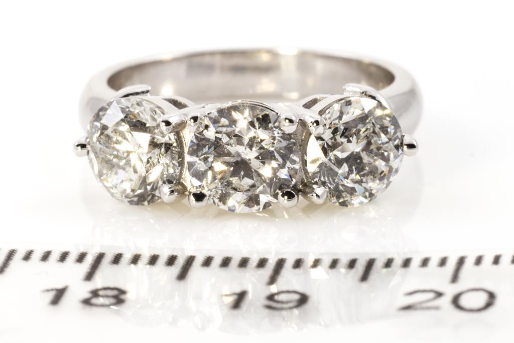 Diamond trilogy ring with 3 round brilliant cut diamonds totalling 3.00cts (with GSL Memos graded As G P1 # GSL030222-16, G P2 #GSL030222-14 and F P2 #GSL030222-15 ). 18ct white gold. Ring size L. Weight: 7.1g. (New)