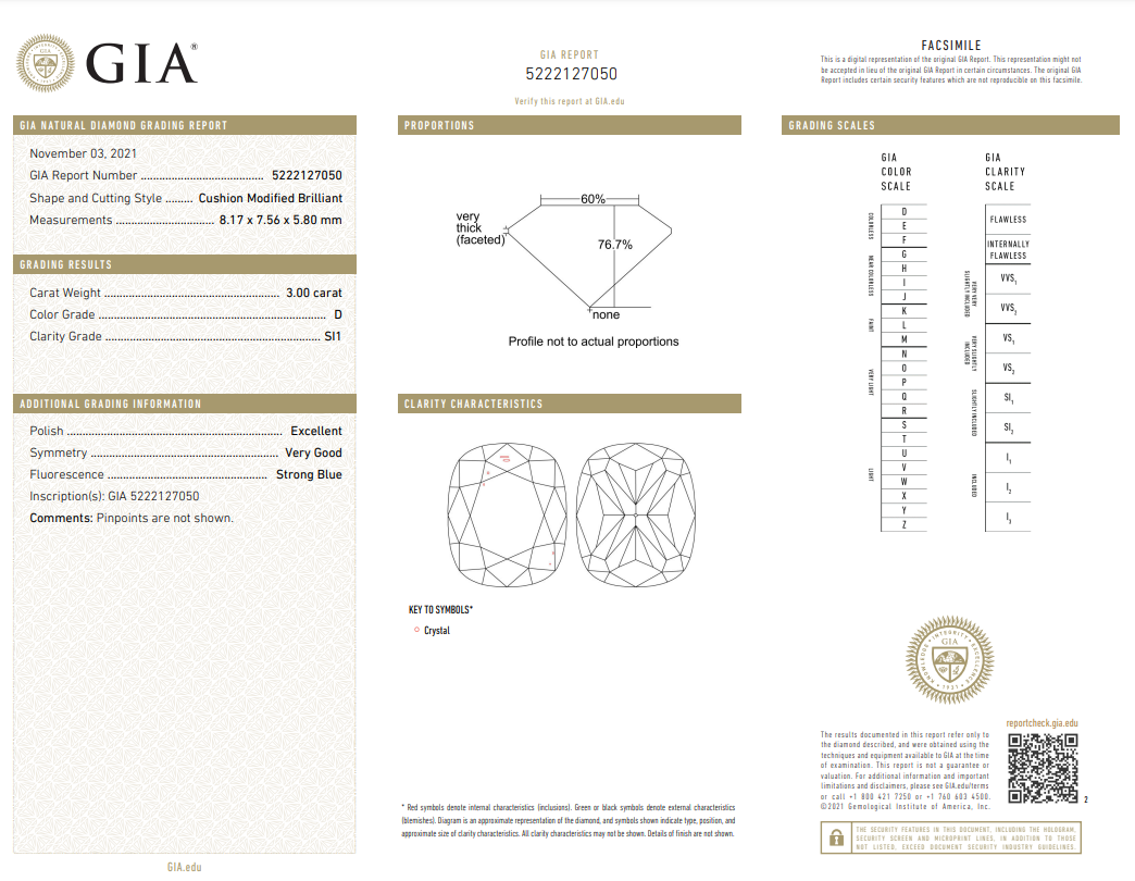 A loose cushion cut Diamond of 3.00ct (with GIA report graded as D SI1 #5222127050). (New)