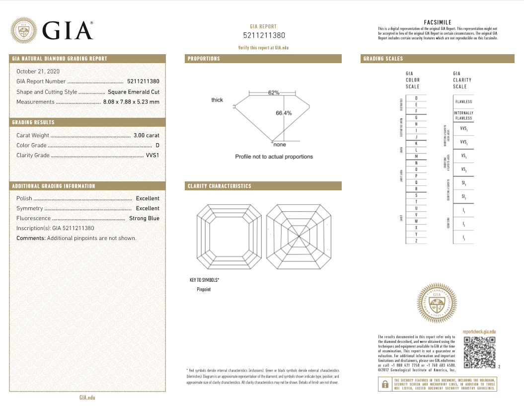 A loose square emerald Diamond of 3.00ct (with GIA report graded as D VVS1 #5211211380). (New)