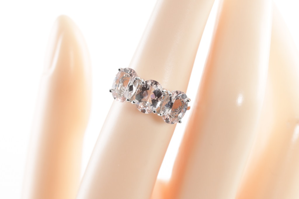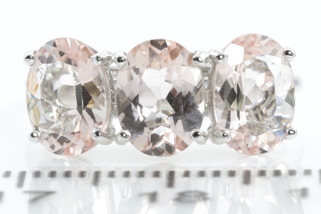 Morganite ring with 3 oval Morganites totalling approximately 3.00cts. 14ct white gold. Ring size L - ring resizing is not recommended. Weight: 2.9g. (As New)