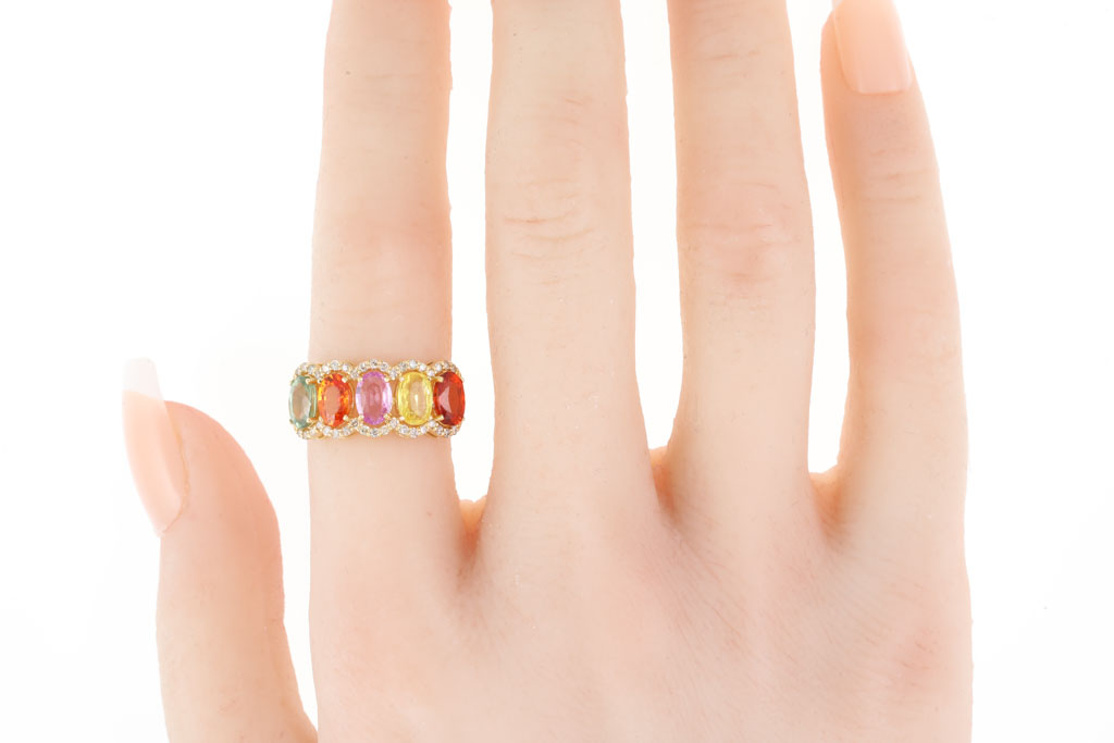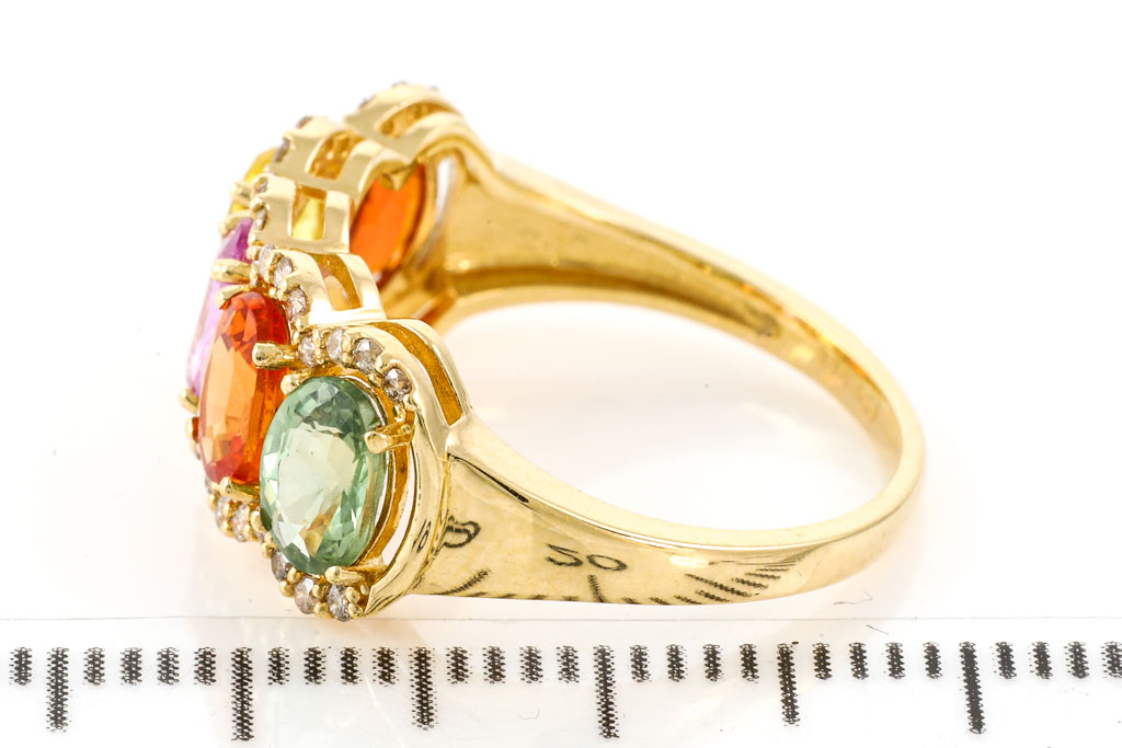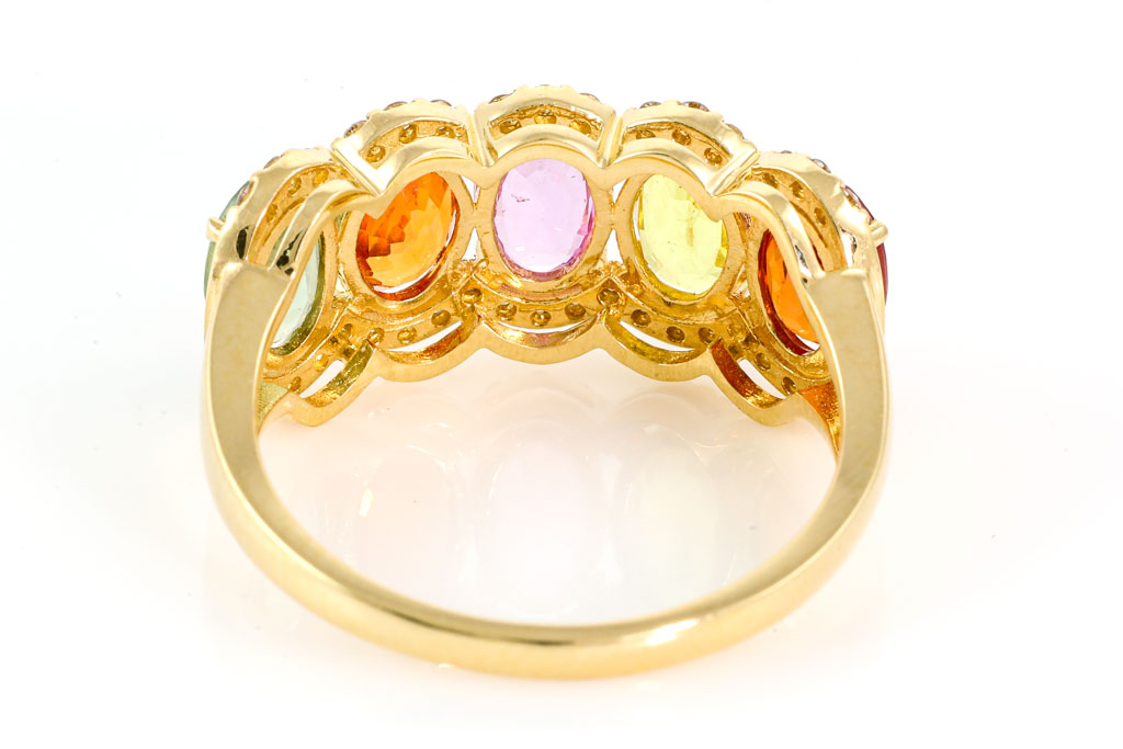 Sapphire and Diamond ring with oval shape Multi-coloured Sapphires totalling 3.00cts and round Diamonds totalling 0.19cts. 18ct yellow gold. Ring size L. Weight: 3.5g. (Pre-owned)