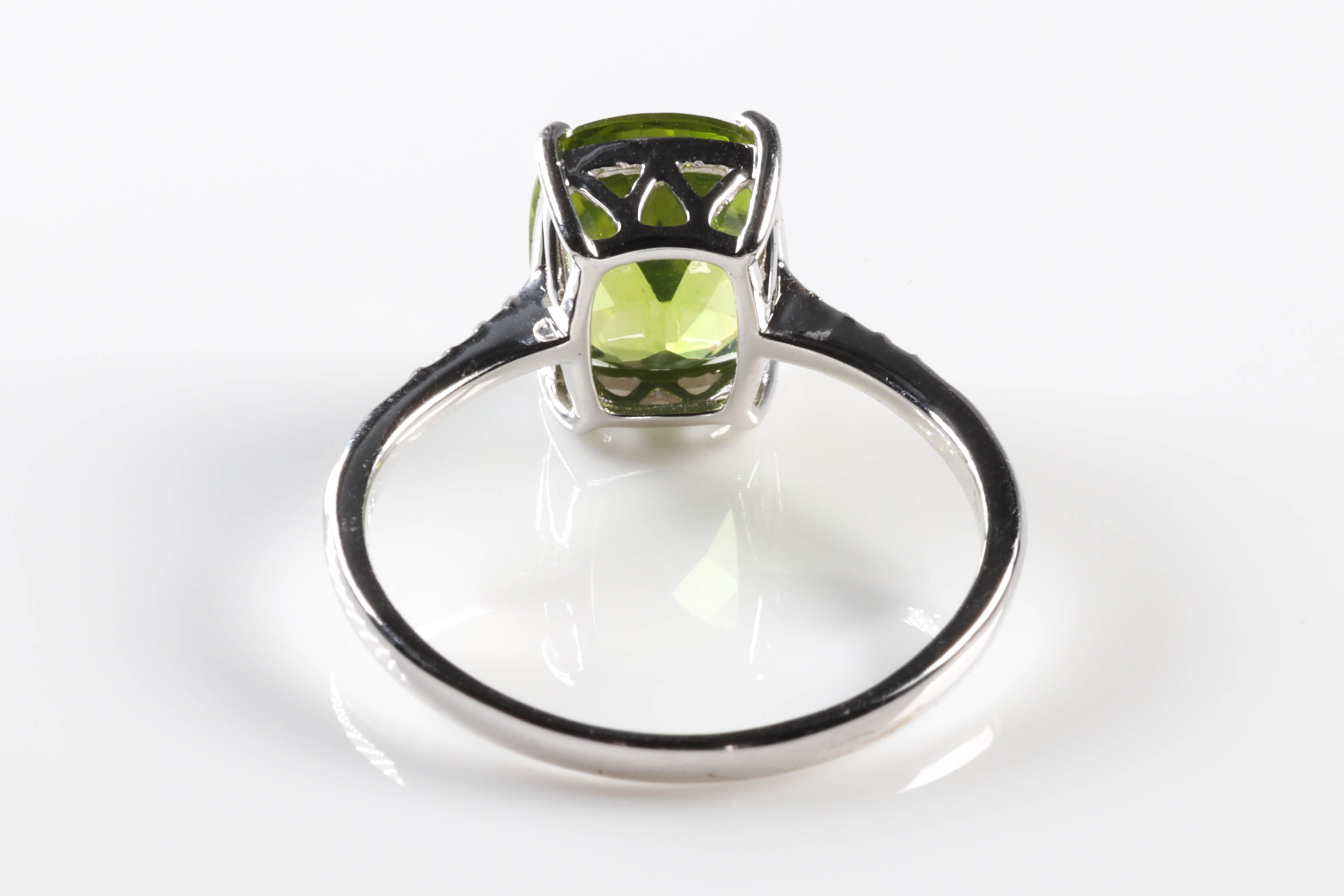 Peridot and Diamond ring with a cushion cut Peridot of approximately 3.00ct and Diamonds totalling approximately 0.05cts. 14ct white gold. Ring size Q. Weight: 2.7g. (As new)