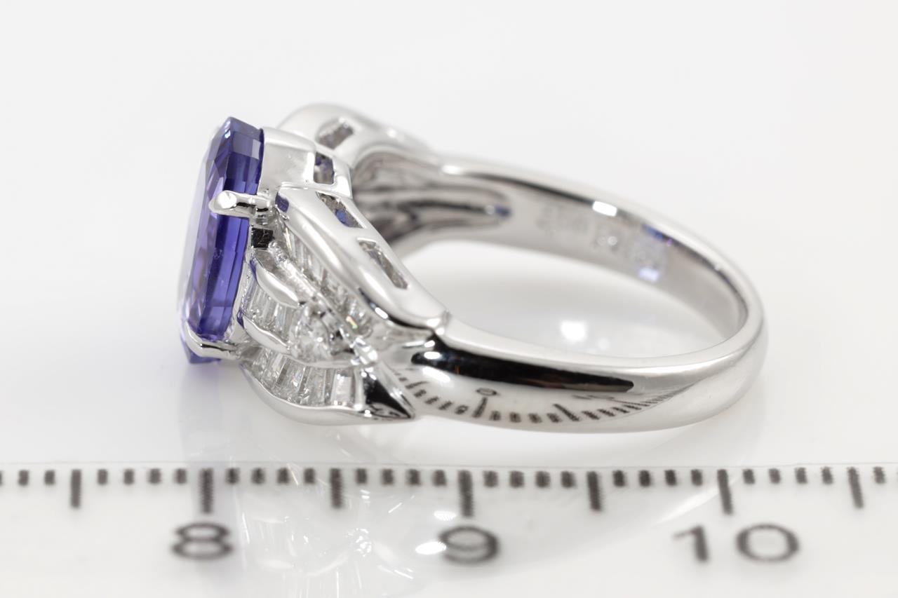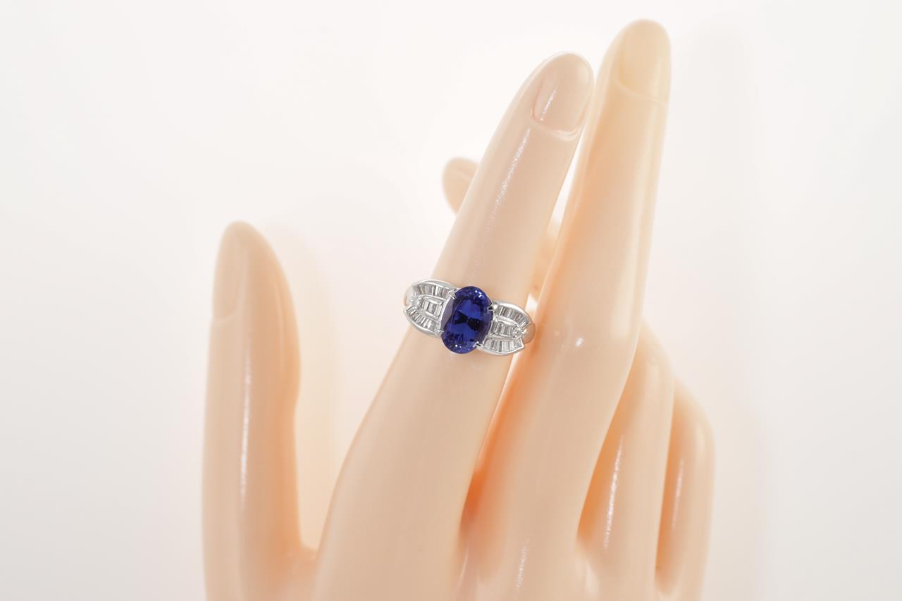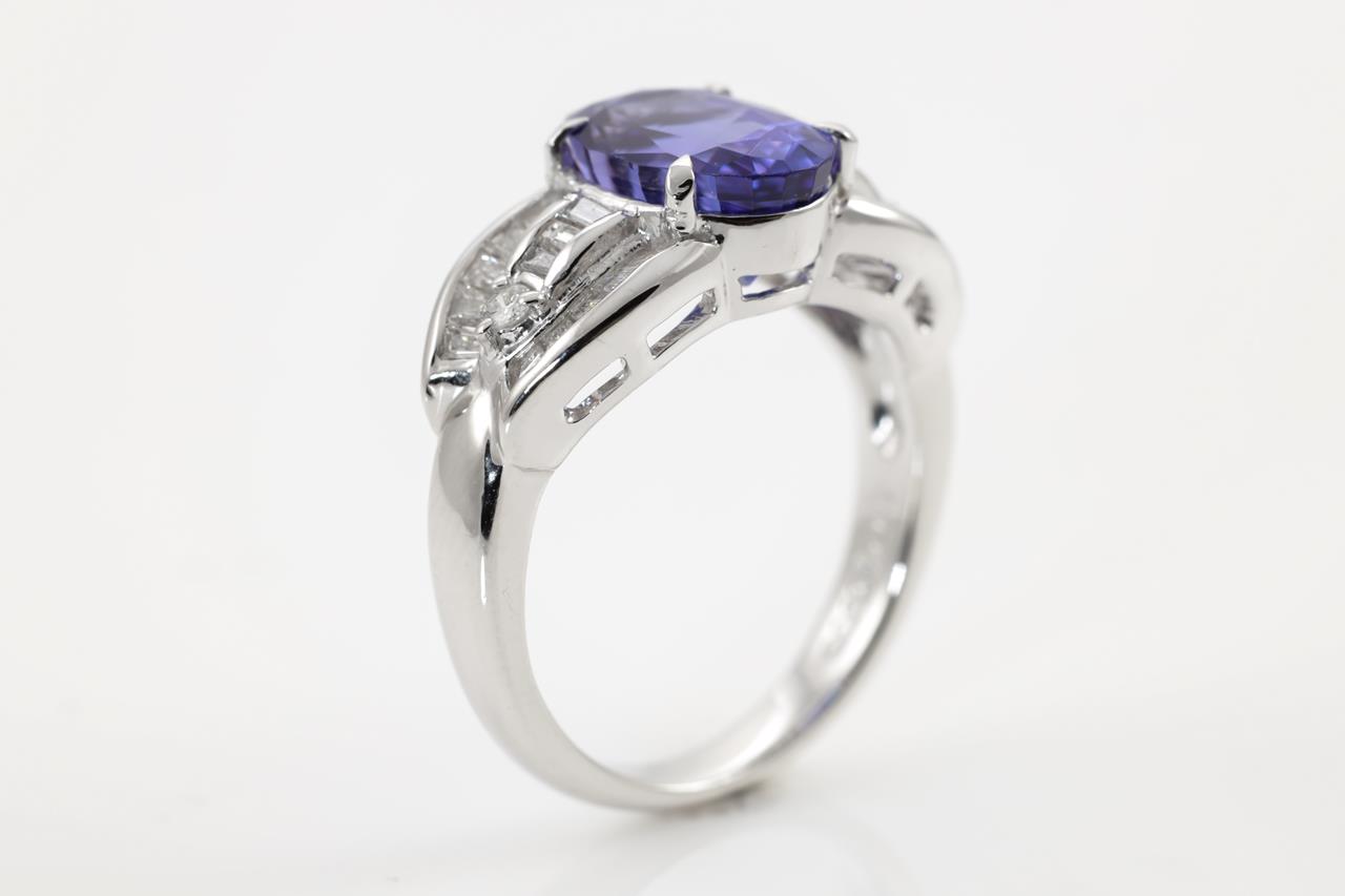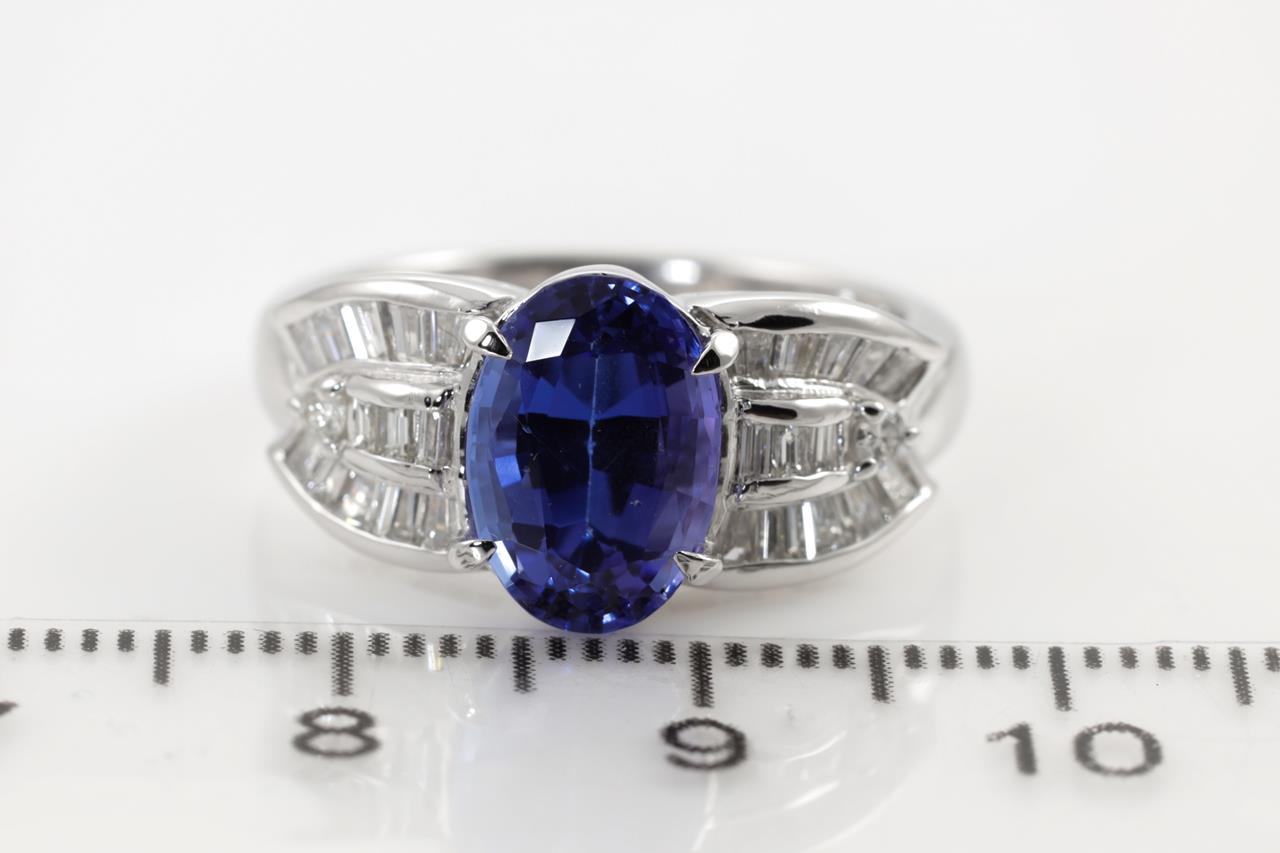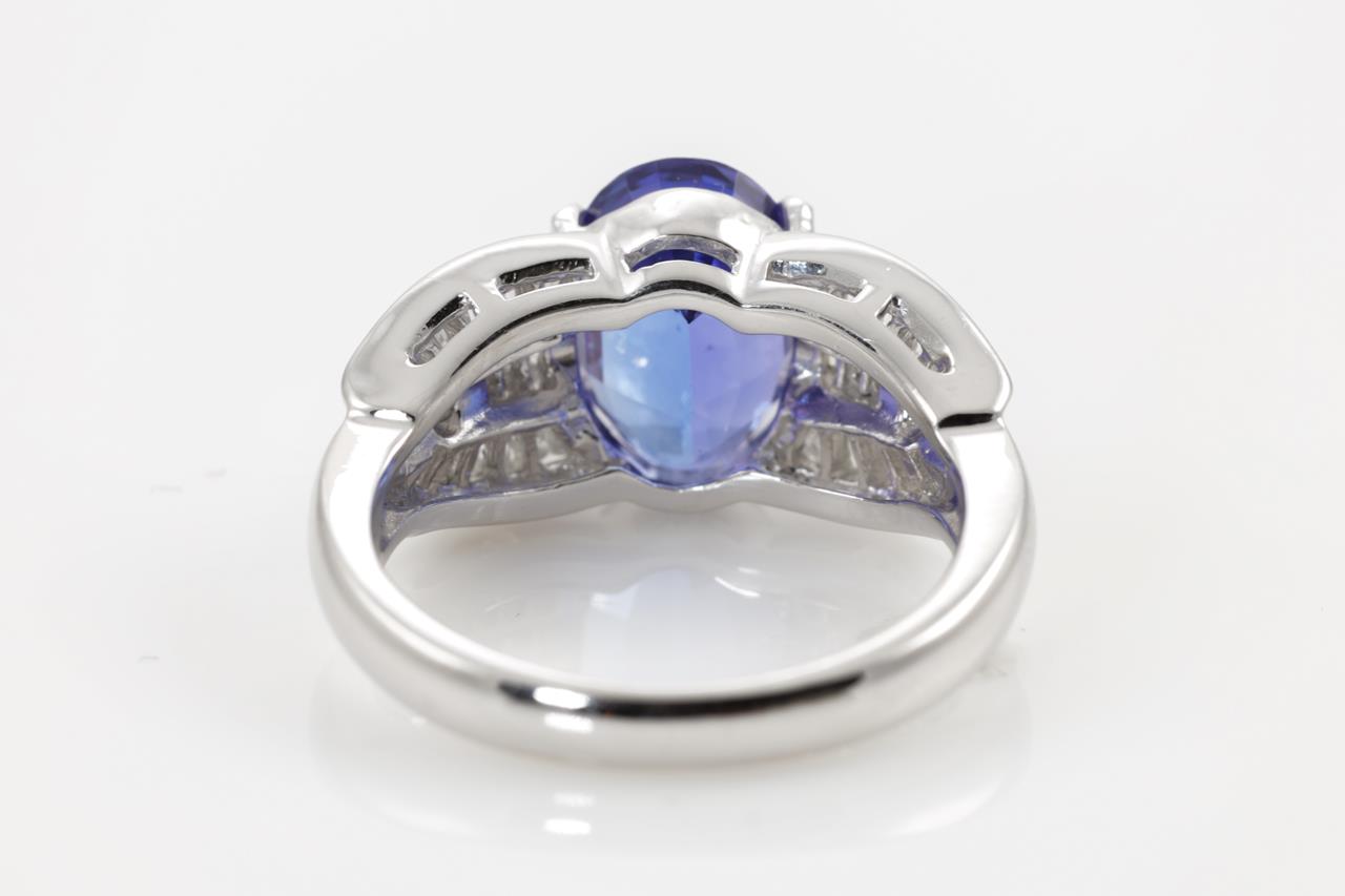 Tanzanite and Diamond ring with an oval Tanzanite of 3.00ct with round and baguette cut Diamonds totalling 0.50cts (Estimated grading: G-H SI). Platinum. Weight: 8.4g (Pre-owned)