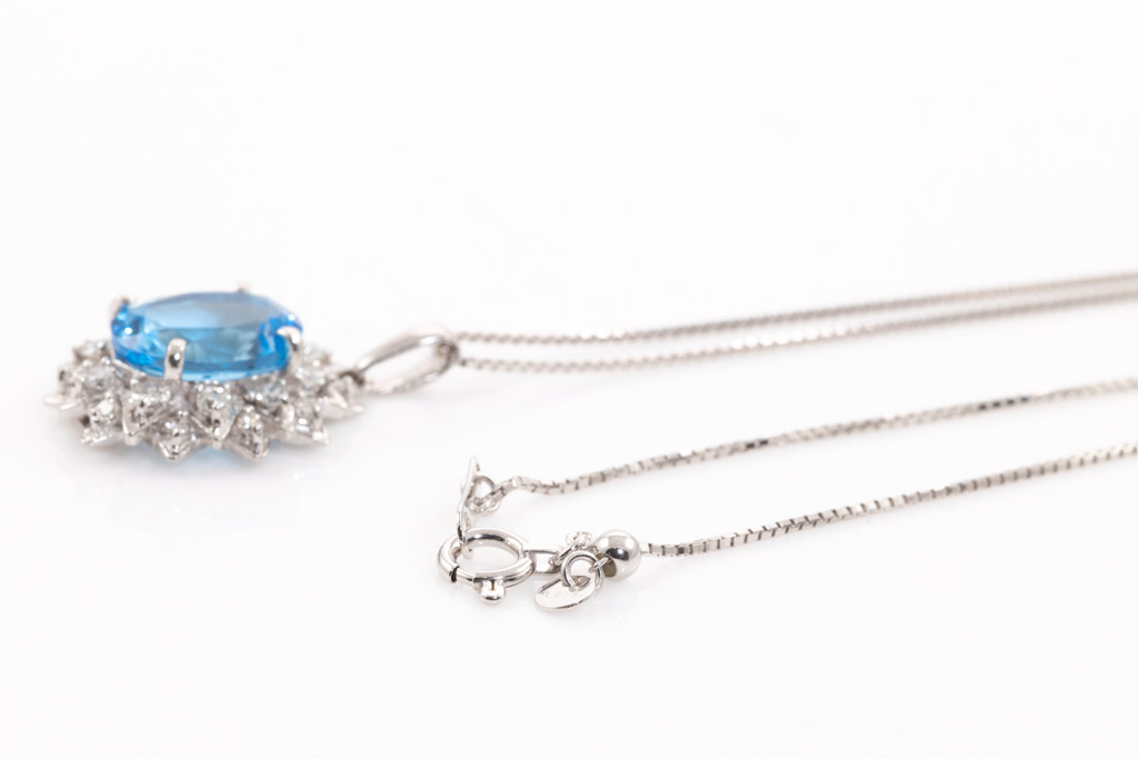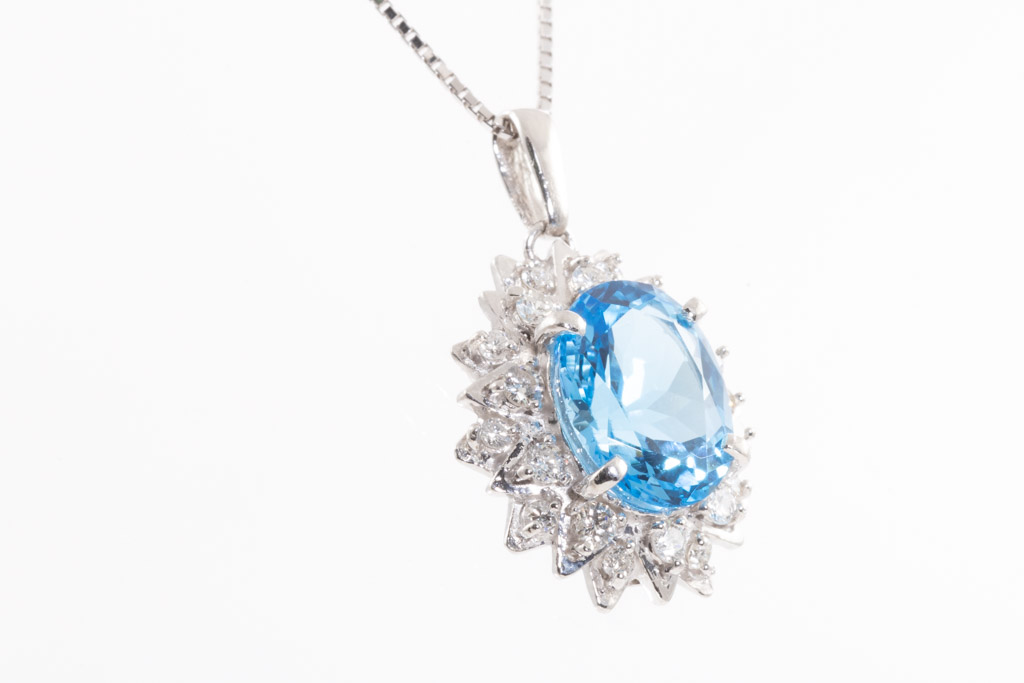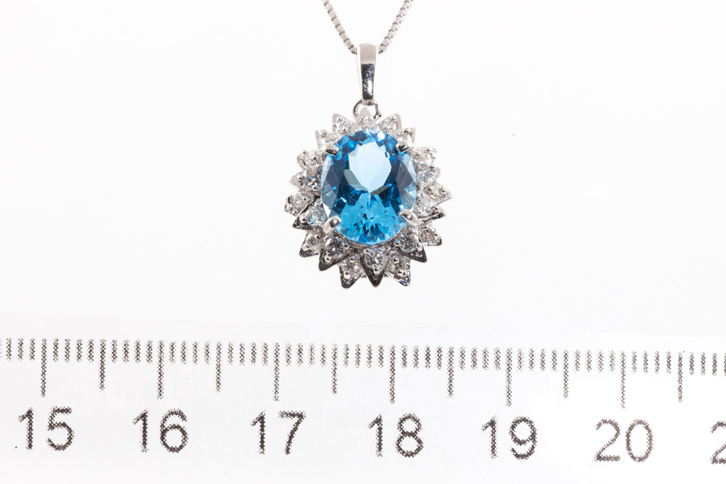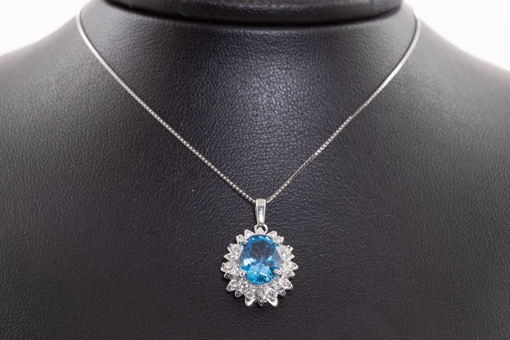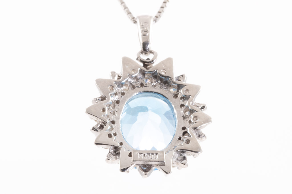 Topaz and Diamond pendant with Topaz of 3.00ct and round Diamonds totalling 0.25cts. Platinum with 44cm 18ct white gold adjustable chain. Weight: 5.9g. (Pre-owned)
