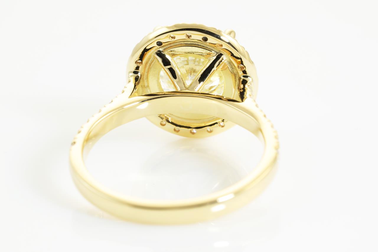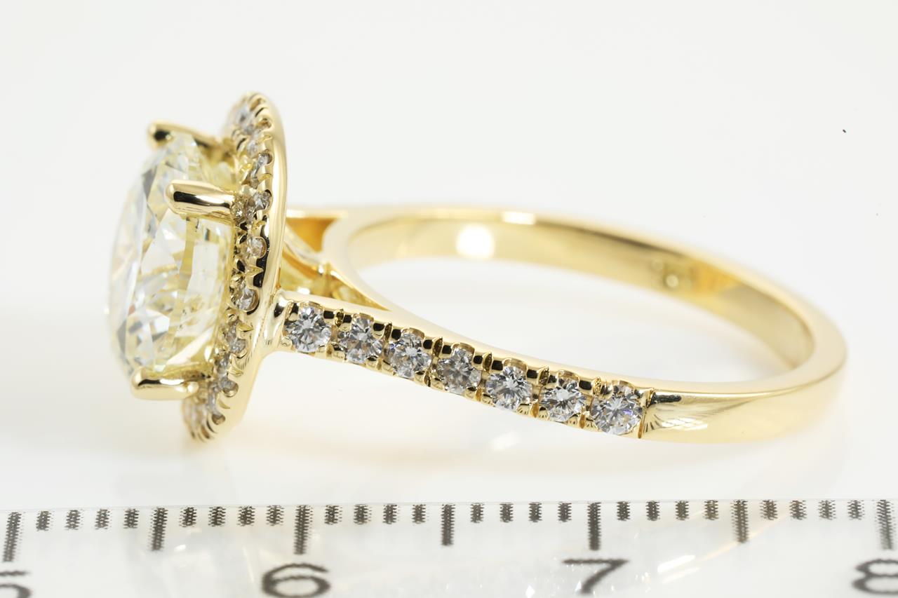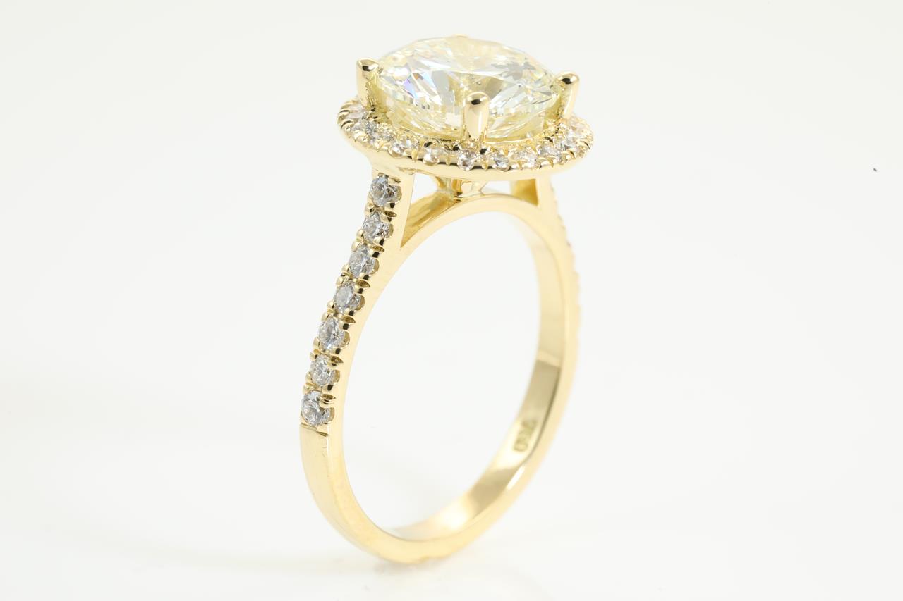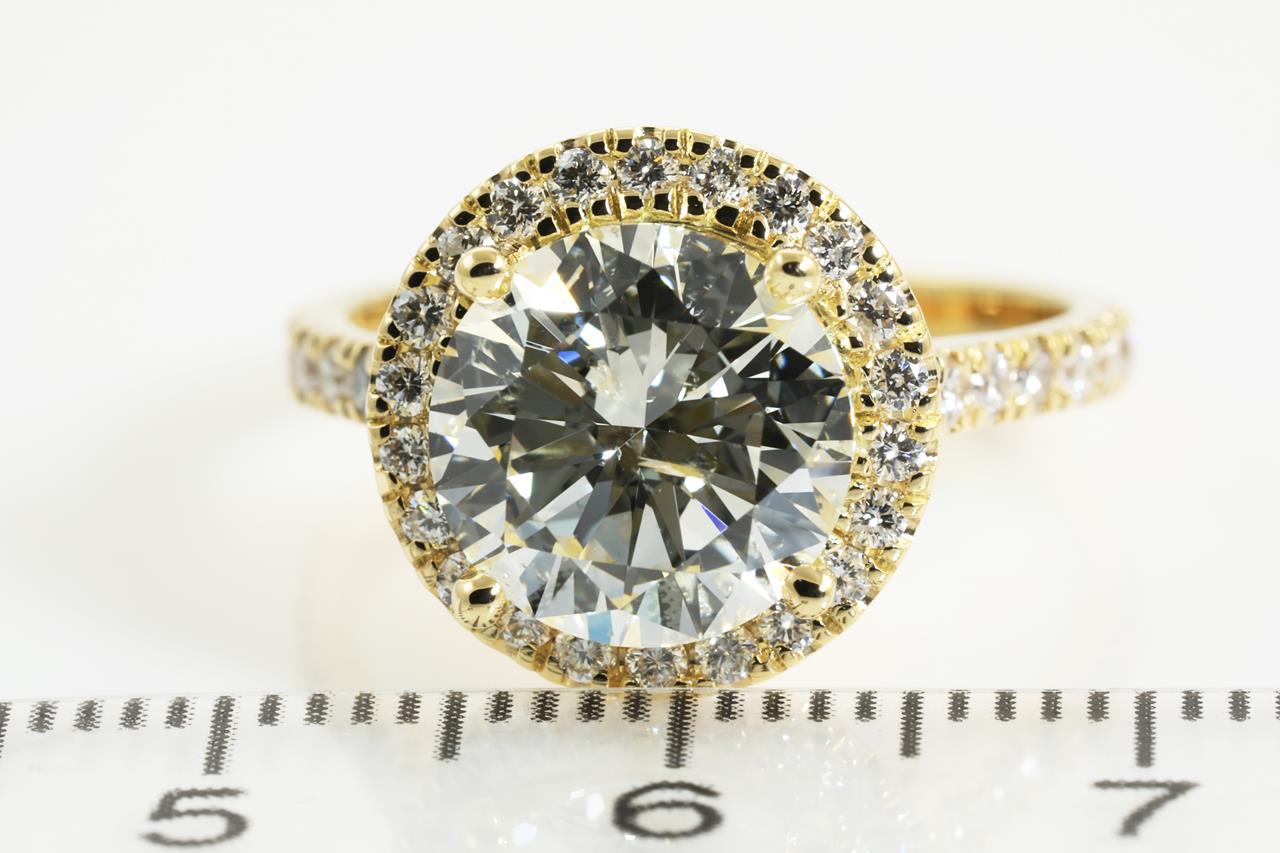 Diamond halo ring with a centre round brilliant cut Diamond of 3.01ct (with HRD report graded as L SI2 #210000074842) and remaining Diamonds totalling 0.49cts. 18ct yellow gold. Ring Size L. Weight: 4.9g (New)