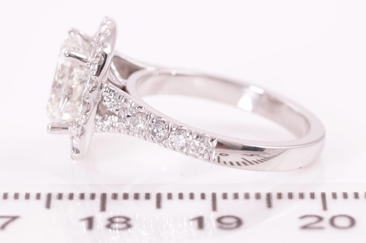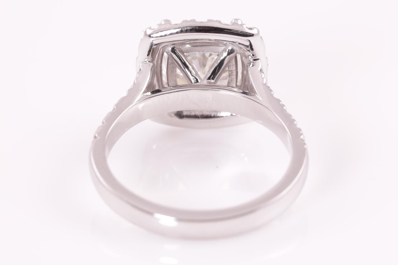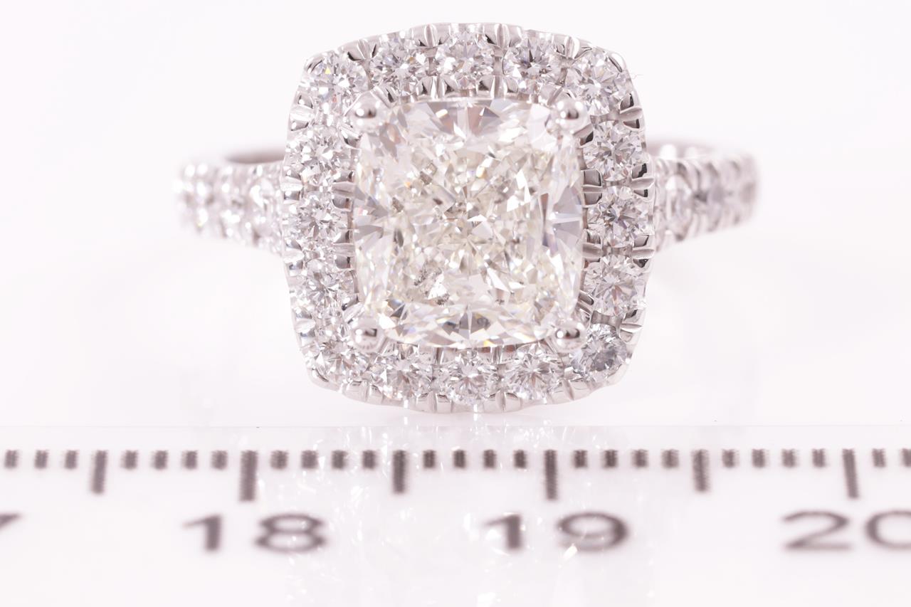 Diamond ring with a centre cushion cut Diamond of 3.01ct (with GIA report graded as J SI2 #5211826337) and diamonds 0.87cts (Estimated grading: G VS-SI) . 18ct white gold. Ring size M. Weight: 6.8g. (New)