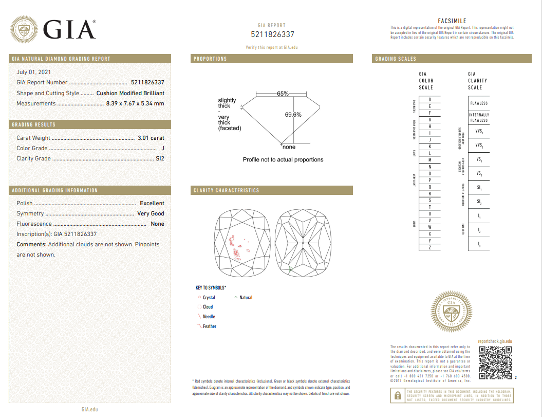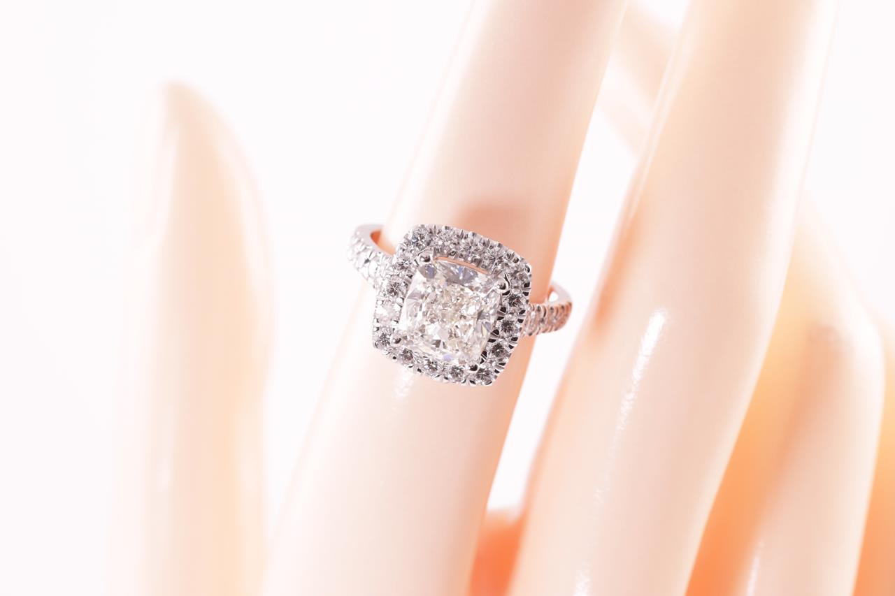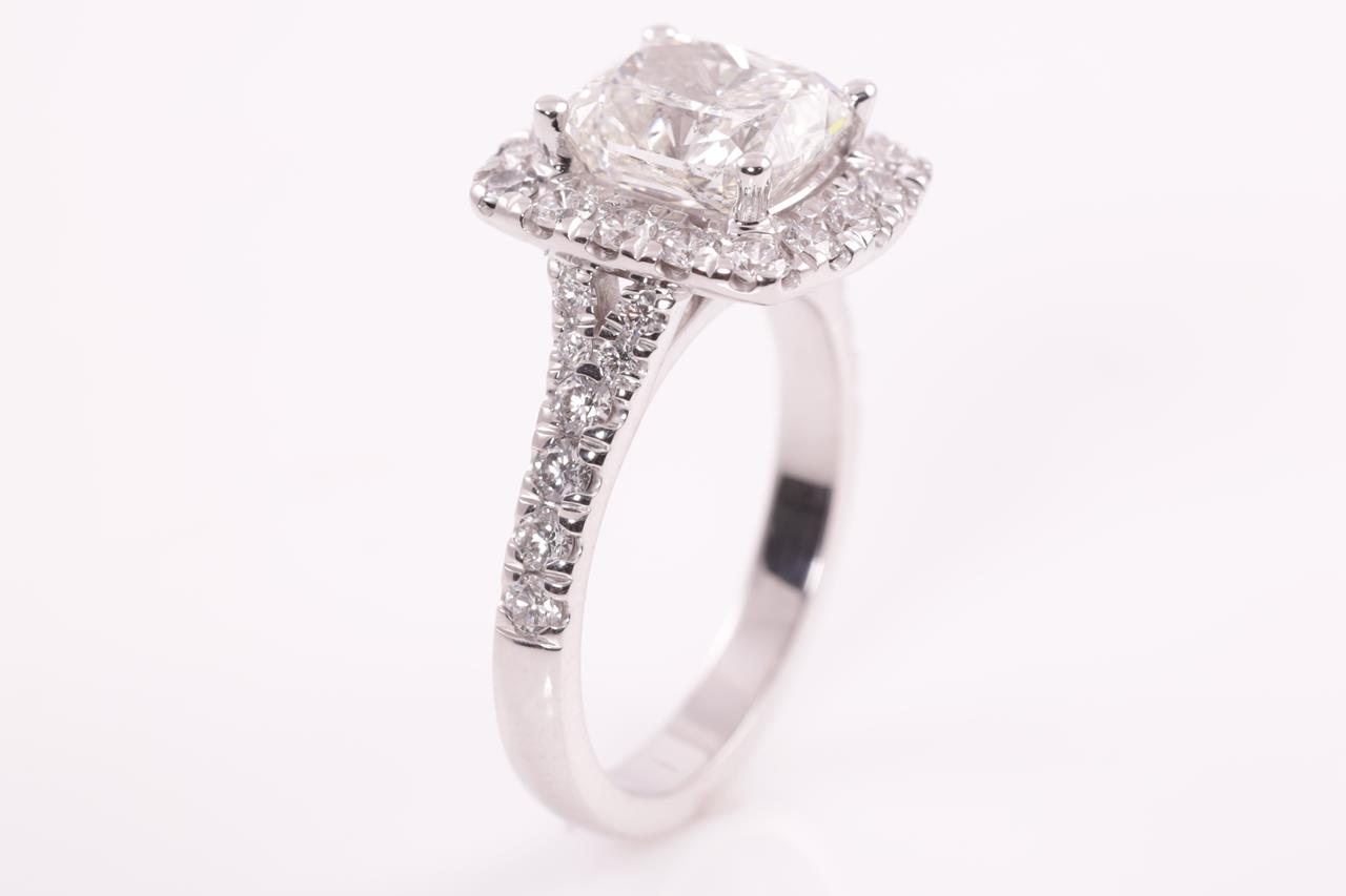Diamond ring with a centre cushion cut Diamond of 3.01ct (with GIA report graded as J SI2 #5211826337) and diamonds 0.87cts (Estimated grading: G VS-SI) . 18ct white gold. Ring size M. Weight: 6.8g. (New)
