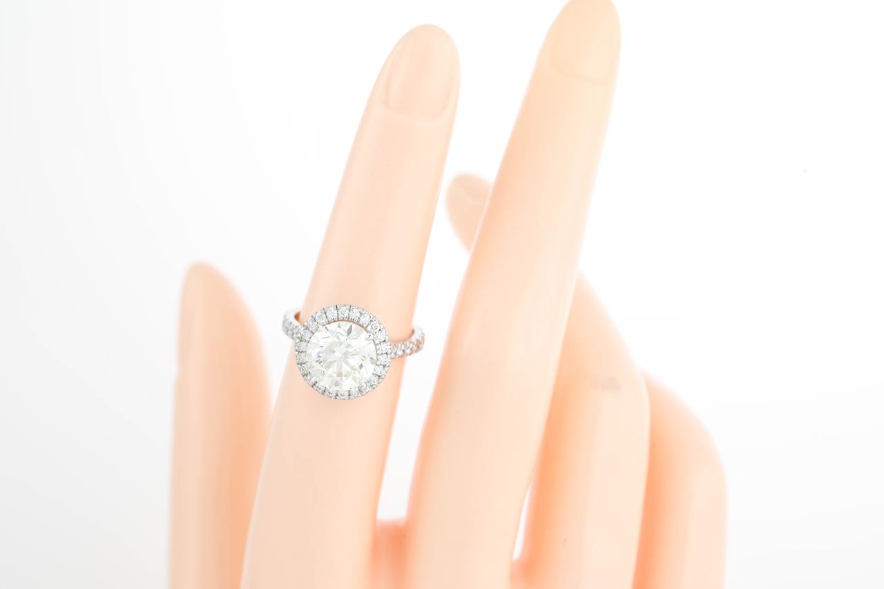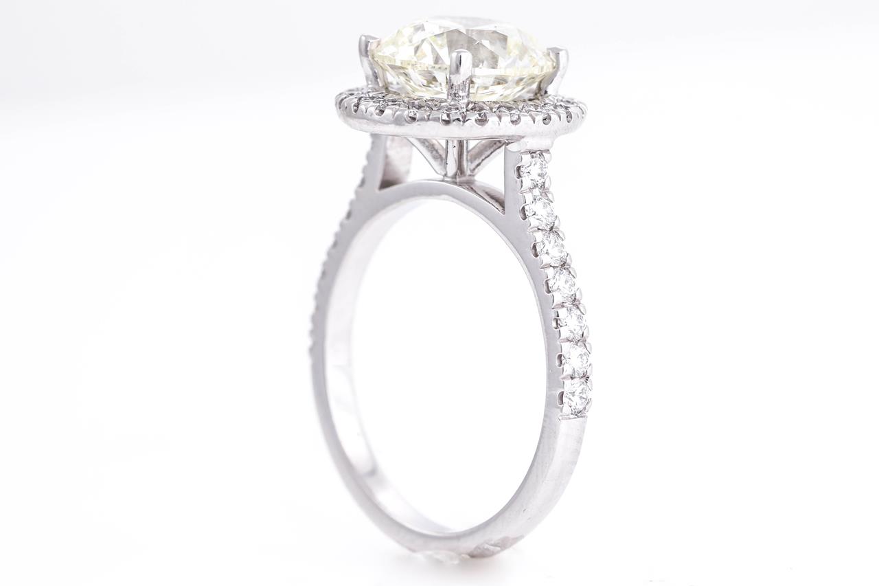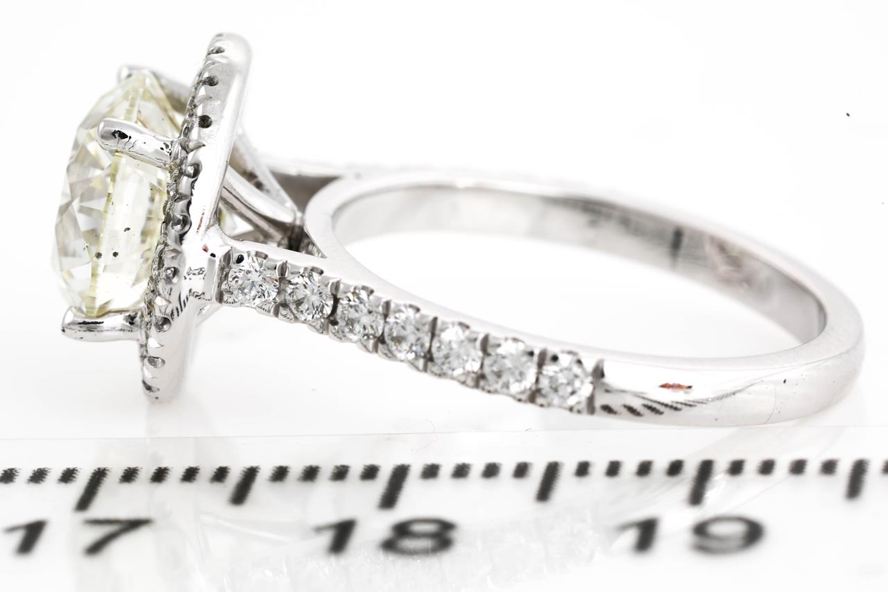 Diamond Halo ring with Round Brilliant cut Diamond of 3.01ct (with GIA report graded as M VS2 #21409150345) with surrounding Diamonds totalling 0.52cts (Estimated grading: G-H VS-SI). 18ct white gold. Ring size L. Weight: 5.1g (New)
