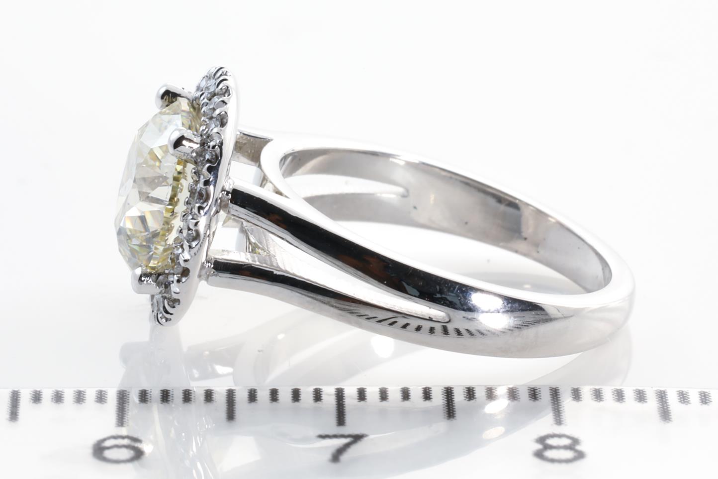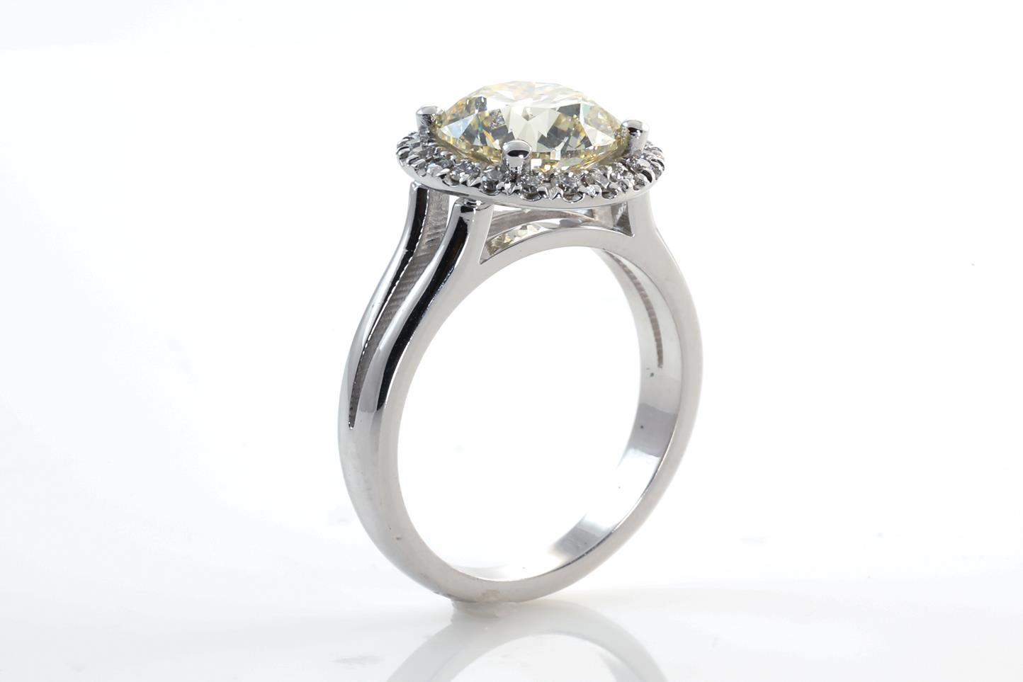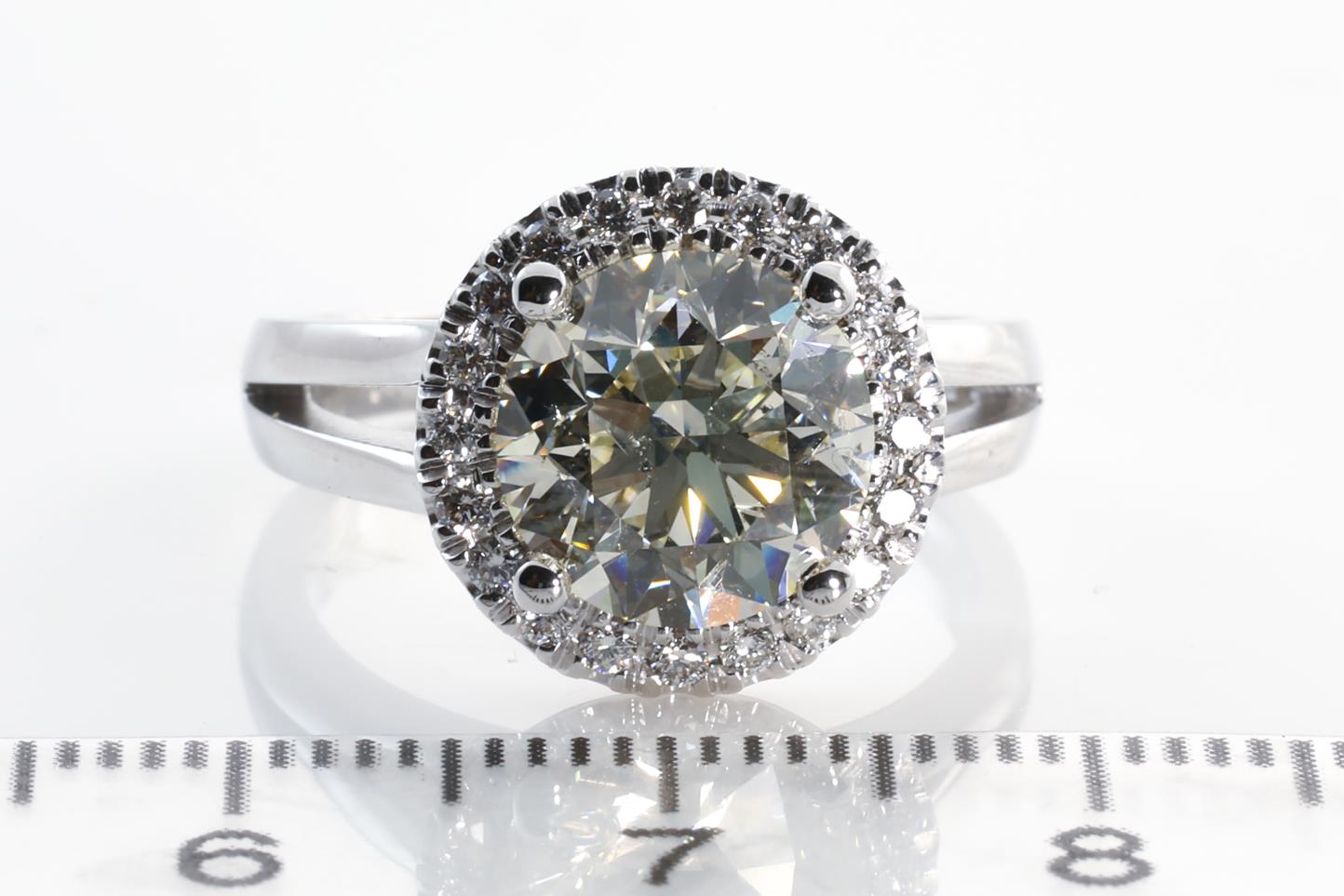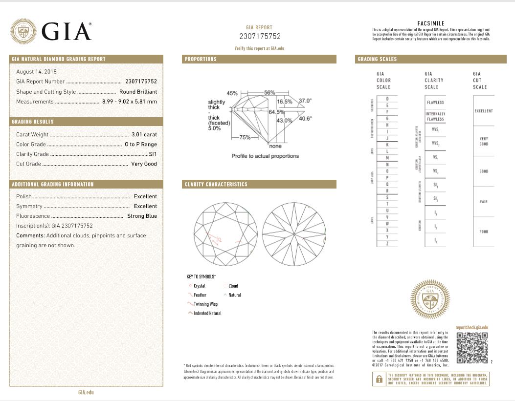 Diamond ring with centre round brilliant cut Diamond of 3.01ct (with GIA report graded as O-P SI1 #2307175752) and surrounding Diamonds totalling 0.21cts. 18ct white gold. Ring size: L1/2. Weight: 6.6g (New)
