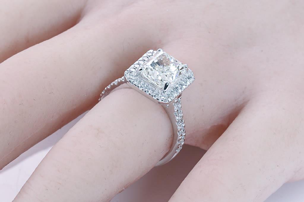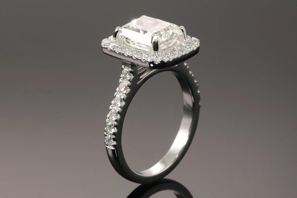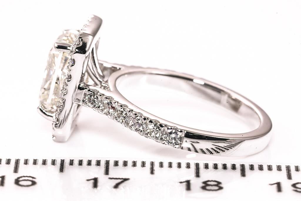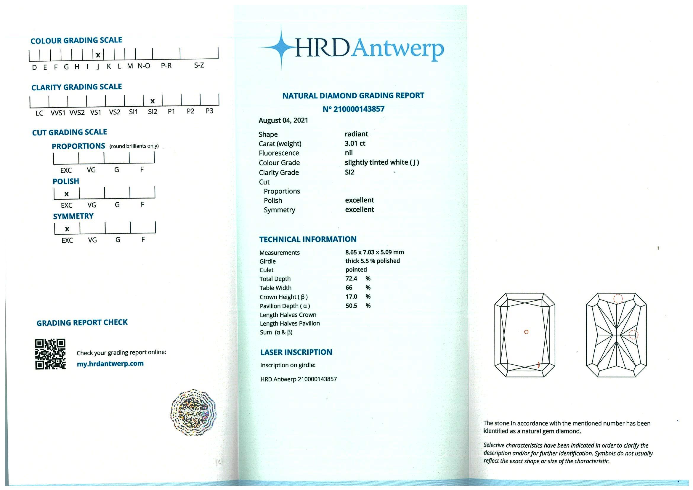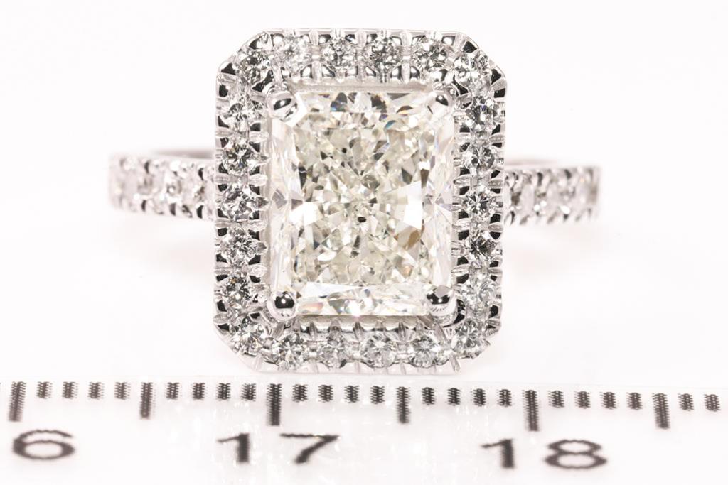 Diamond ring with a centre radiant cut Diamond of 3.01ct (with HRD report graded as J SI2 #210000143857) and remaining Diamonds totalling 0.62cts (Estimated grading: H SI). 18ct white gold. Ring size L. Weight: 7.2g. (New)