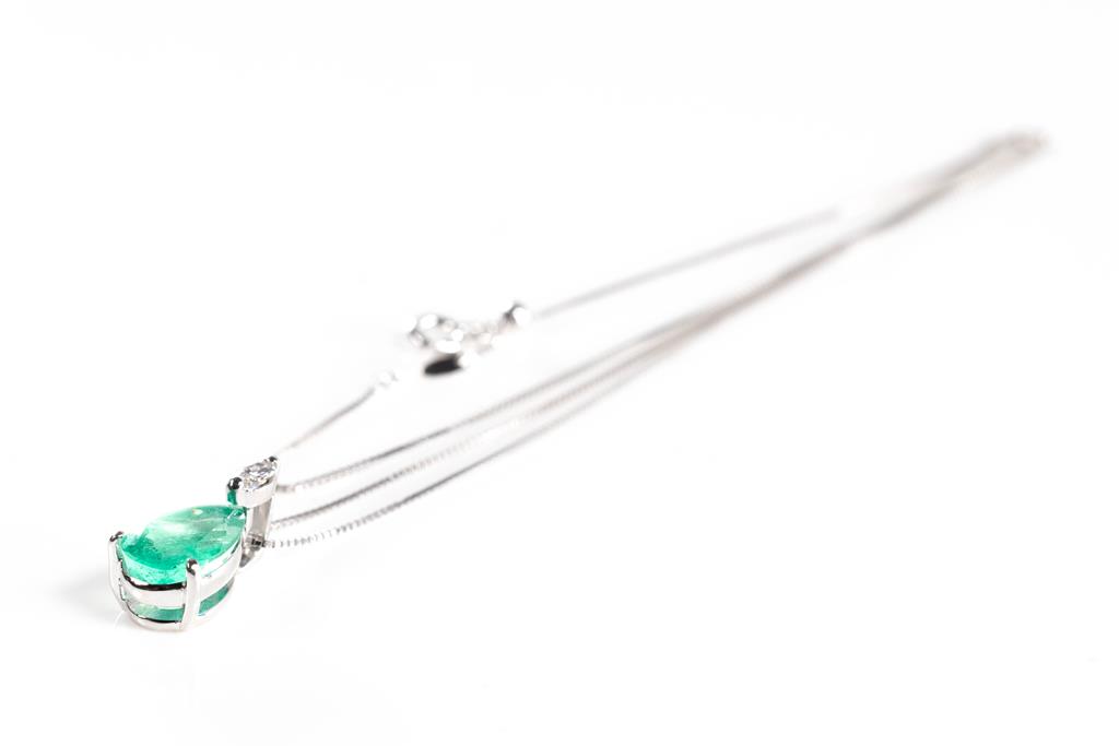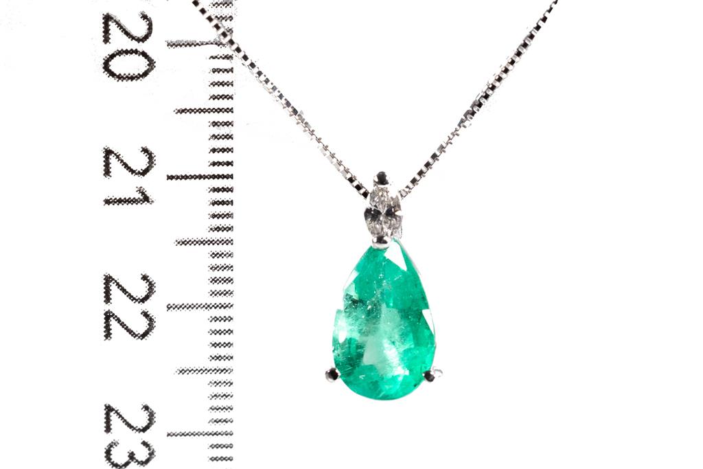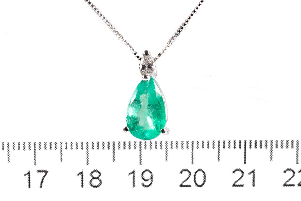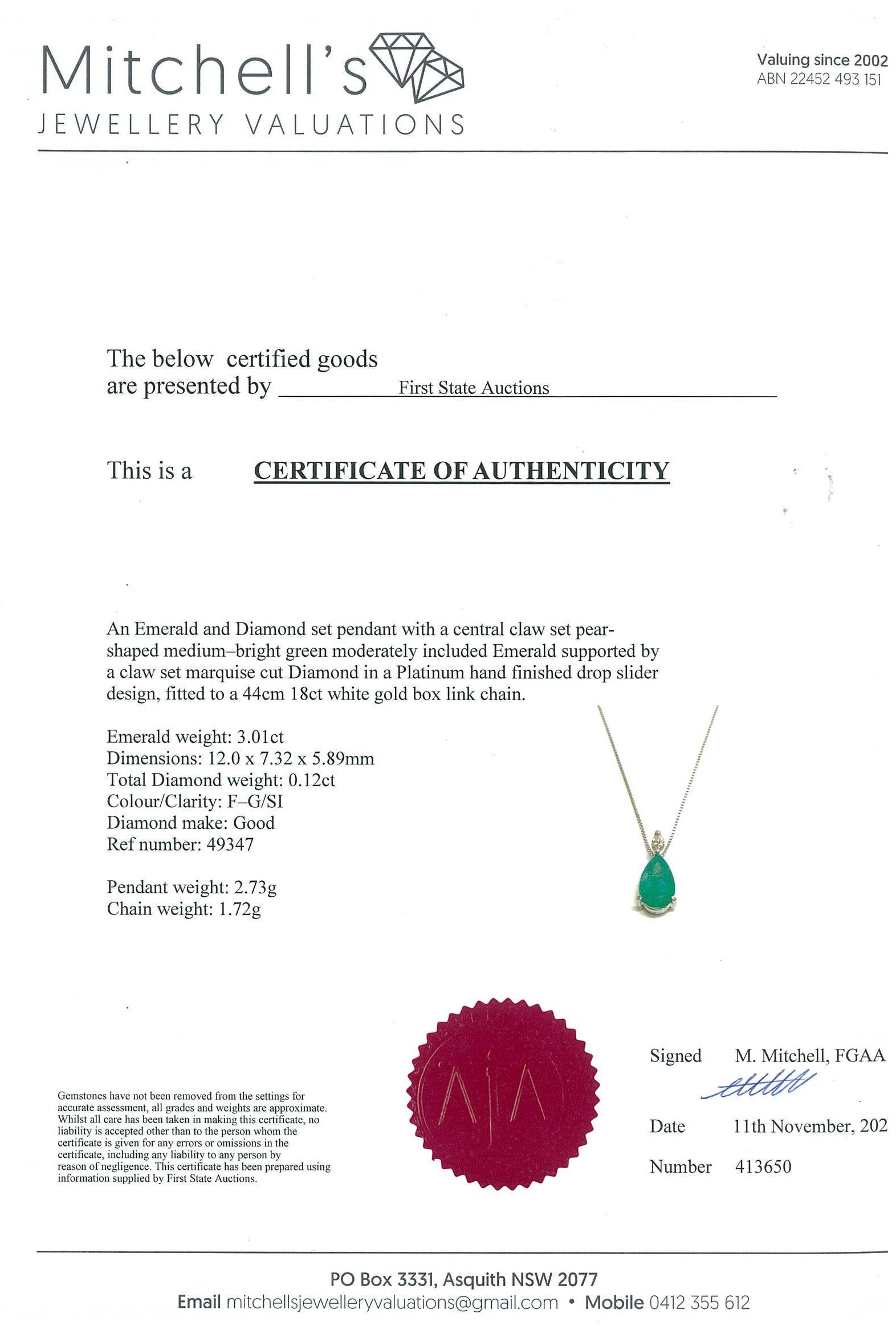 Emerald and Diamond pendant with pear shape Emerald of 3.01ct and marquise cut Diamond totalling 0.12cts. Platinum with 18ct white gold adjustable 45cm chain. With copy of Certificate #413650. Weight: 4.45g (Pre-owned)
