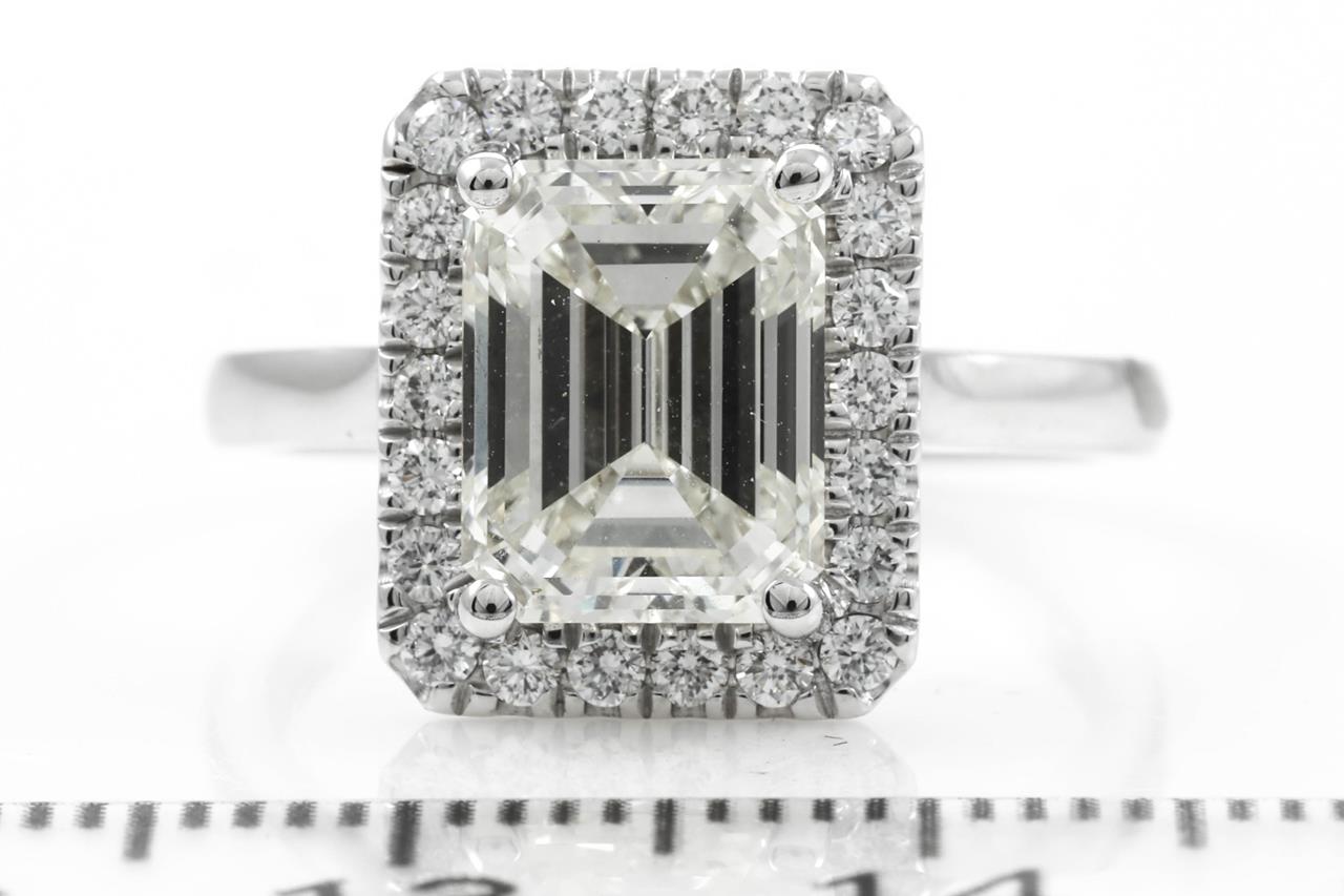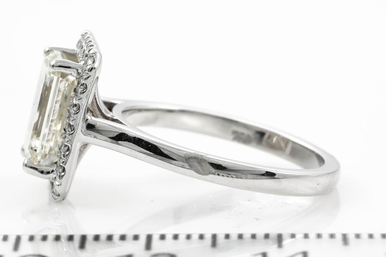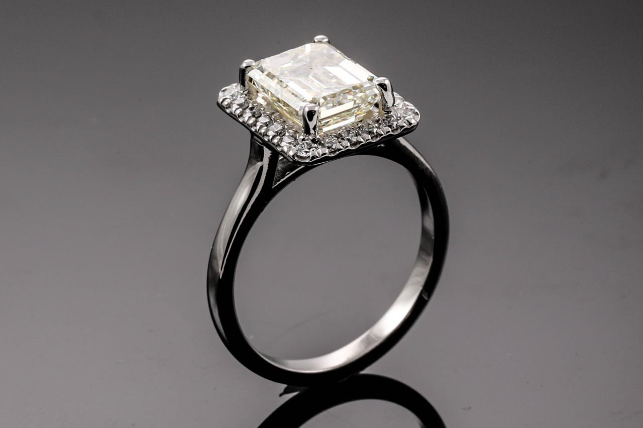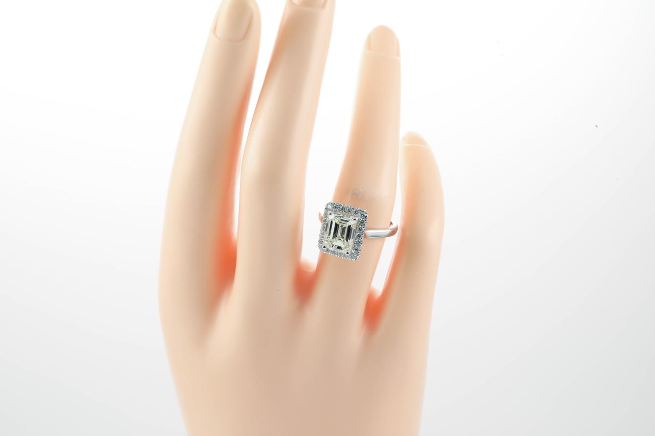 Diamond ring with Emerald cut Diamond of 3.01ct (with GSL report graded as M VS2 #AA65336/1) and surrounding Diamonds totalling 0.29cts. 18ct white gold. Ring Size: M. Weight: 5.5g. (New)
