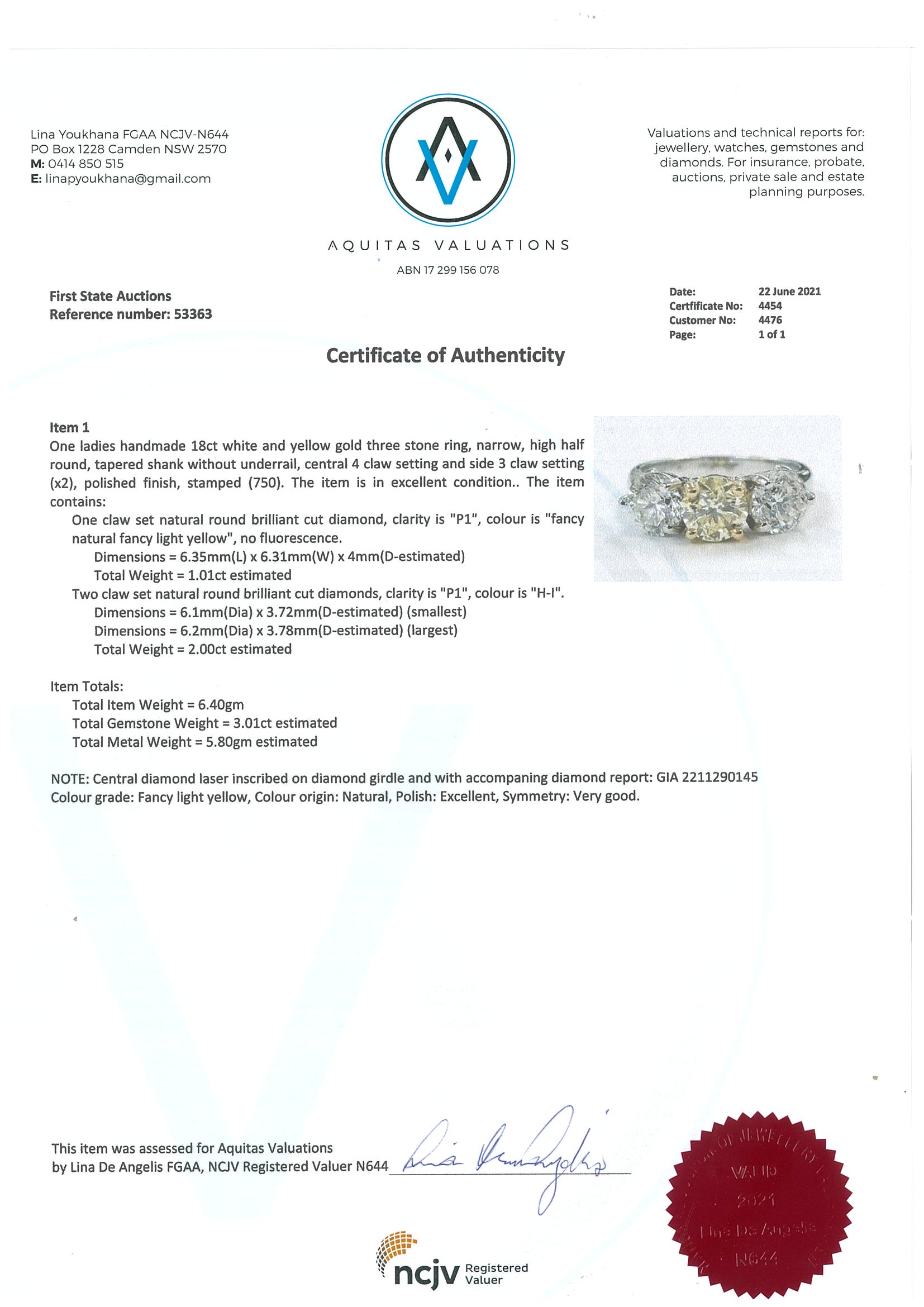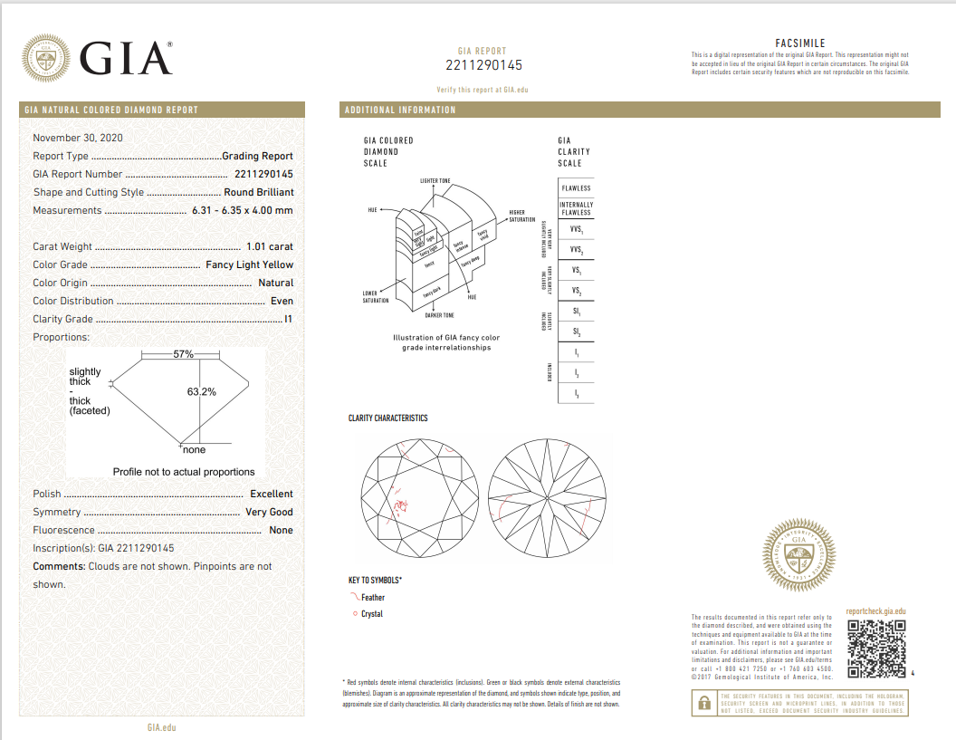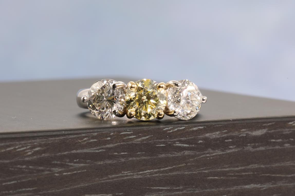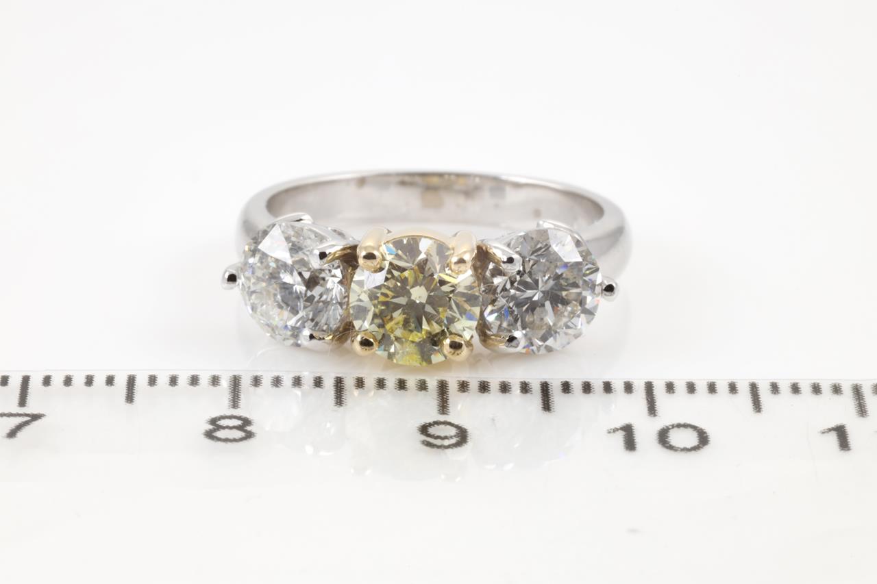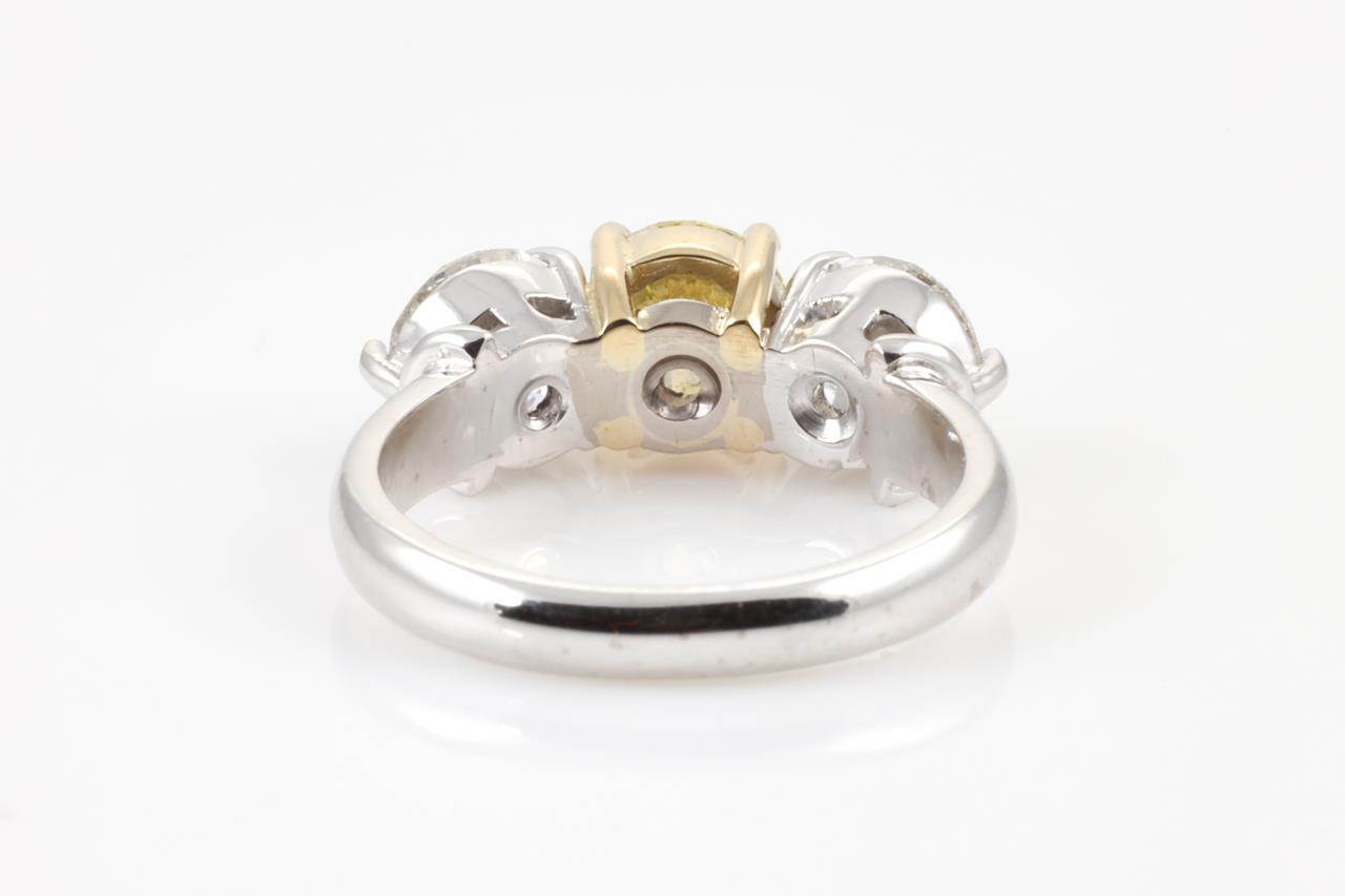 Diamond Ring with centre round brilliant cut Diamond of 1.01ct (with GIA report graded as Natural Fancy Light Yellow Even P1 #2211290145) and 2 side diamonds totalling 2.00cts (Estimated grading: H-I P1). 18ct white and yellow gold. Ring size: L 3/4. Weight: 6.4g. With certificate #4454 (New).