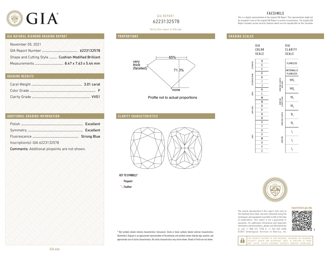 A loose Cushion cut Diamond of 3.01ct (With GIA report graded as F VVS1 #6223132578). (New)