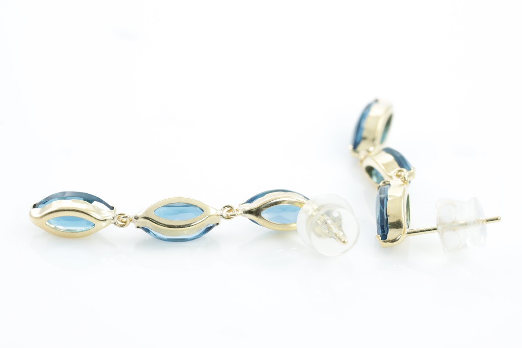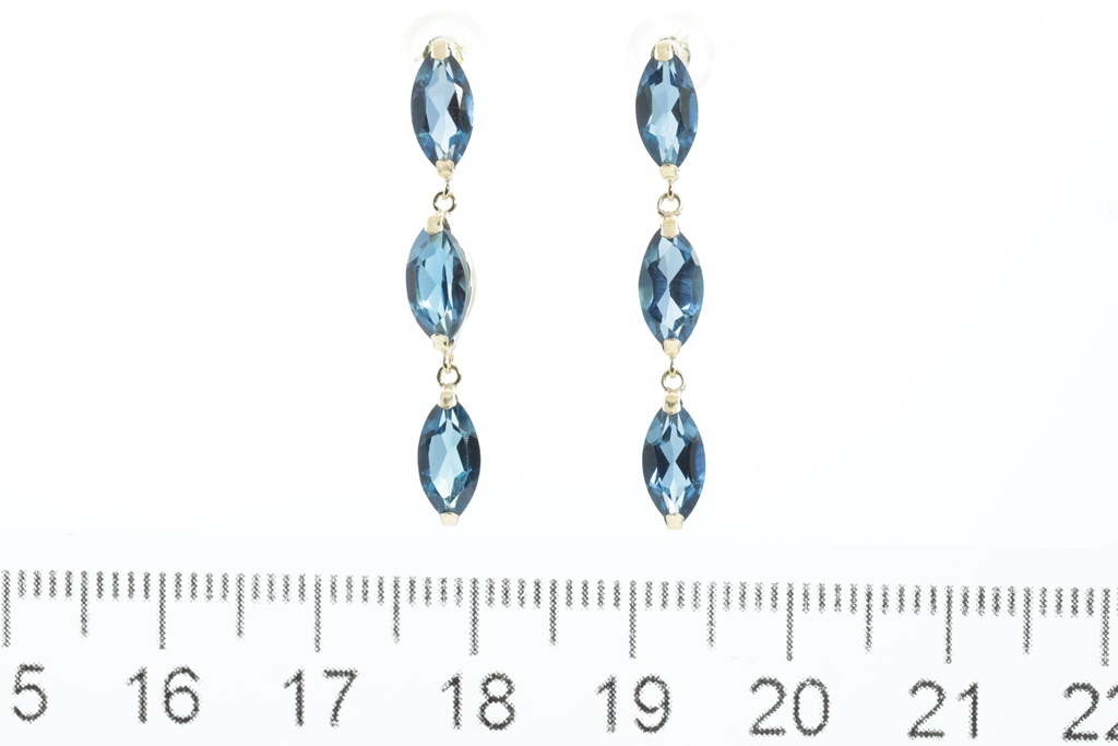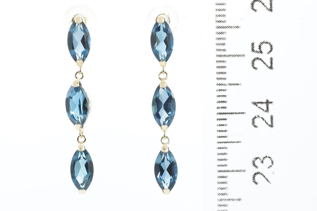 Topaz earrings with marquise cut London Blue Topaz totalling 3.01cts. 18ct yellow gold with gold and silicon backs. Weight: 1.6g. (Pre-owned)