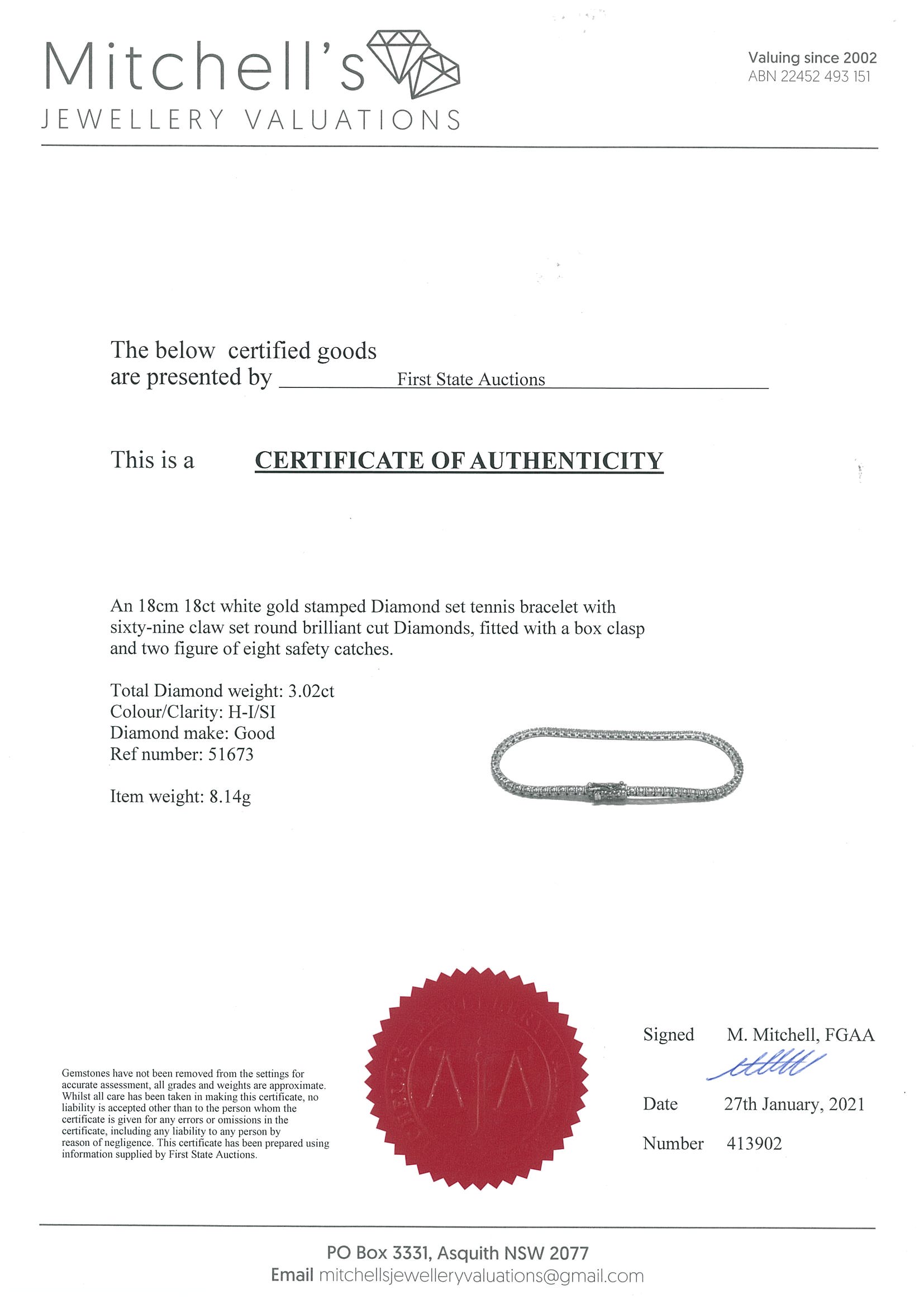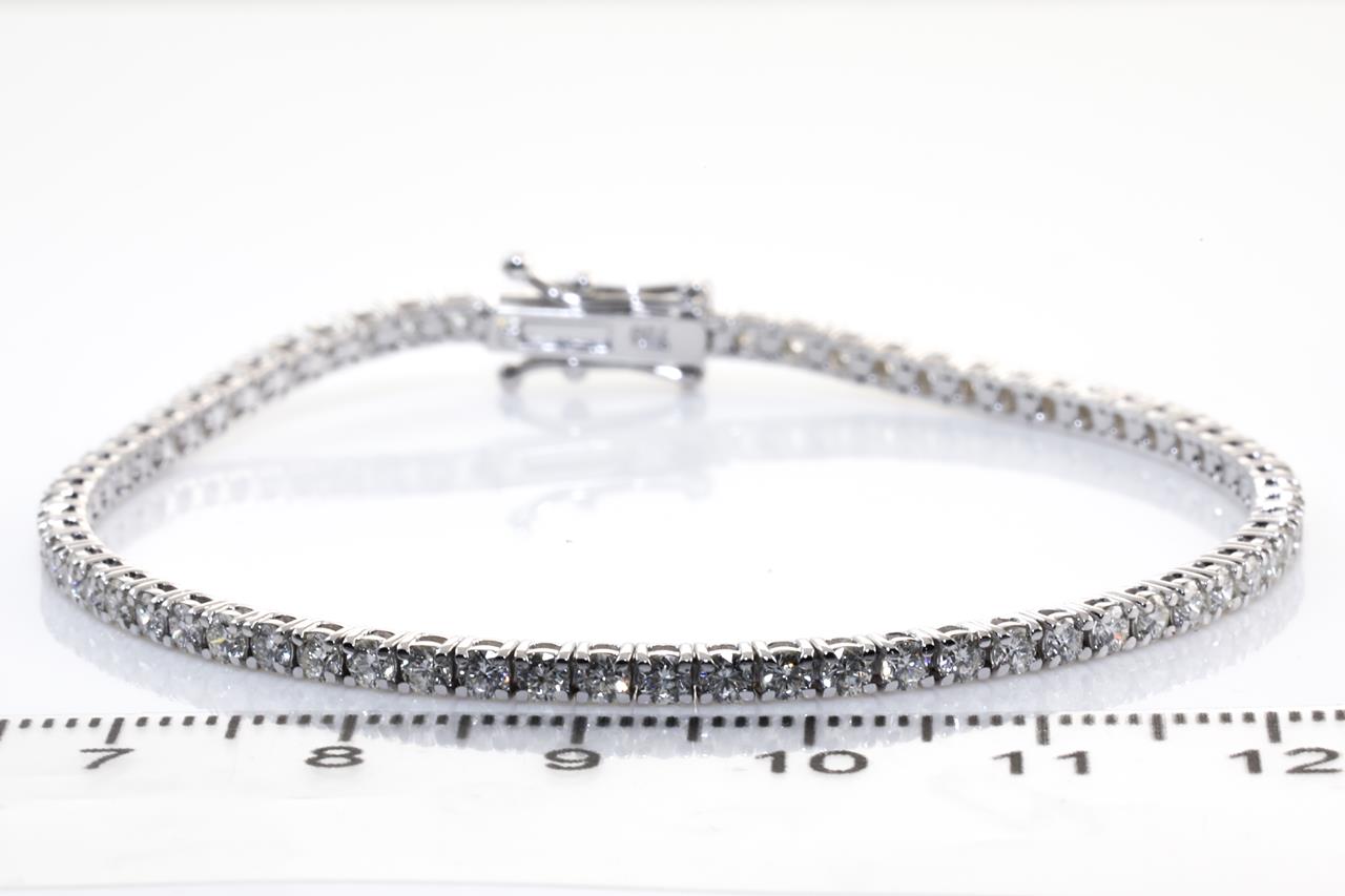 Diamond tennis bracelet with 69 round Diamonds totalling 3.02cts (Estimated grading: H-I SI). 18ct white gold. Length: 18cm Weight: 8.14g. With Certificate #413902.(New)