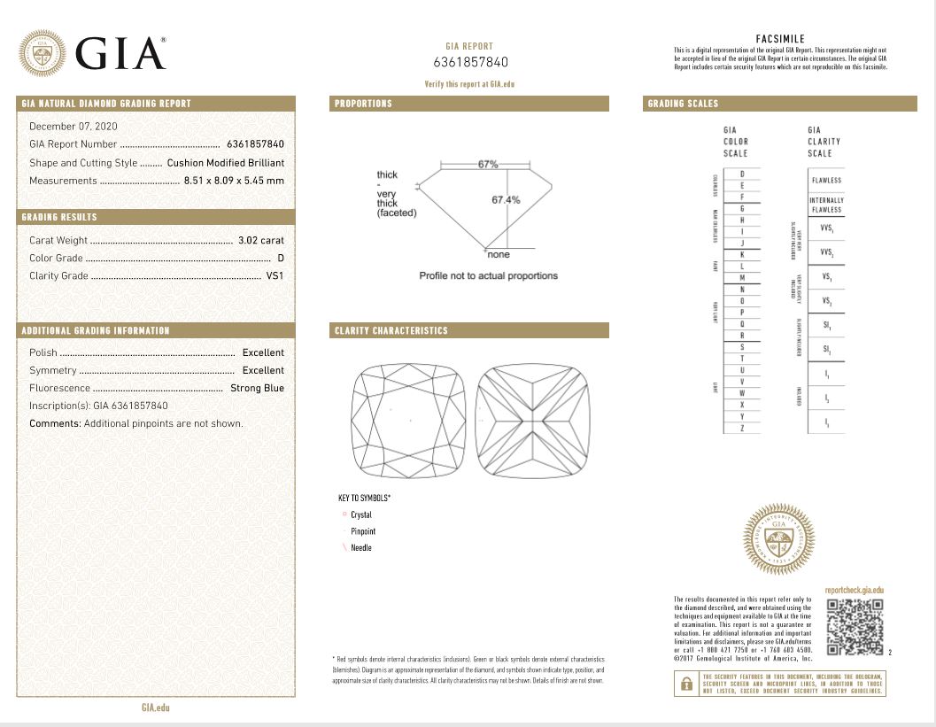 A loose Cushion Cut Diamond of 3.02ct (with GIA report graded as D VS1#6361857840). (New)