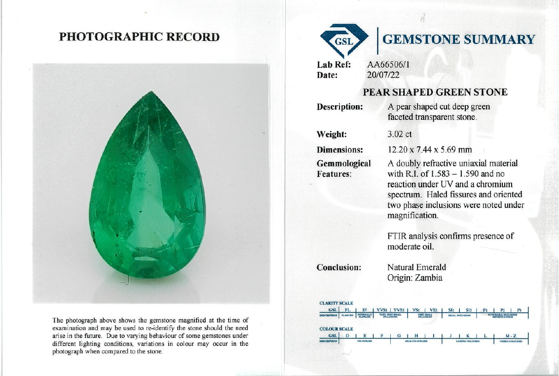 A loose pear shape Zambian Emerald of 3.02ct (With GSL summary report #AA66506/1). (As new)