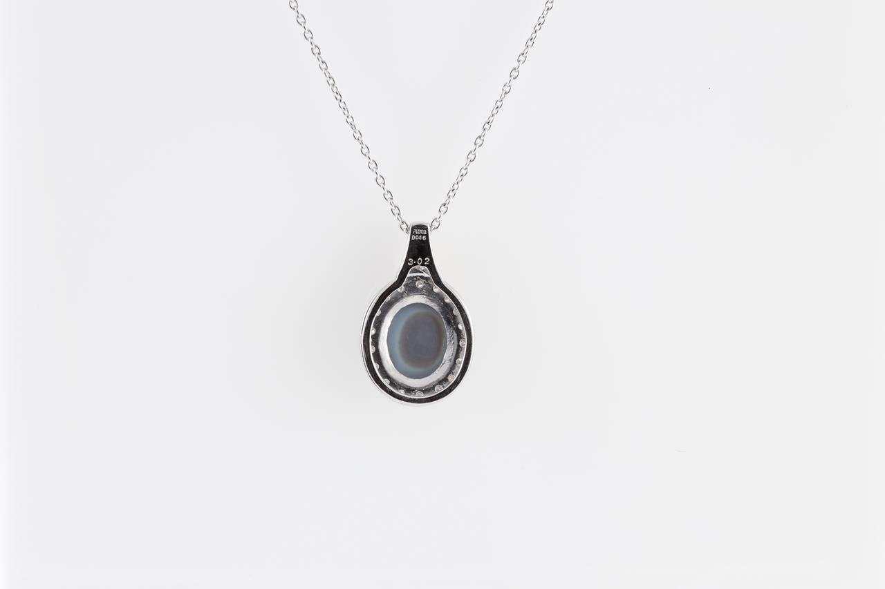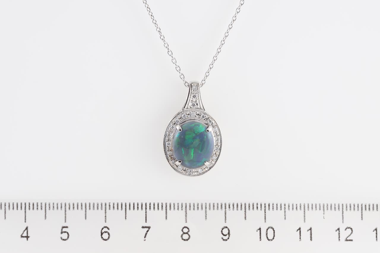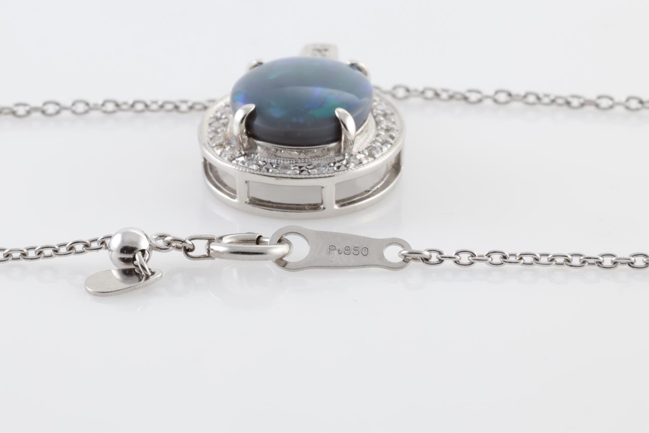 Opal and Diamond pendant with oval black Opal of 3.02ct and Diamonds totalling 0.16cts. Platinum with platinum 45cm adjustable chain. Weight: 8.11g (Pre-owned)