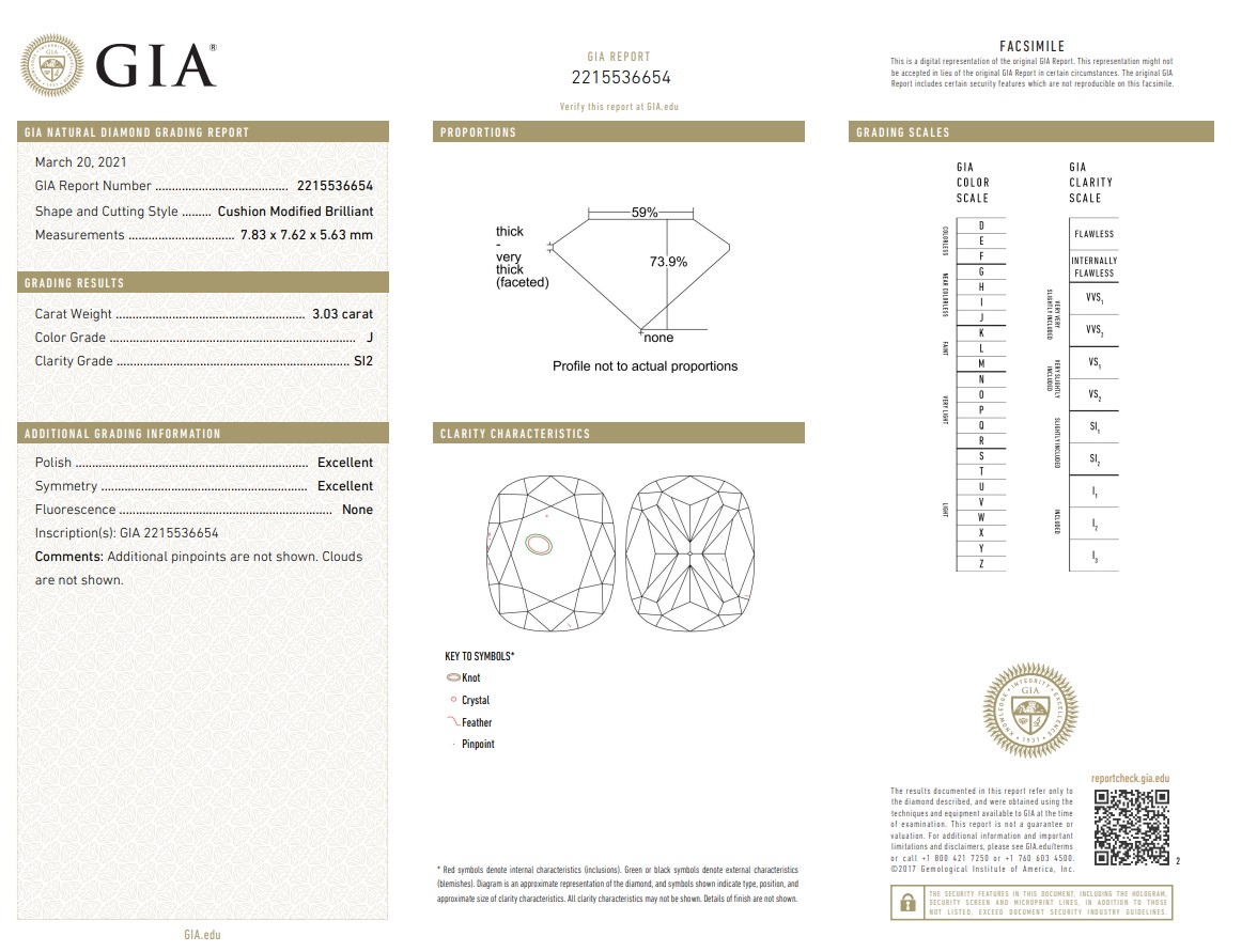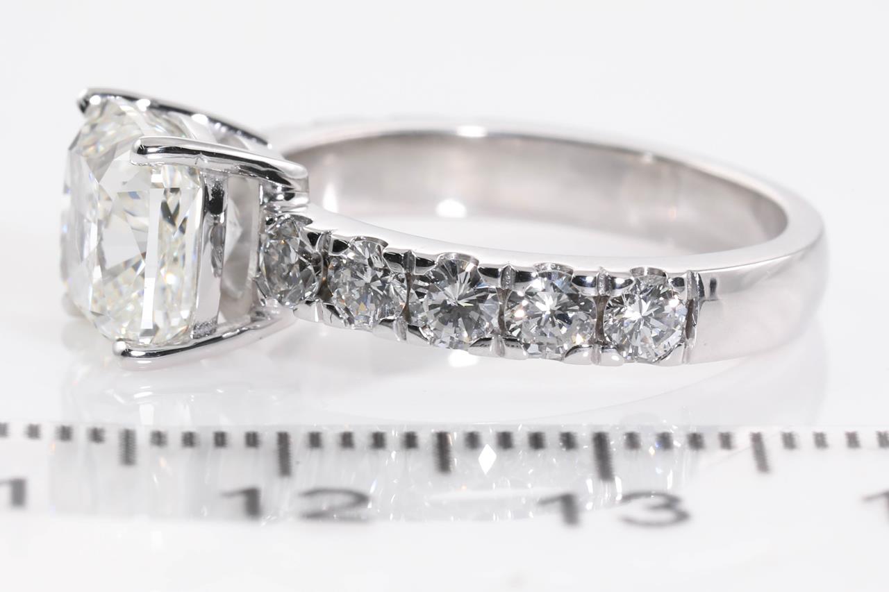 Diamond ring with a centre cushion cut Diamond of 3.03ct (with GIA report graded as J SI2 #2215536654) and 10 shoulder Diamonds totalling 0.95cts (Estimated grading: G-H VS-SI) . 18ct white gold. Ring size L. Weight: 6g. (New)