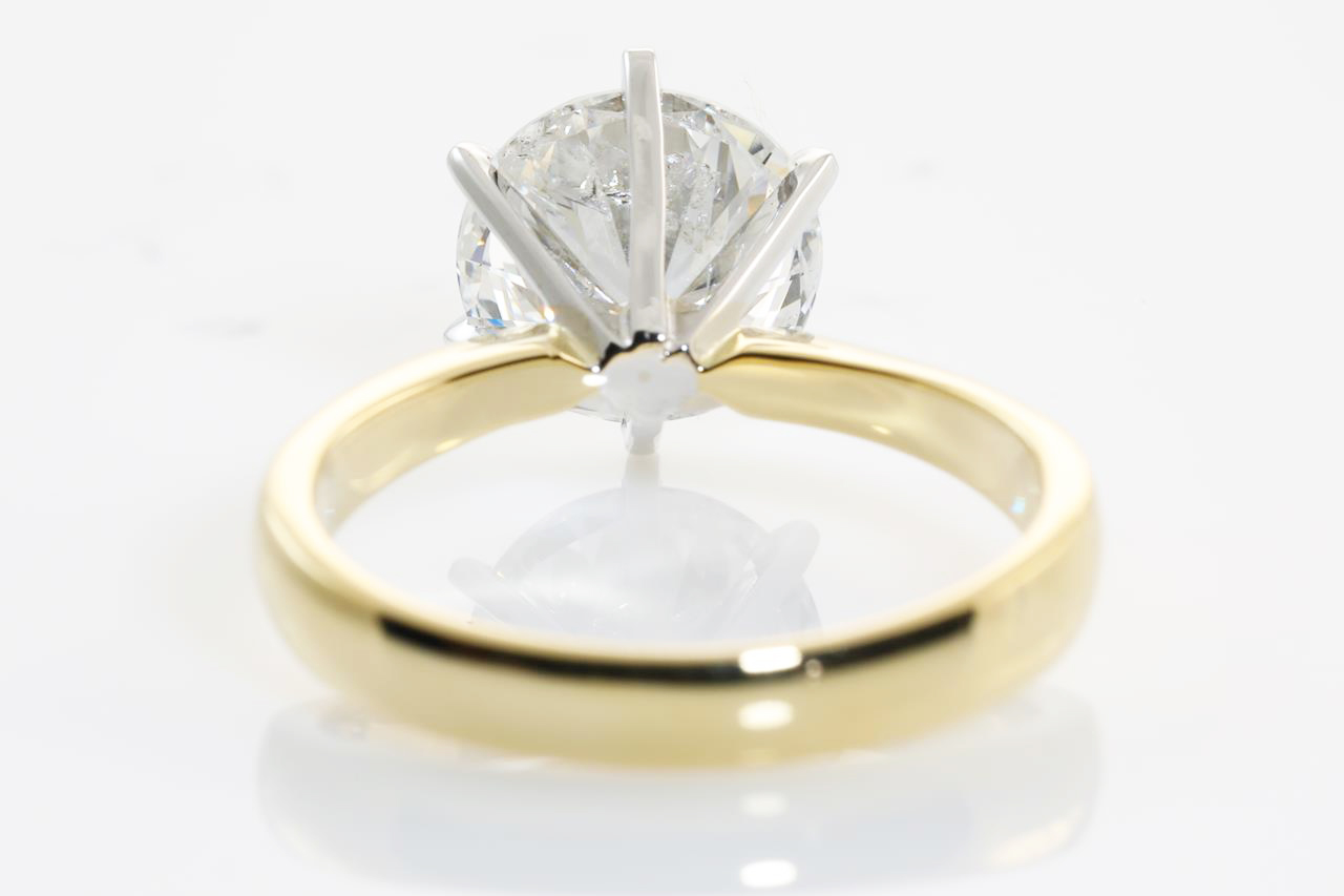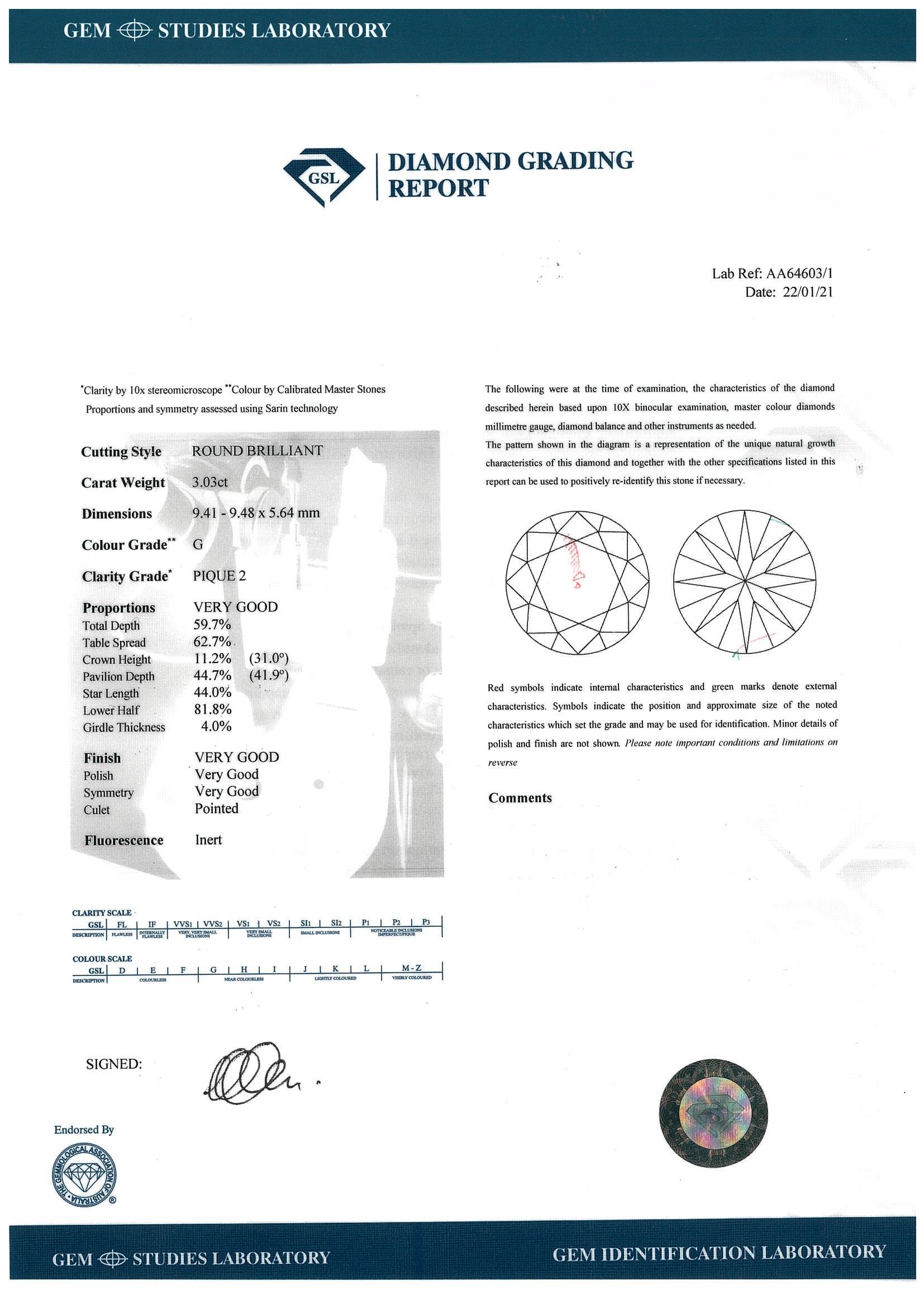 Diamond solitaire ring with Round Brilliant Cut Diamond of 3.03ct (with GSL report graded as G P2 #AA64603/1). 18ct yellow and white gold. Ring size O. Weight: 5.2g (New)