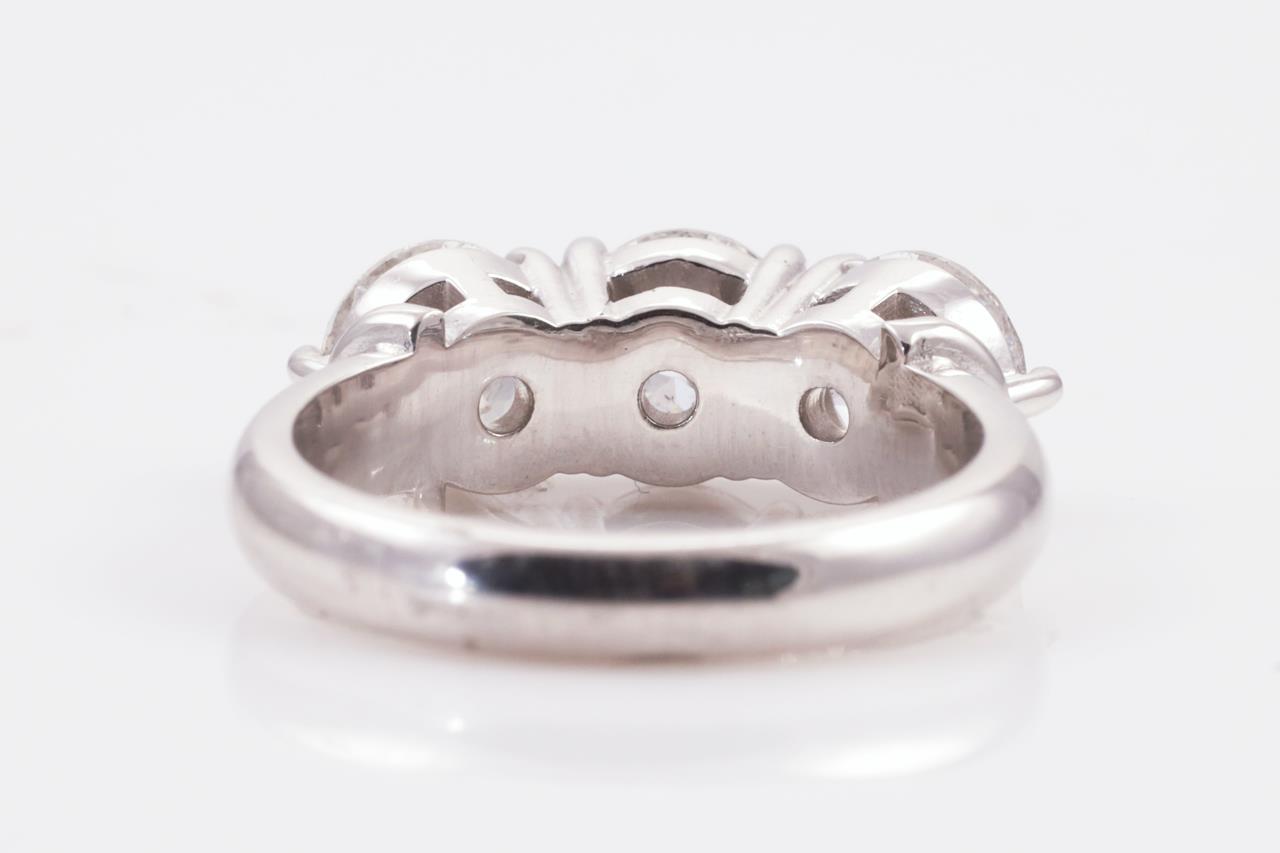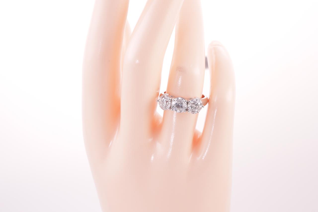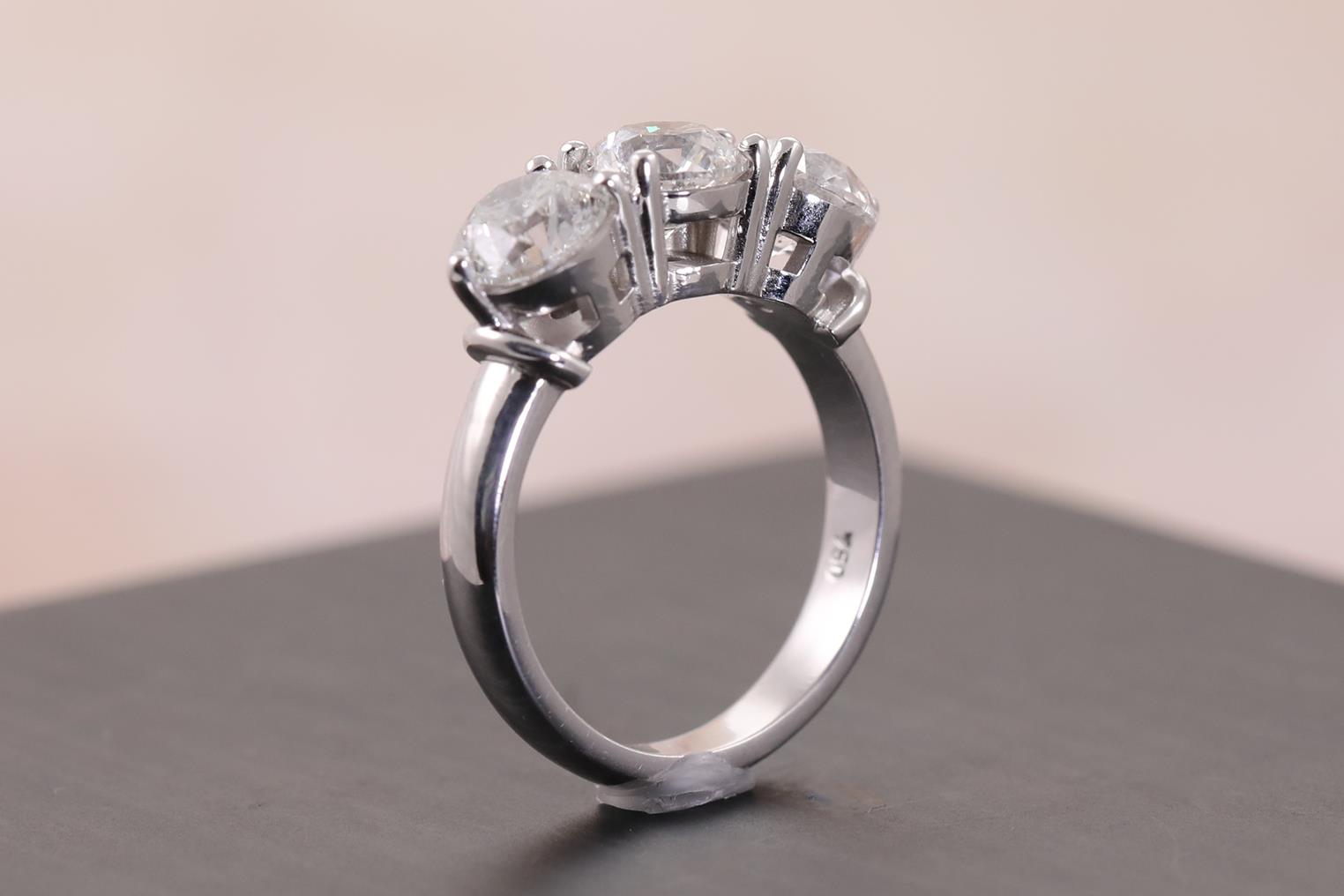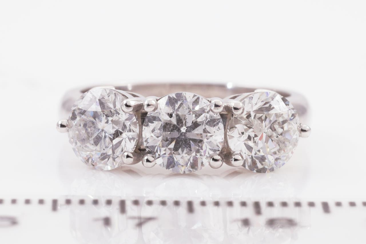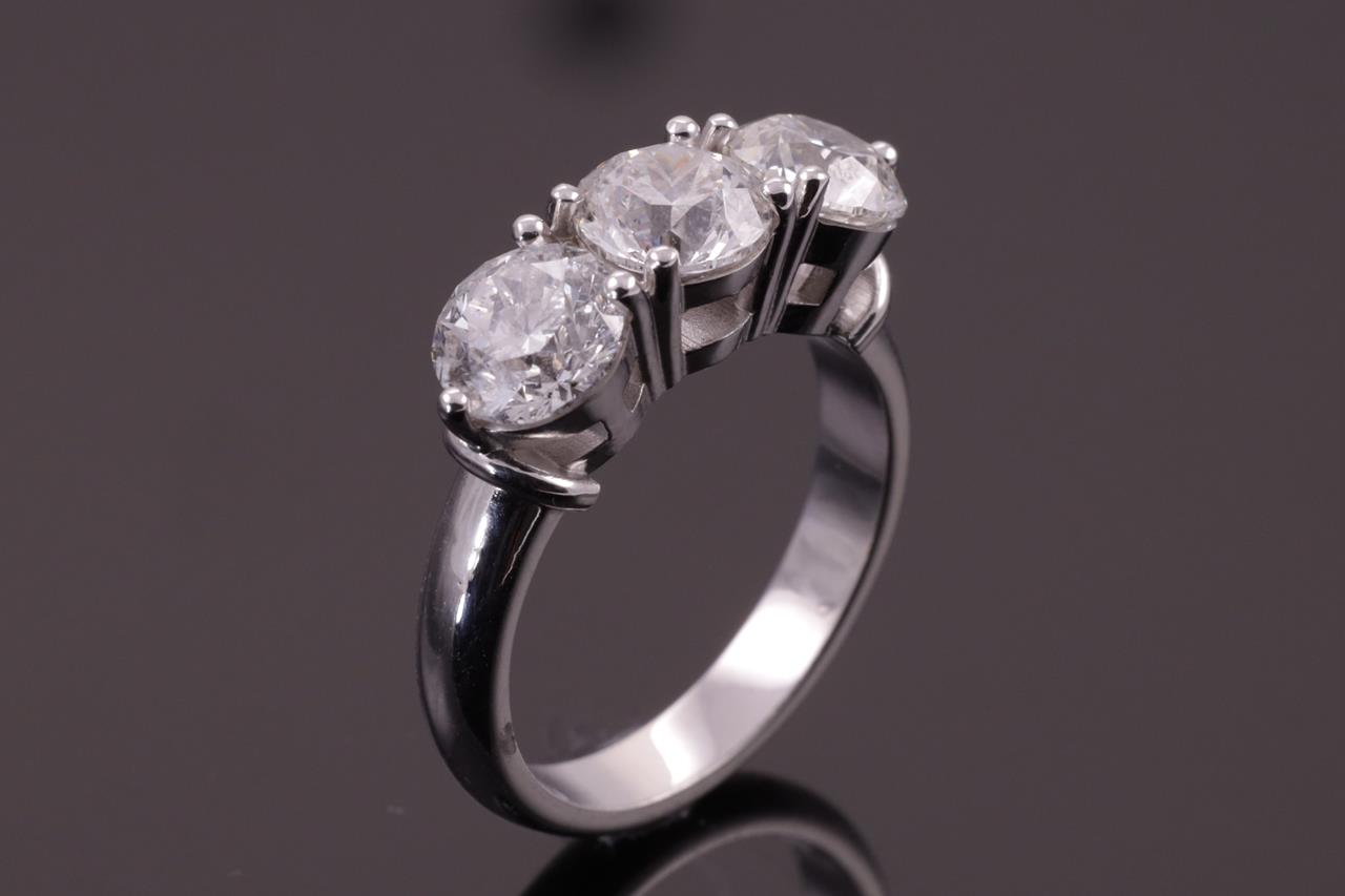 Diamond Trilogy ring with 3 round brilliant diamonds totalling 3.03cts (with GSL summary reports graded as G P2 GSL031221-4, GSL031221-6, H P2 GSL031221-5). 18ct white gold. Ring size L. Weight: 7g. (New)