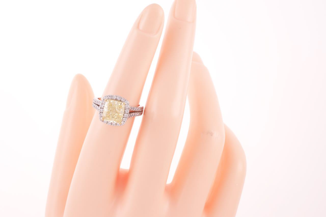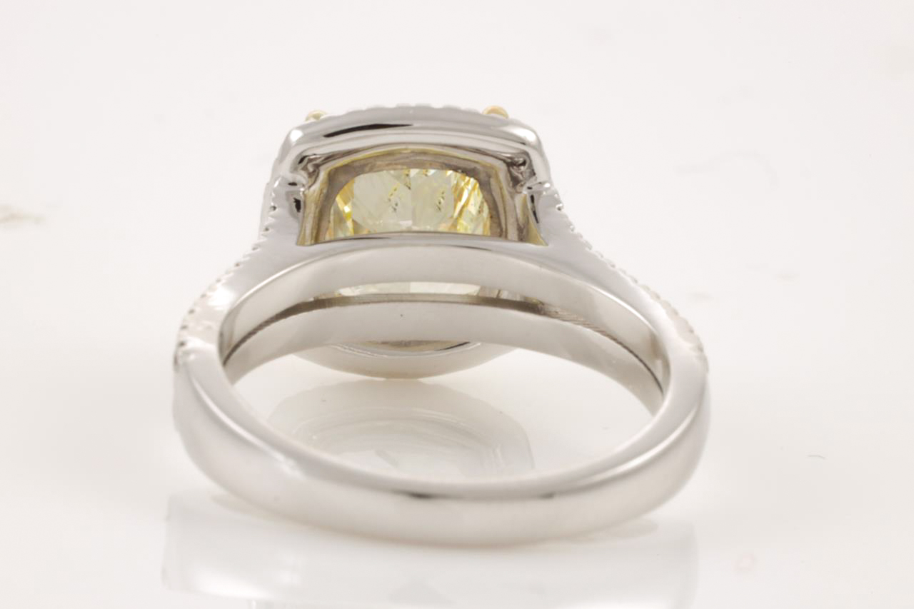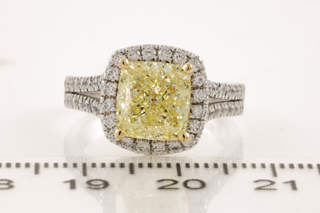 Diamond ring with a centre cushion cut Diamond of 3.01ct (with GIA report graded as Fancy Yellow Even SI2 #6213625878) and diamonds 0.58cts (Estimated grading: F-G SI). 18ct yellow and white gold. Ring size L. Weight: 6.6g. (New)
