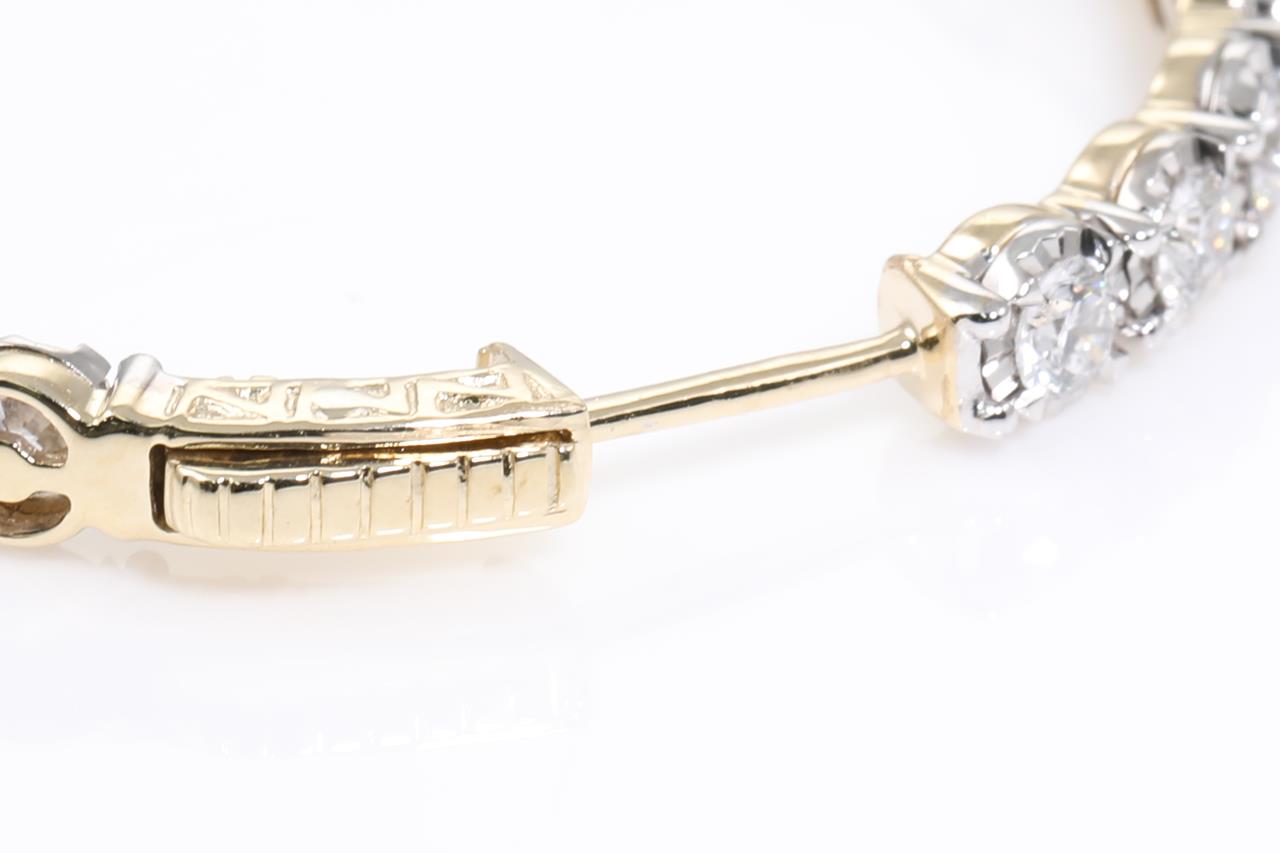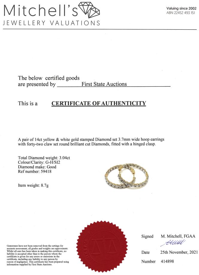 Diamond hoop earrings with round Diamonds totalling 3.04cts (Estimated grading: G-H SI2). 14ct yellow and white gold. Weight: 8.7g. With certificate #414898. (New)