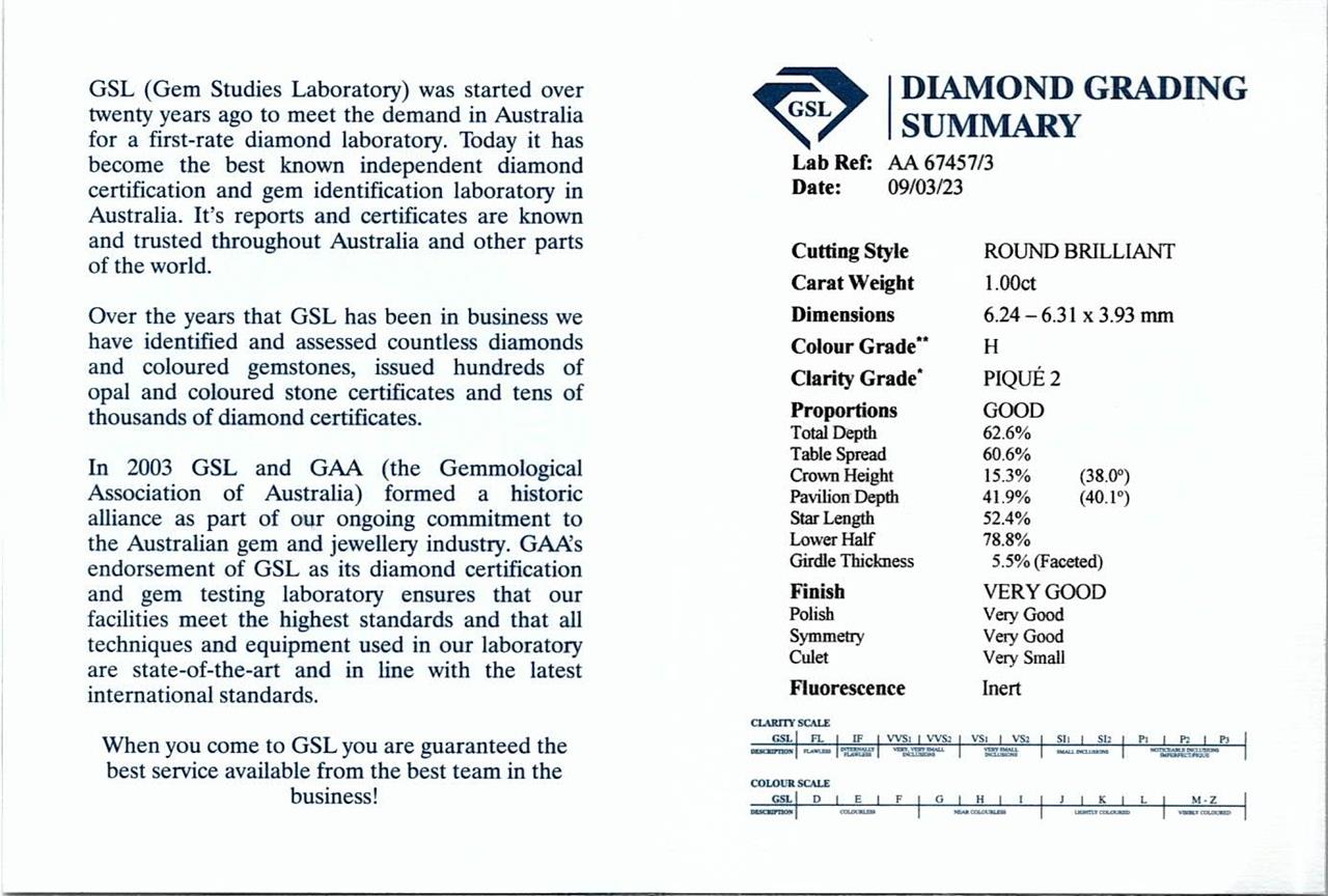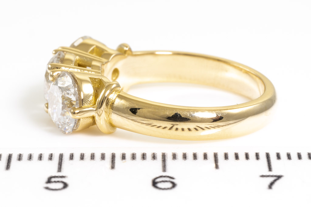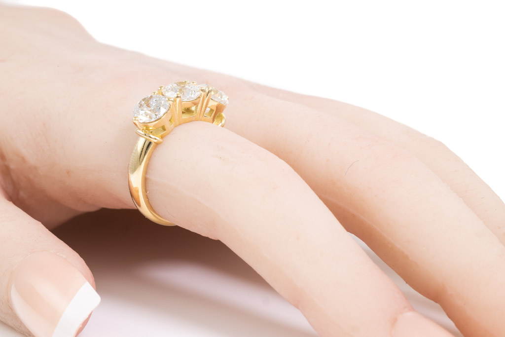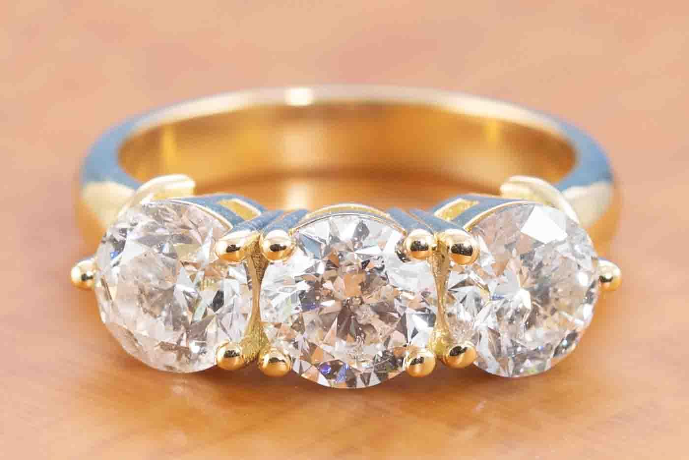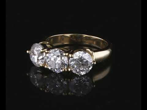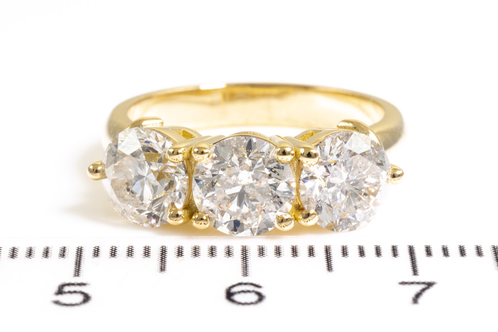 Diamond Trilogy ring with 3 round brilliant cut diamonds totalling 3.05cts (with GSL Memos graded as H P2 #AA67457/3, AA67457/2; G P2 #AA67457/1). 18ct yellow gold. Ring size: L. Weight: 6.8g. (New)