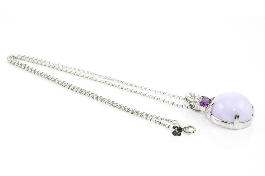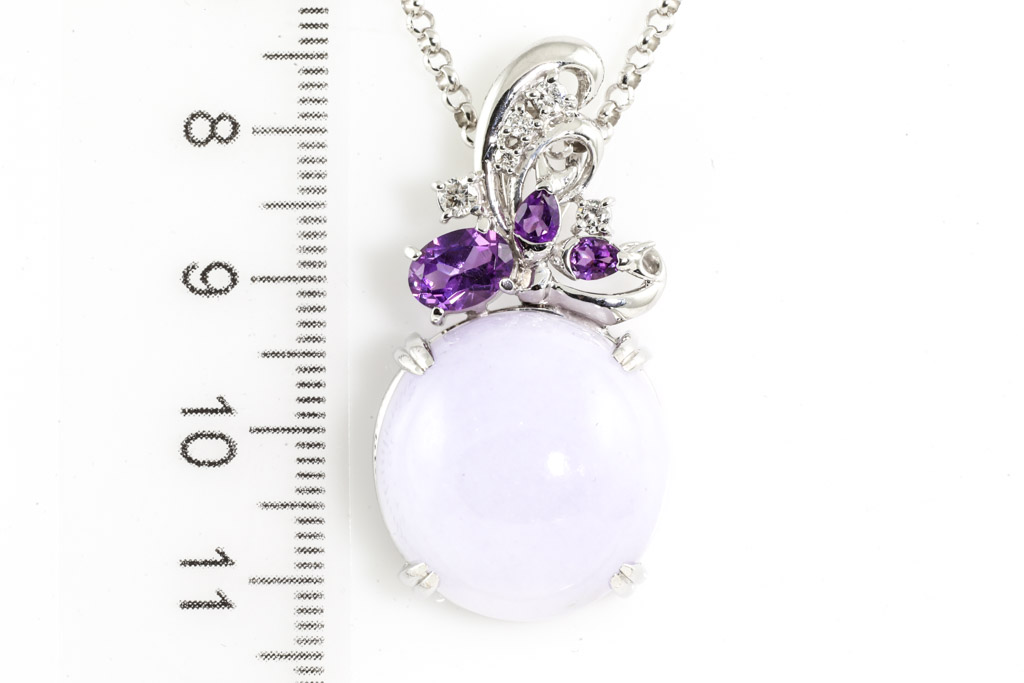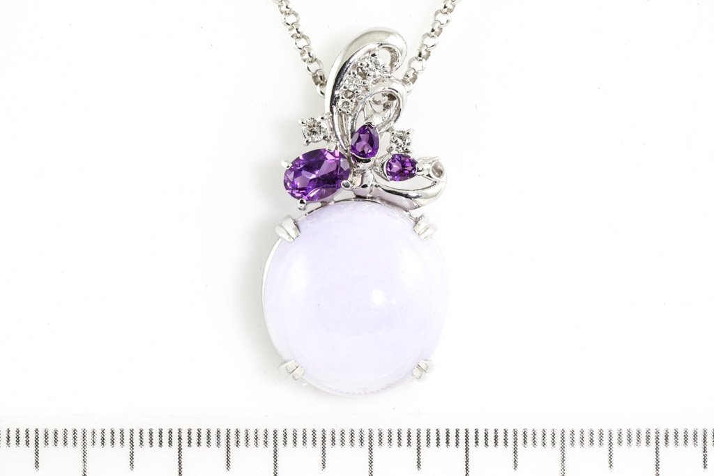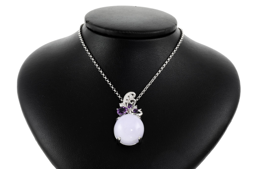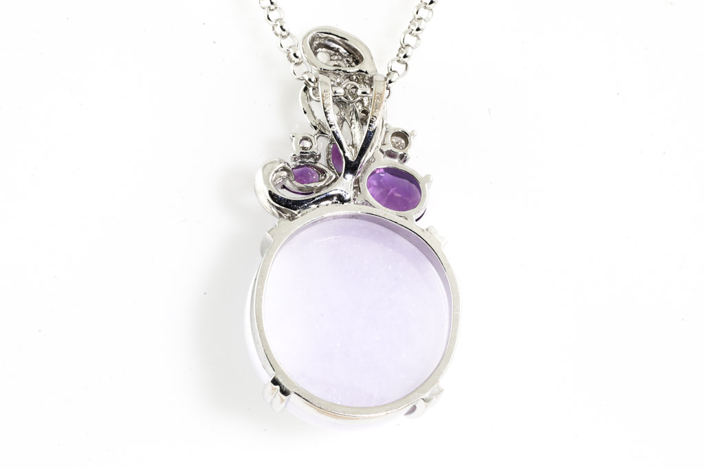 Jade and Diamond pendant with cabochon cut natural Lavender Jadeite Jade of 30.60ct, pear shape & oval shape Amethysts totalling 1.00cts and round Diamonds totalling 0.18cts. 18ct white gold with 49cm 18ct white gold adjustable chain. Weight: 21.7g. With certificate #416899. (Pre-owned)