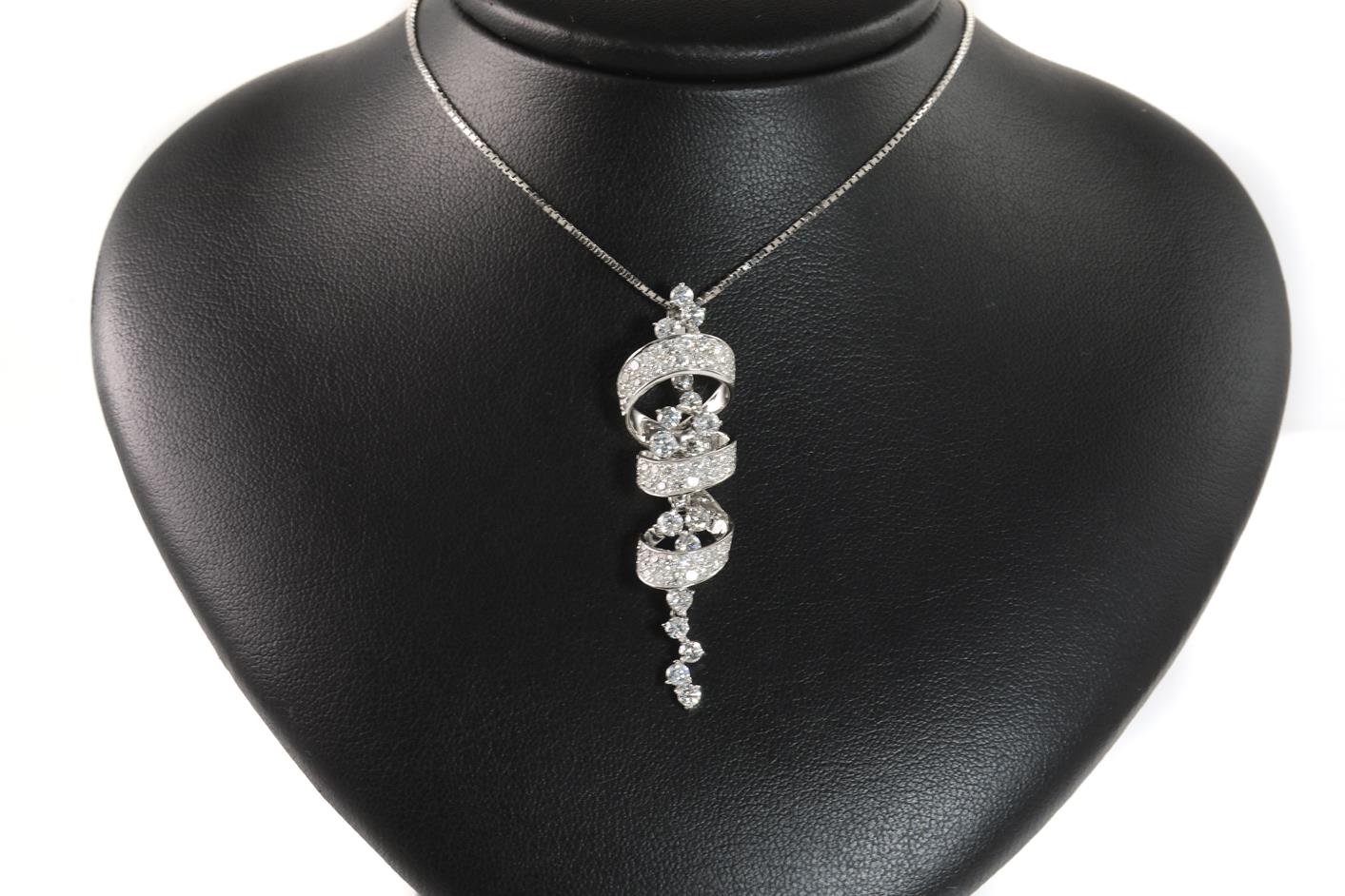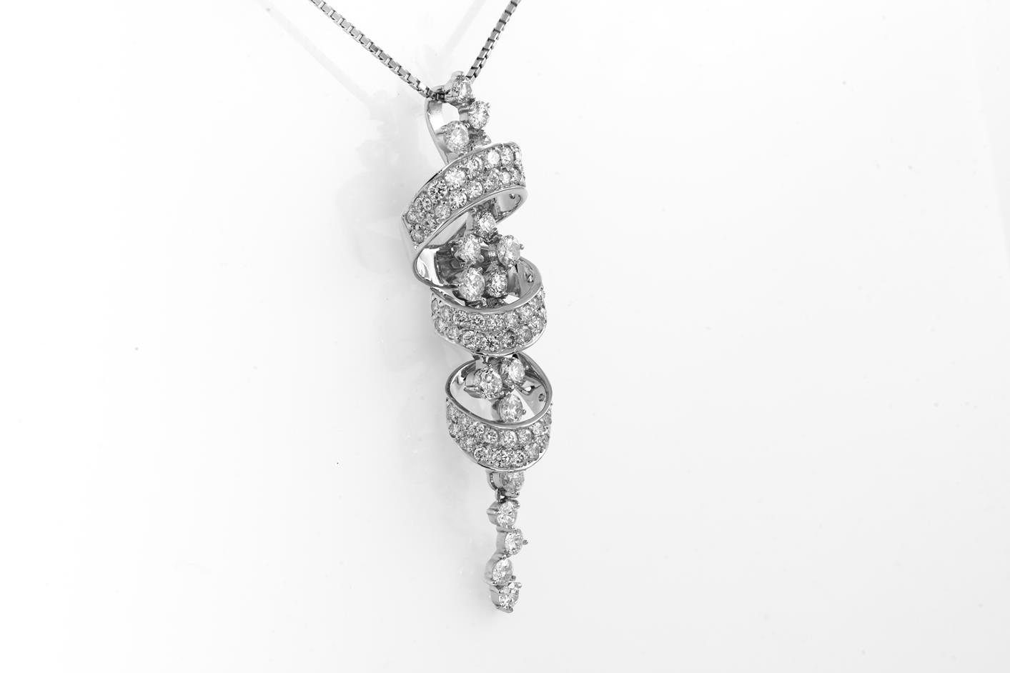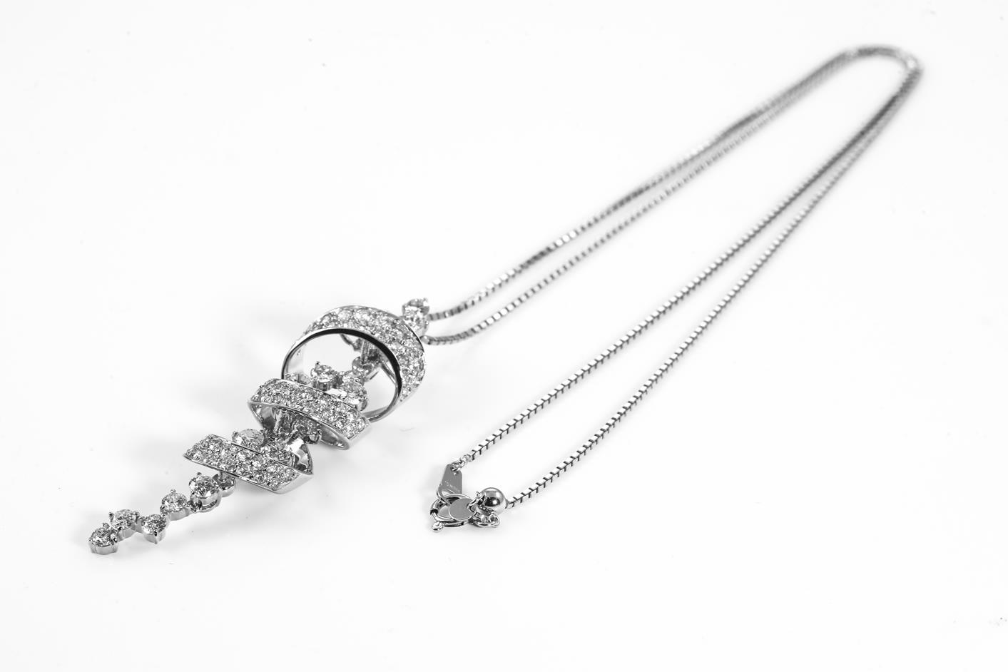 Diamond dress pendant with round Diamonds totalling 3.06cts (Estimated grading: G SI). 18ct white gold with adjustable 44cm 18ct white gold chain. Weight: 10.4g. With certificate #415674. (Pre-owned)