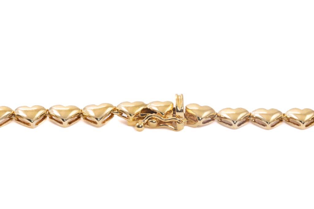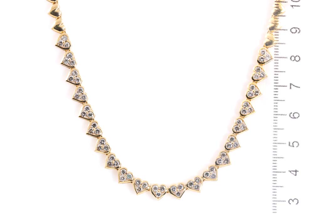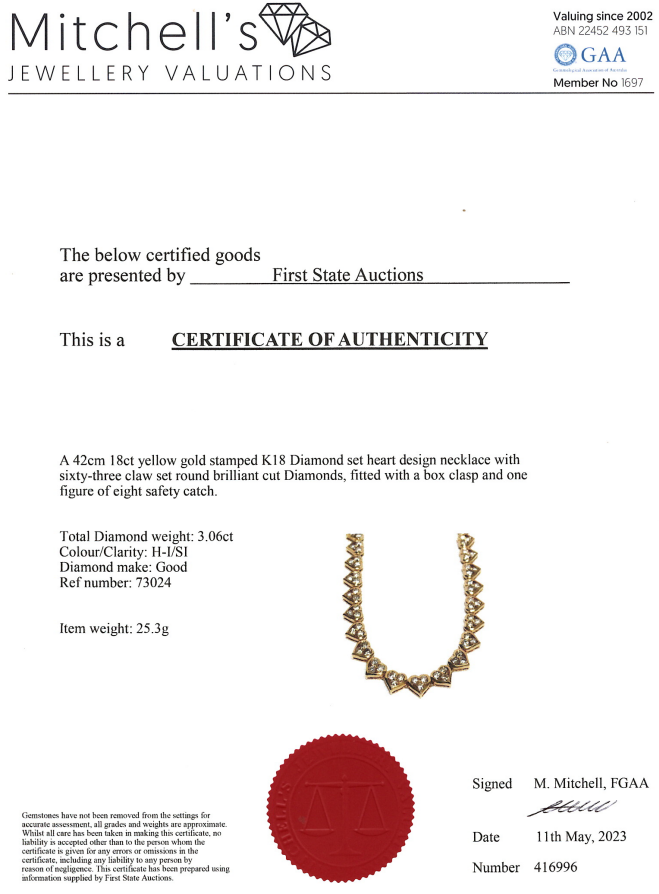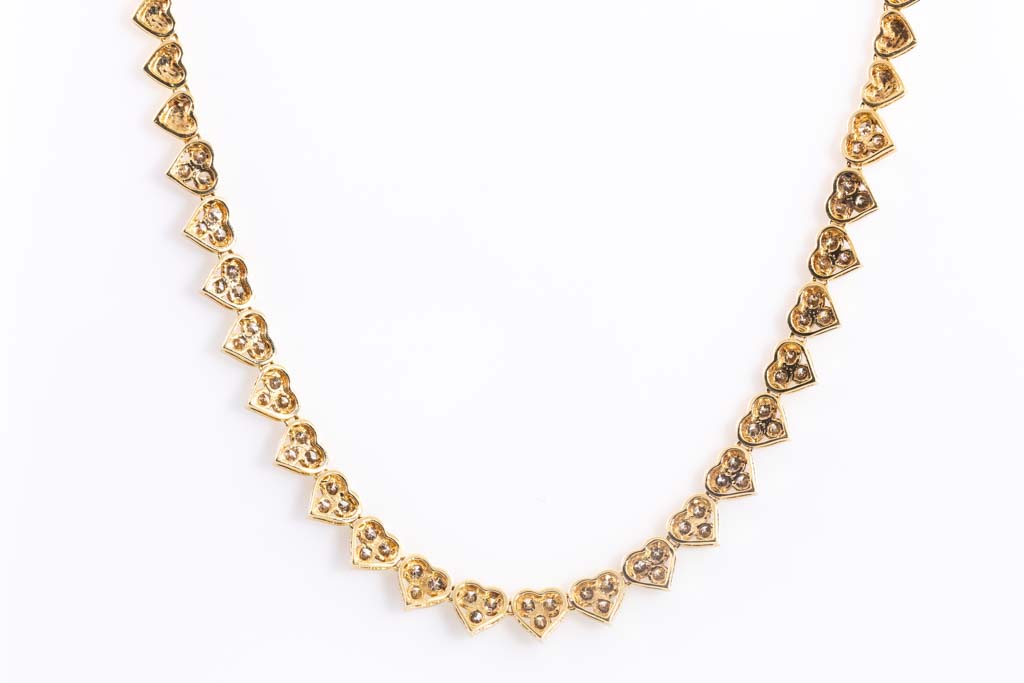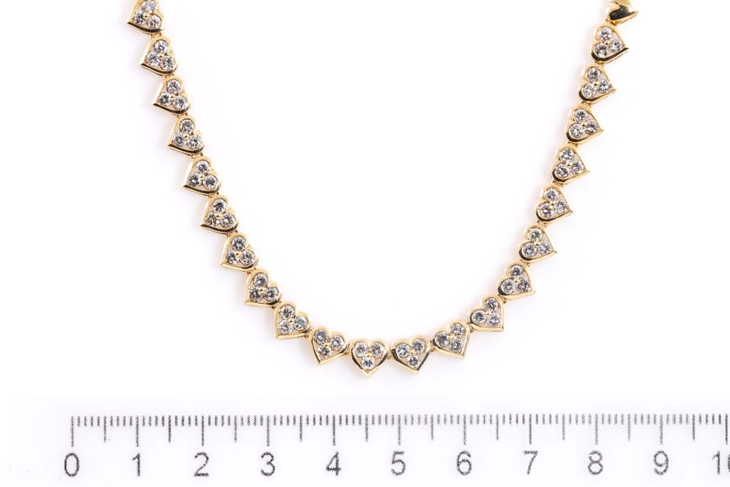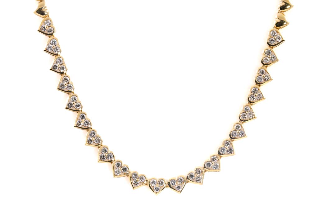 Diamond necklace, heart design links set with 63 round Diamonds totalling 3.06cts (Estimated grading: H-I SI). 18ct yellow gold. Length: 42cm. Weight: 25.3g. With Certificate #416996. (Pre-owned)