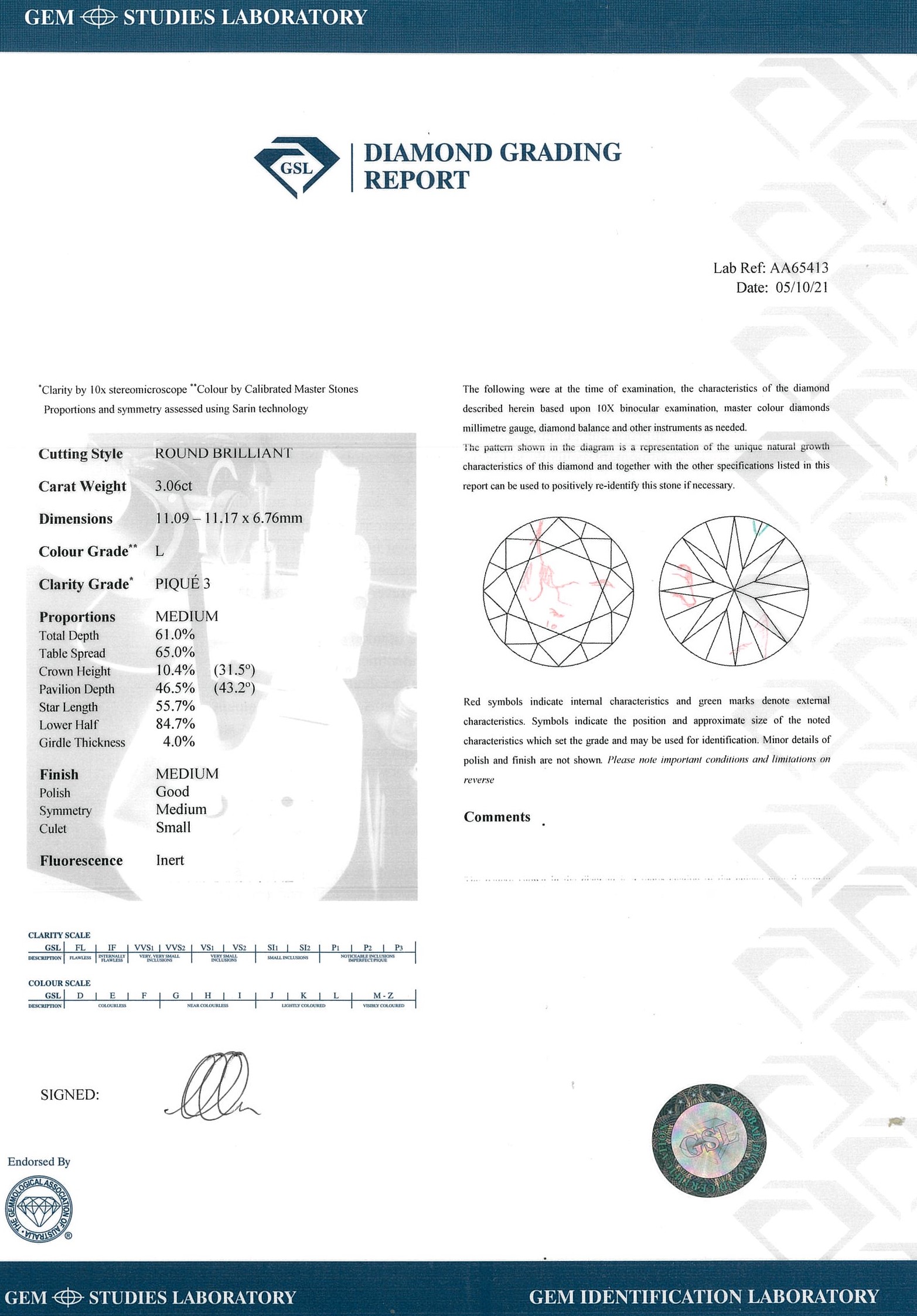 Diamond solitaire pendant with a round brilliant cut Diamond of 3.06ct (With GSL report graded as L P3 #AA65413). Platinum and 18ct white gold with 18ct gold 46cm adjustable chain. Weight: 9.2g. (Pre-owned)