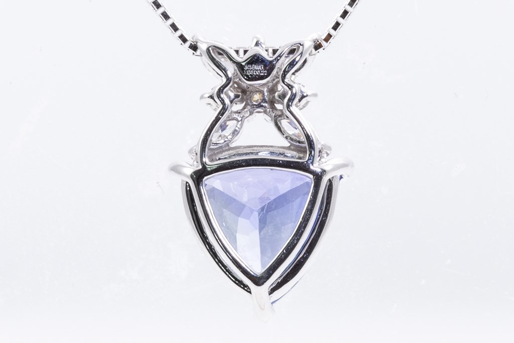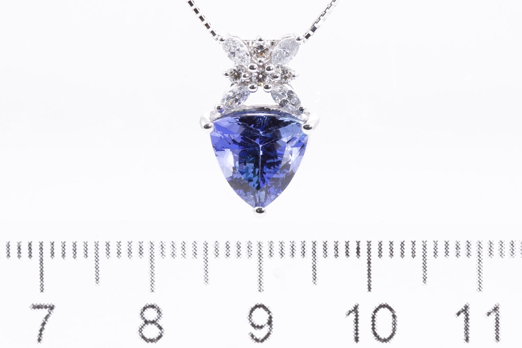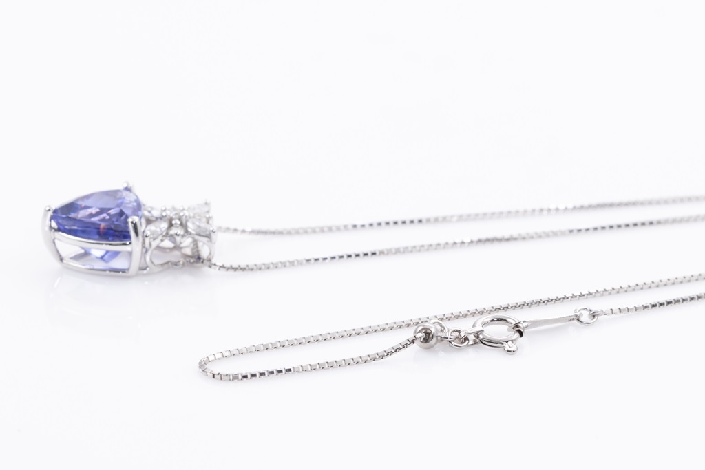Tanzanite and Diamond pendant with trilliant cut Tanzanite of 3.08ct and round & marquise cut Diamonds totalling 0.22cts. 18ct white gold with 44cm 18ct white gold adjustable chain. Weight: 4.1g. (Pre-owned)