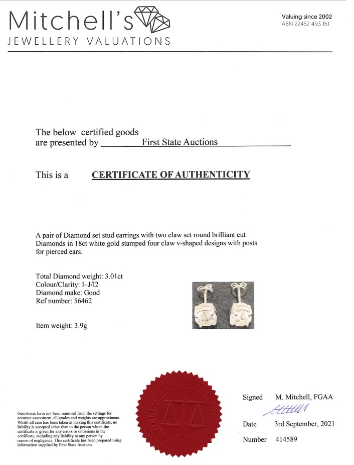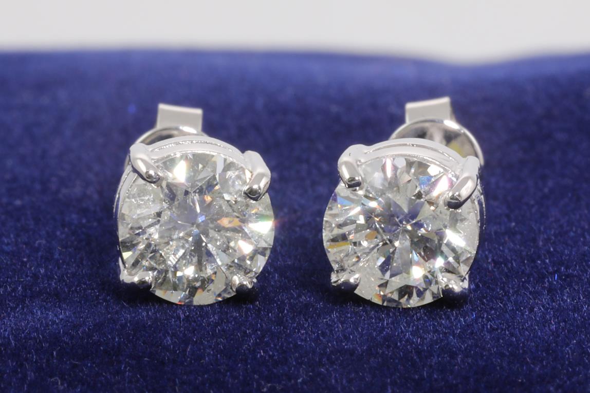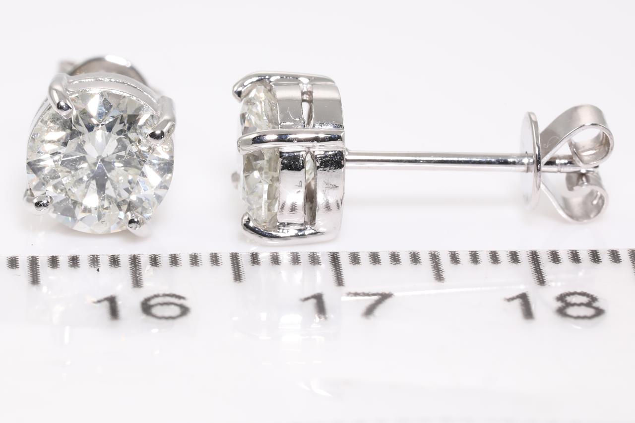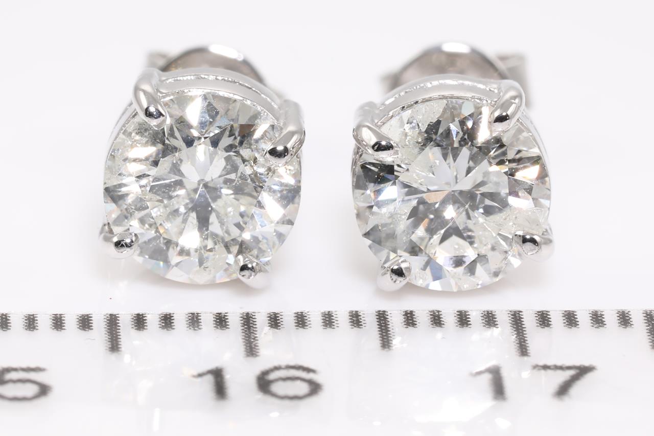 Diamond stud earrings with 2 round brilliant cut Diamonds totalling 3.01cts (Estimated grading: I-J P2). 18ct white gold. Weight: 3.9g. With certificate #414589. (New)