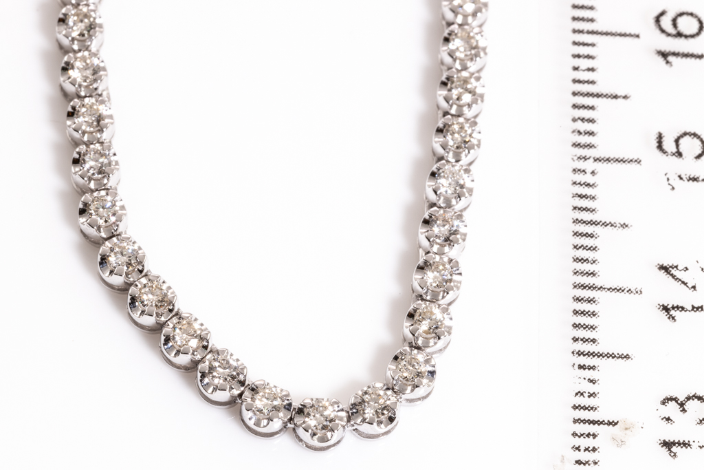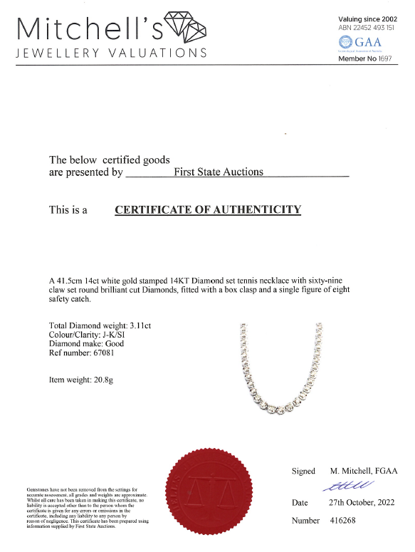 Diamond tennis necklace with 69 round Diamonds totalling 3.11cts (Estimated grading: J-K SI). Length: 41.5cm. 14ct white gold. Weight: 20.8g. With Certificate #416268. (New)