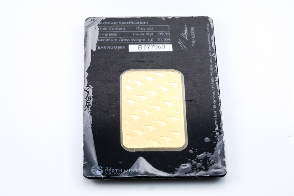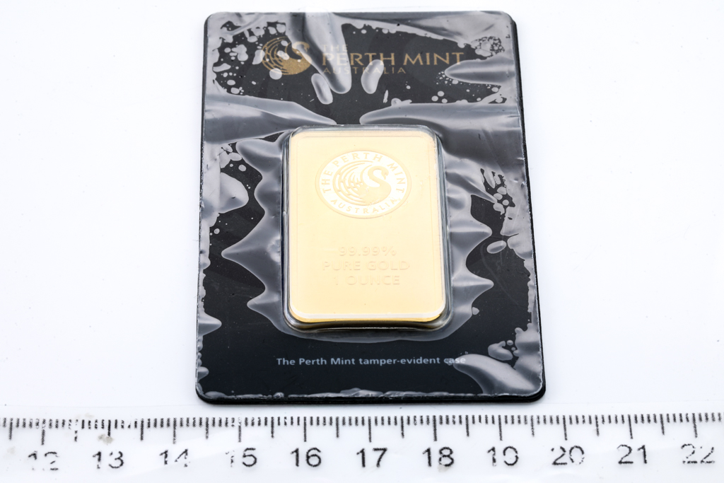 A Perth Mint Fine Gold Bar. Weight: 1 ounce: 31.1g. Serial number B077968. ***Gold bullion attracts no GST and no Buyers Premium. Available for shipping within Australia only***