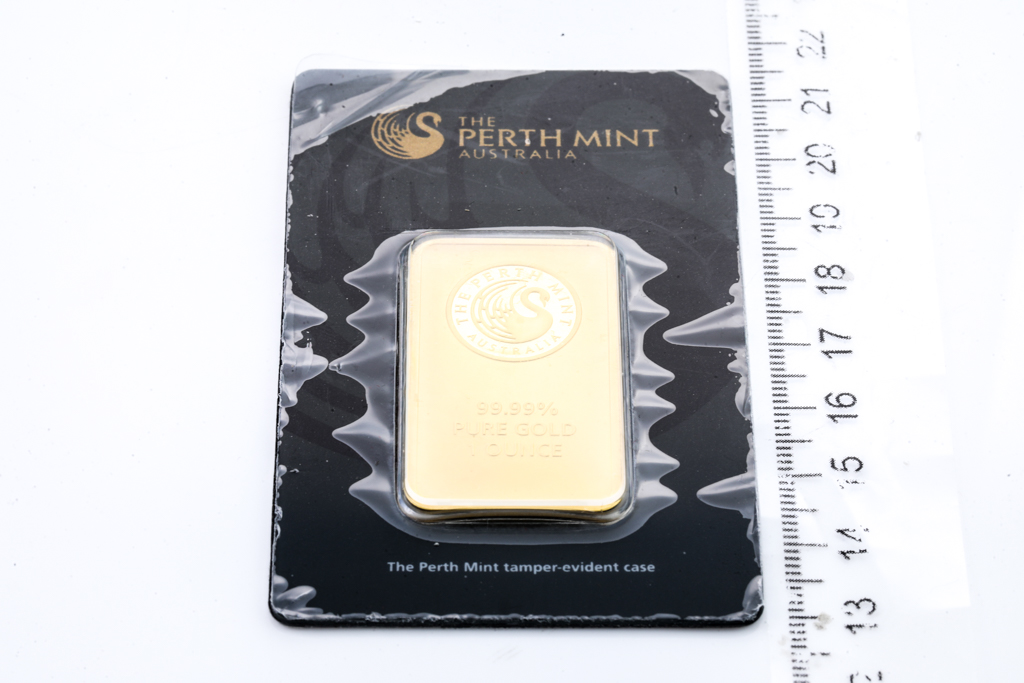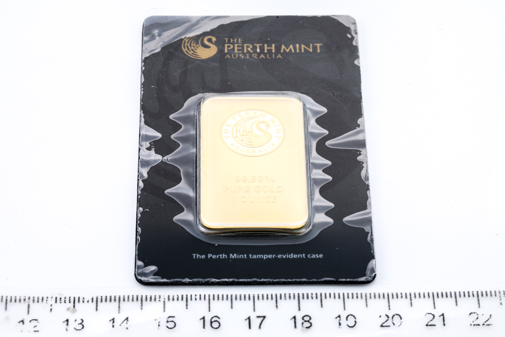A Perth Mint Fine Gold Bar. Weight: 1 ounce: 31.1g. Serial number B089535. ***Gold bullion attracts no GST and no Buyers Premium. Available for shipping within Australia only***