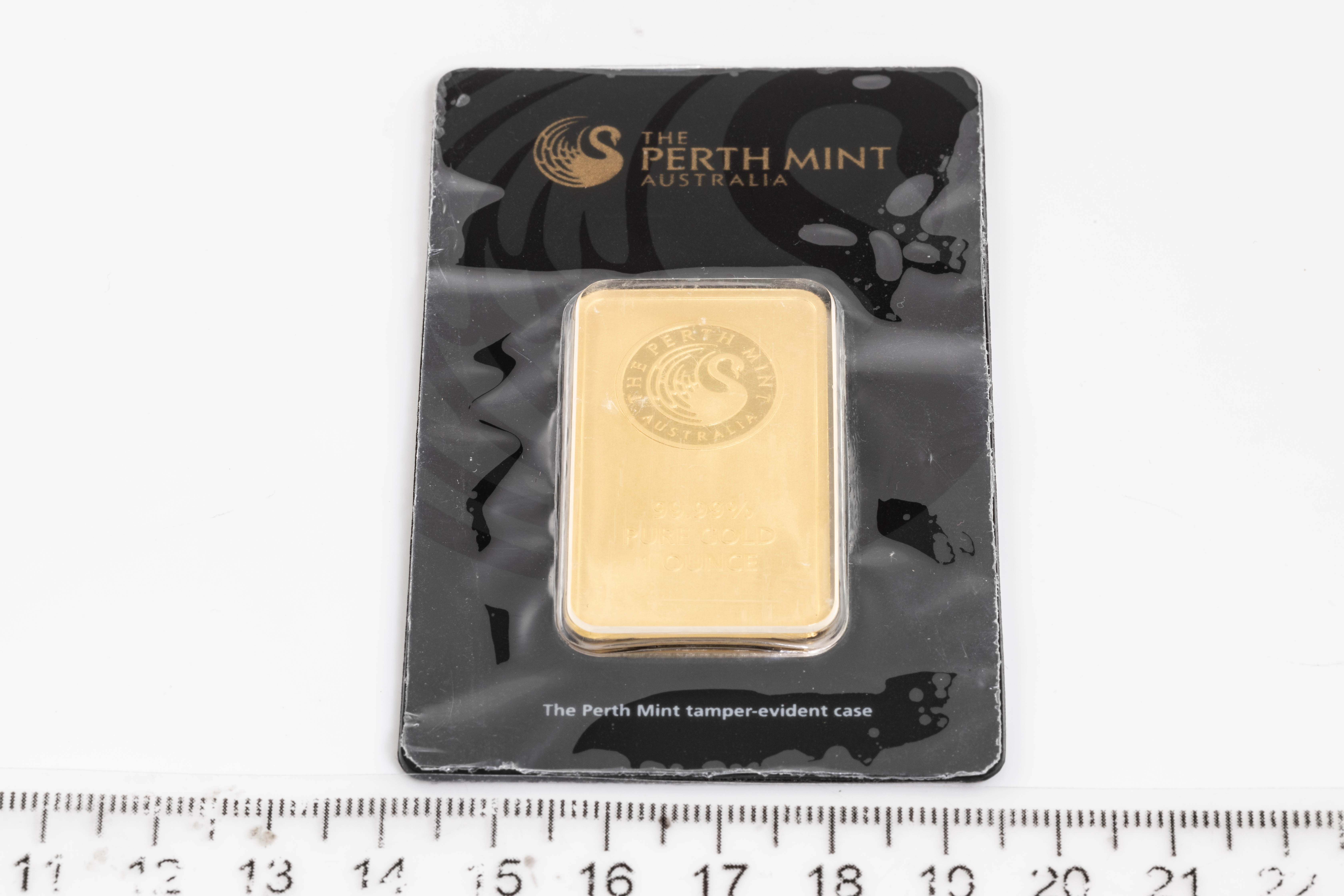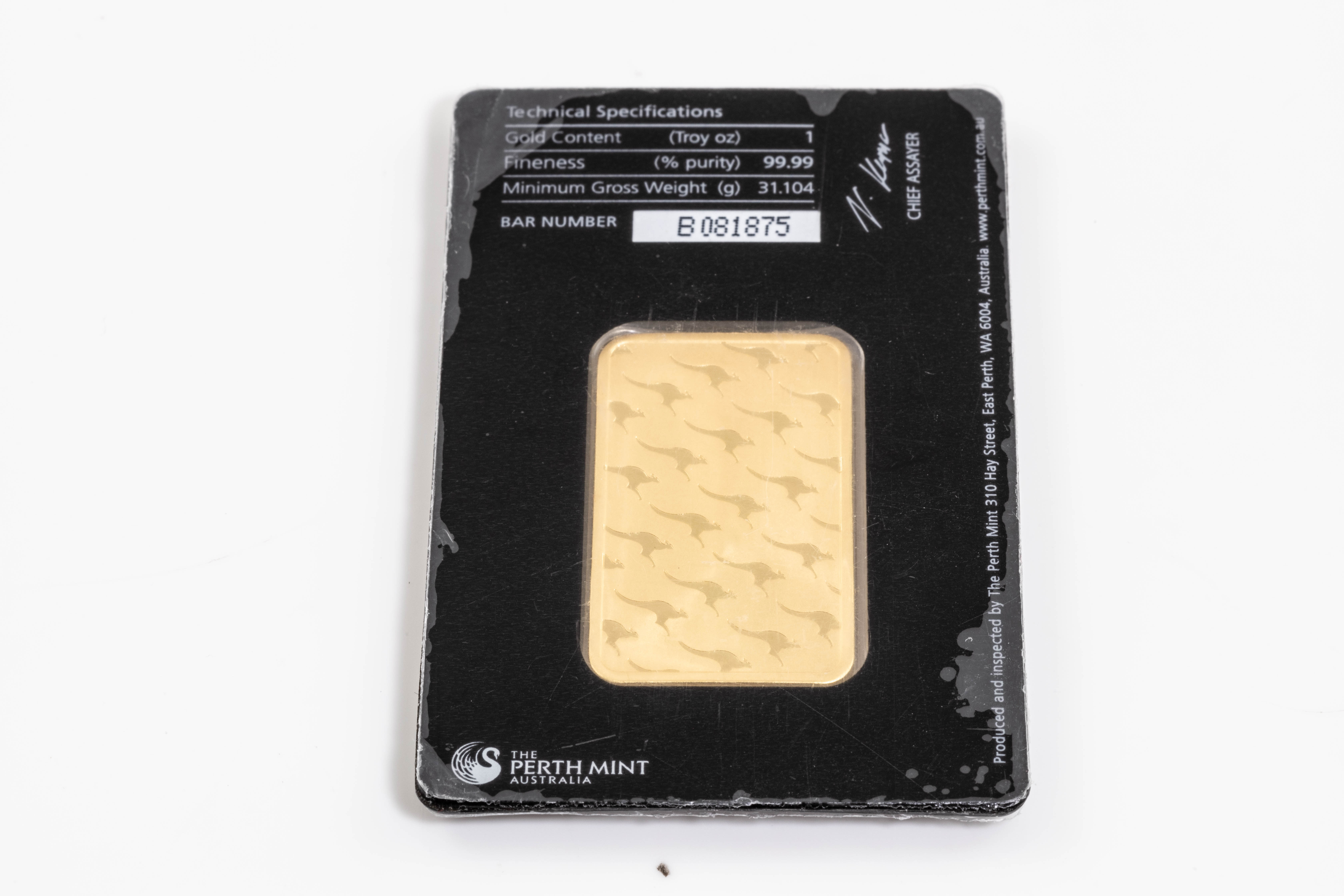 A Perth Mint Fine Gold Bar. Weight: 1 ounce: 31.1g. Serial number B081875. ***Gold bullion attracts no GST and no Buyers Premium. Available for shipping within Australia only***