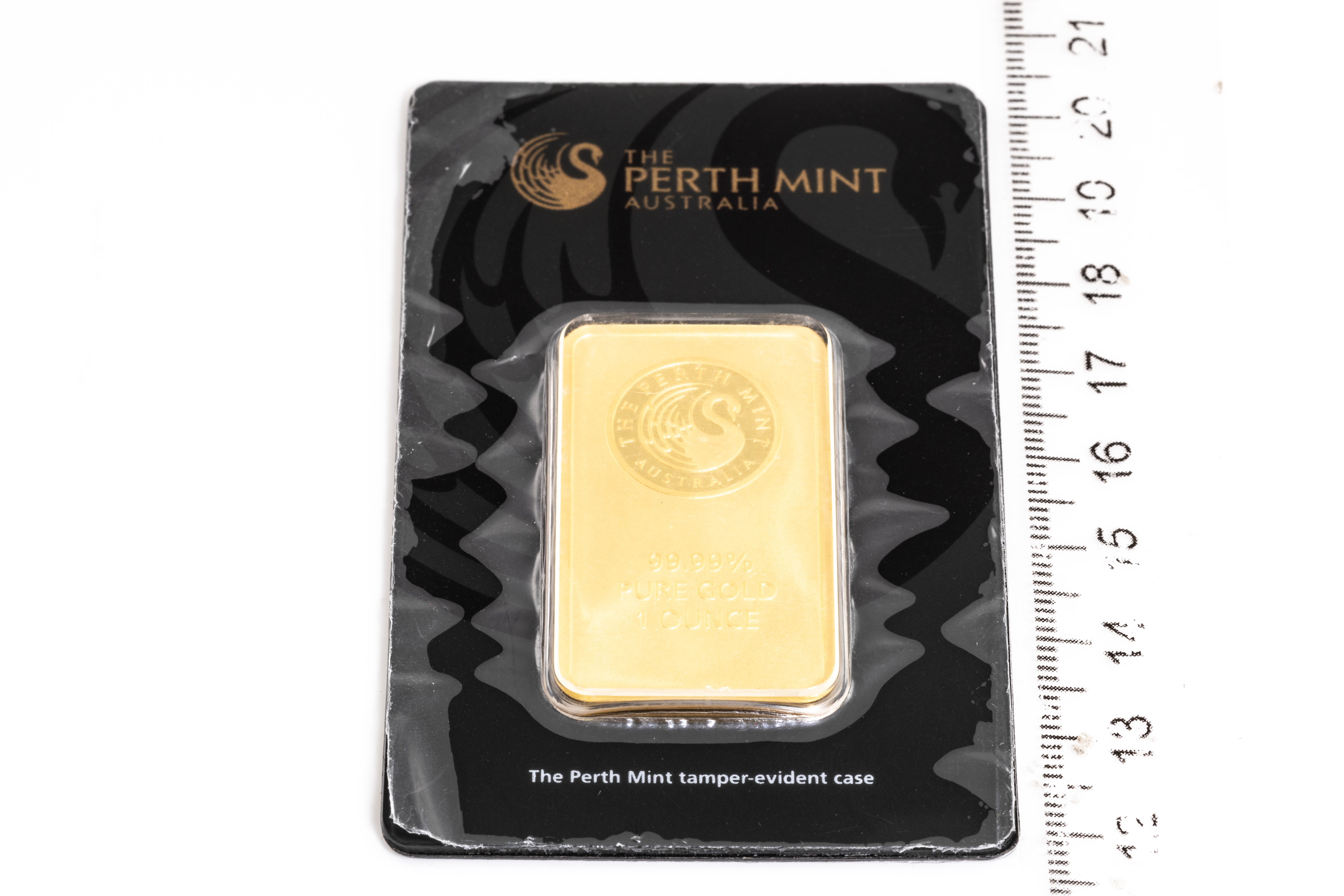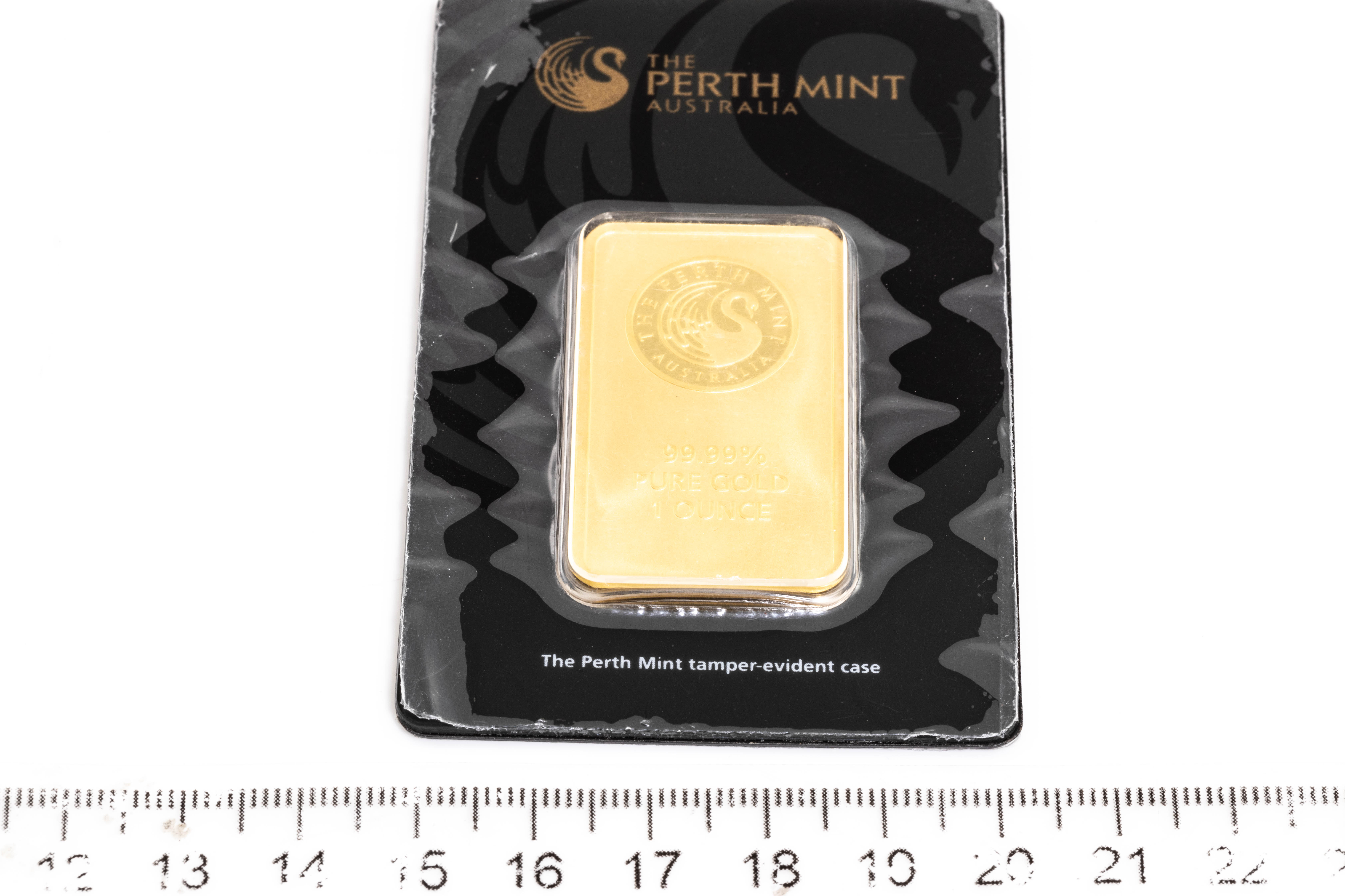 A Perth Mint Fine Gold Bar. Weight: 1 ounce: 31.1g. Serial number B088949. ***Gold bullion attracts no GST and no Buyers Premium. Available for shipping within Australia only***