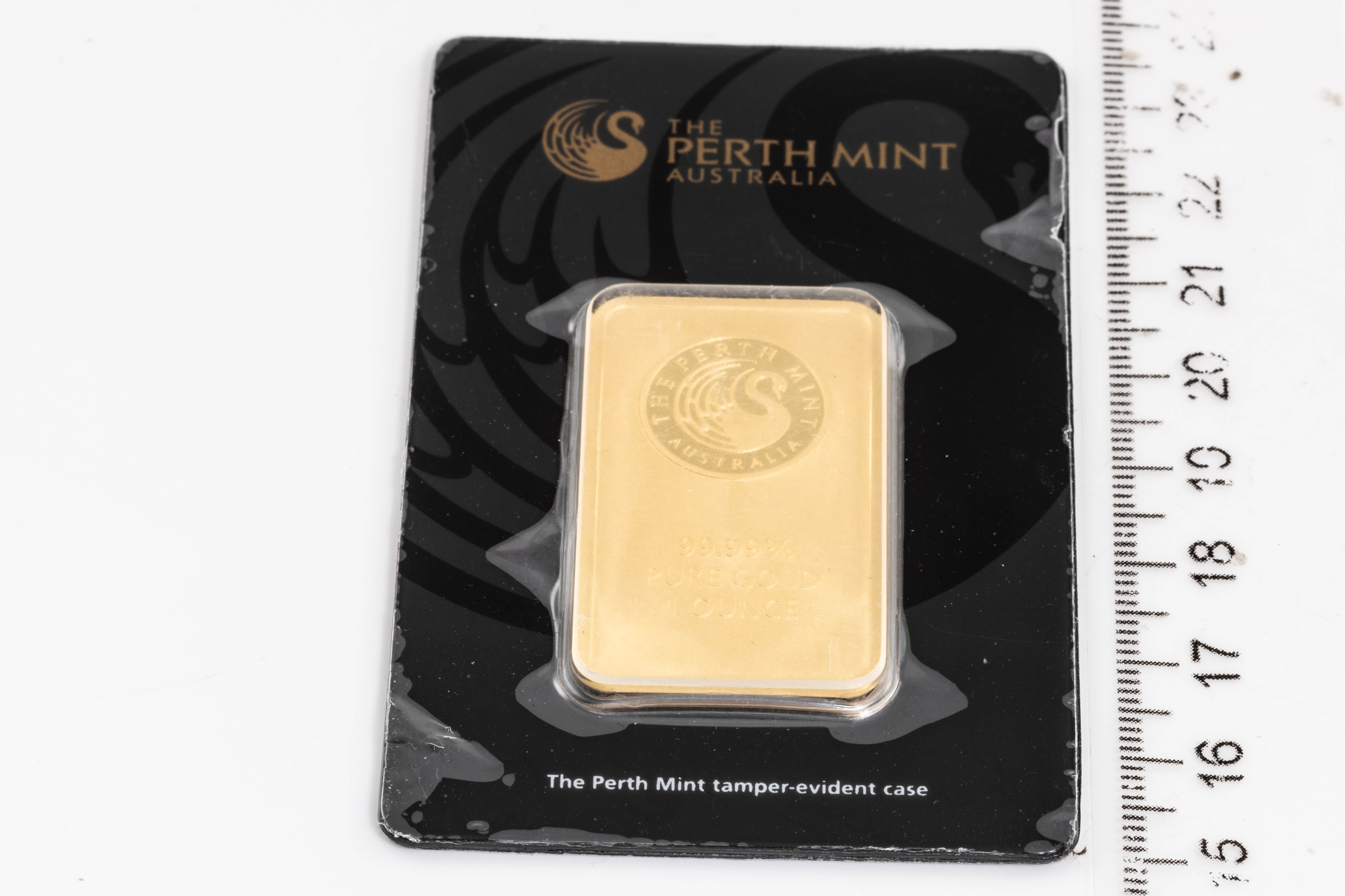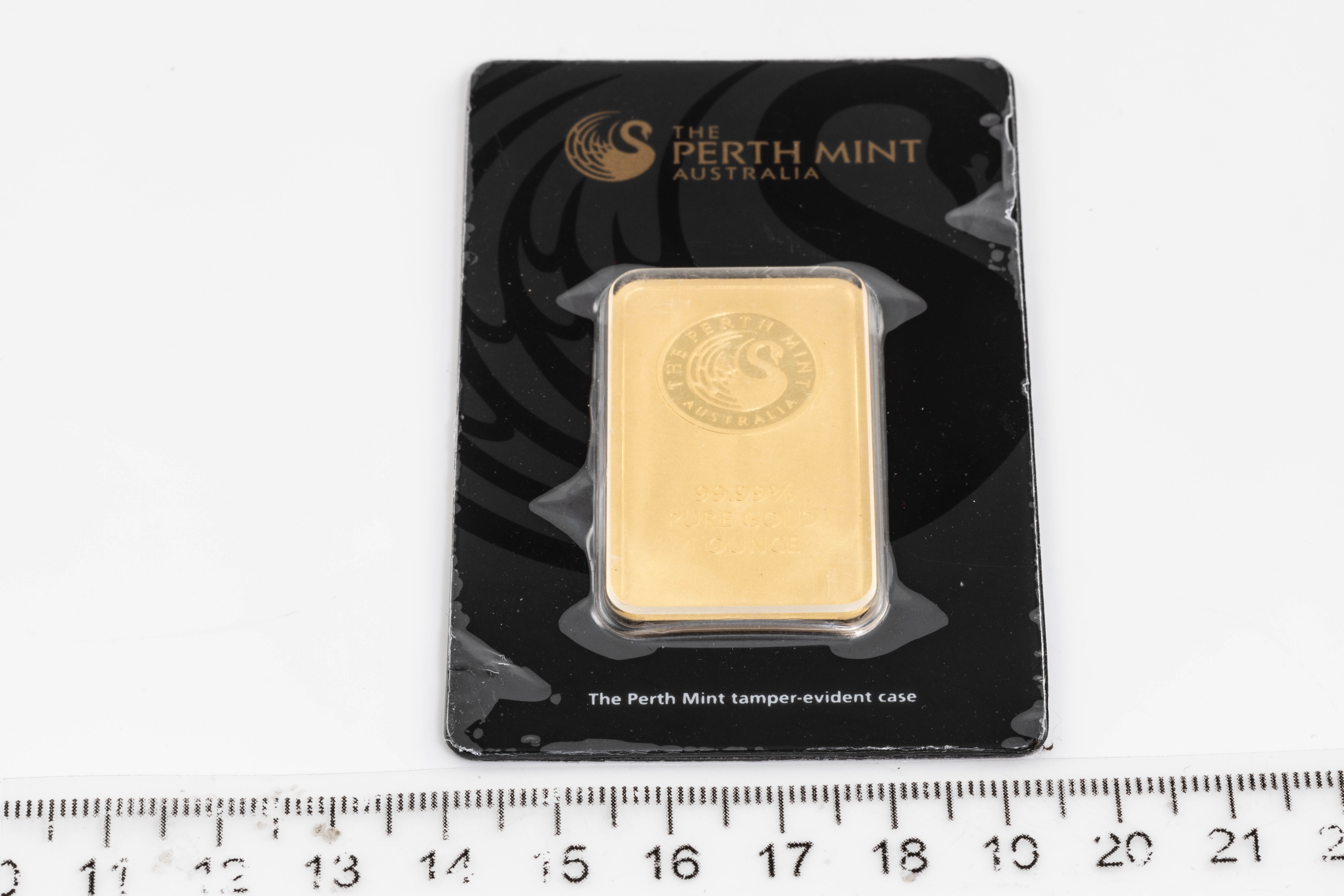 A Perth Mint Fine Gold Bar. Weight: 1 ounce: 31.1g. Serial number B06503. ***Gold bullion attracts no GST and no Buyers Premium. Available for shipping within Australia only***