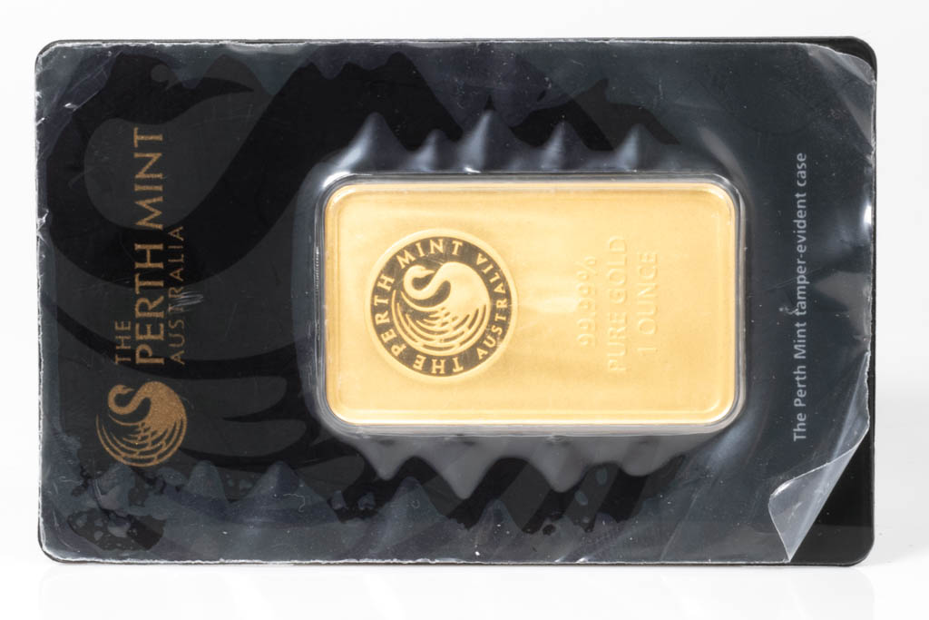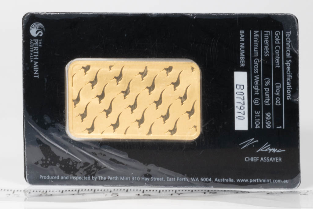 A Perth Mint Fine Gold Bar. Weight: 1 ounce: 31.1g. Serial number B077970. ***Gold bullion attracts no GST and no Buyers Premium. Available for shipping within Australia only***
