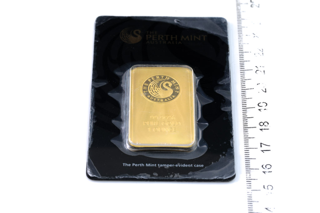 A Perth Mint Fine Gold Bar. Weight: 1 ounce: 31.1g. Serial number B104640. ***Gold bullion attracts no GST and no Buyers Premium. Available for shipping within Australia only***