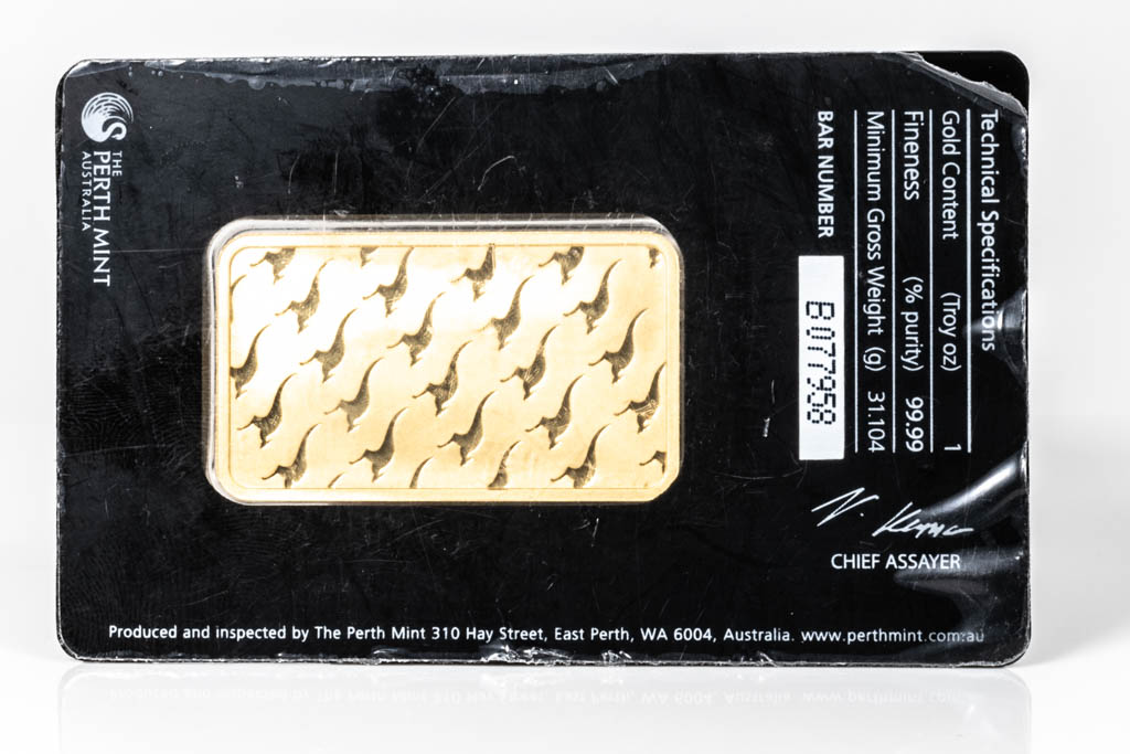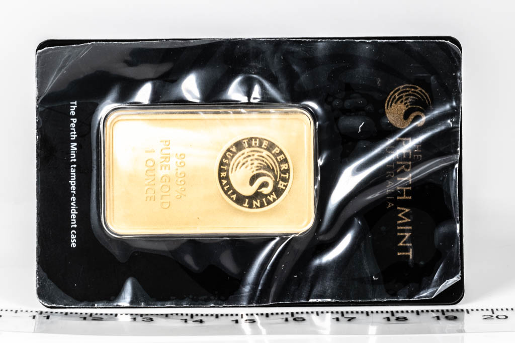 A Perth Mint Fine Gold Bar. Weight: 1 ounce: 31.1g. Serial number B077958. ***Gold bullion attracts no GST and no Buyers Premium. Available for shipping within Australia only***