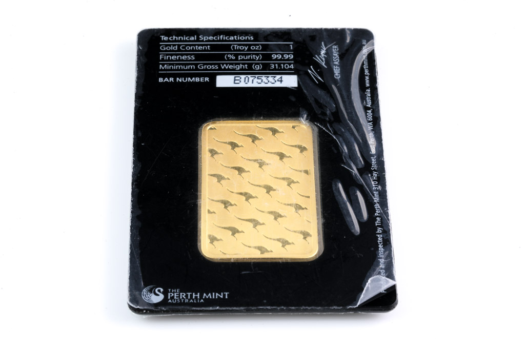 A Perth Mint Fine Gold Bar. Weight: 1 ounce: 31.1g. Serial number B075334. ***Gold bullion attracts no GST and no Buyers Premium. Available for shipping within Australia only***