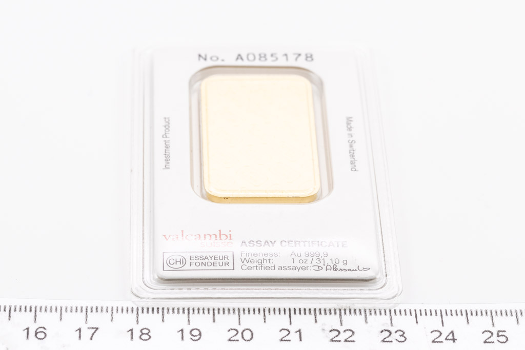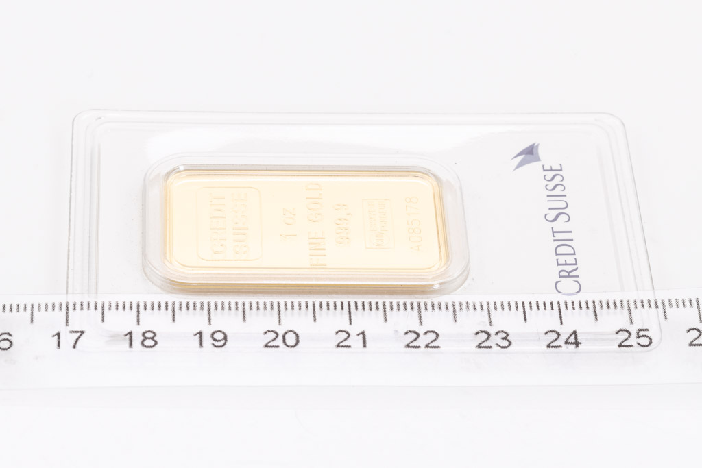 A Credit Suisse Fine Gold Bar. Weight: 1 ounce: 31.1g. Serial number A085178. ***Gold bullion attracts no GST and no Buyers Premium. Available for shipping within Australia only***