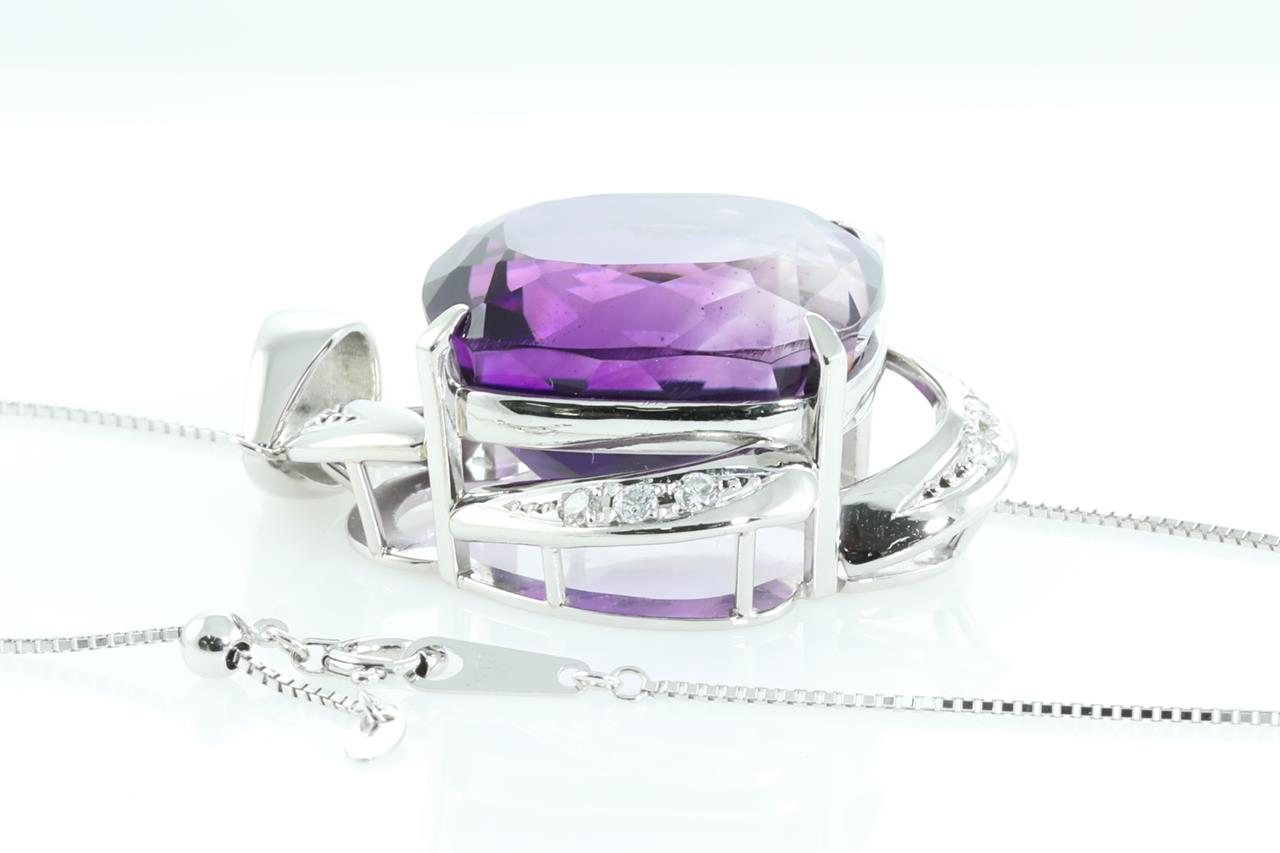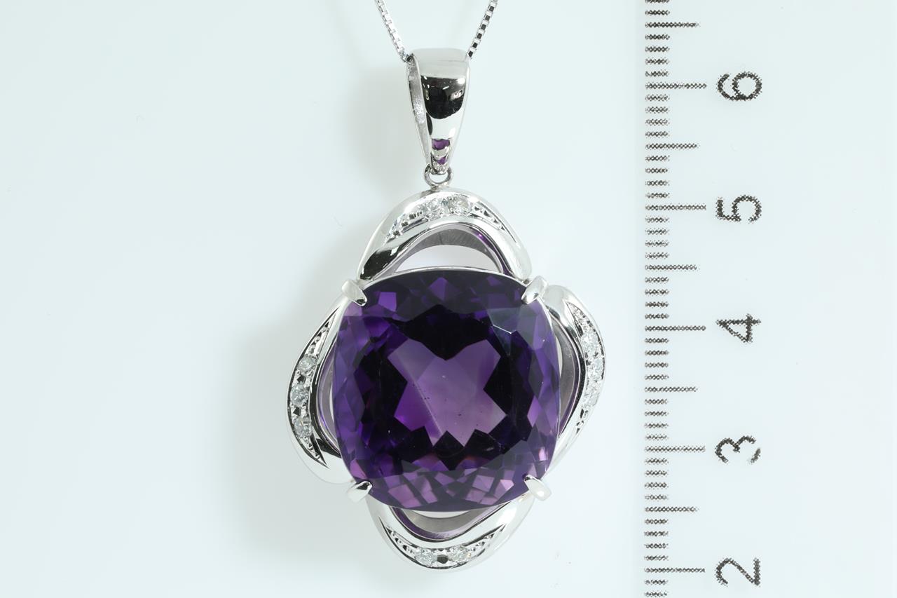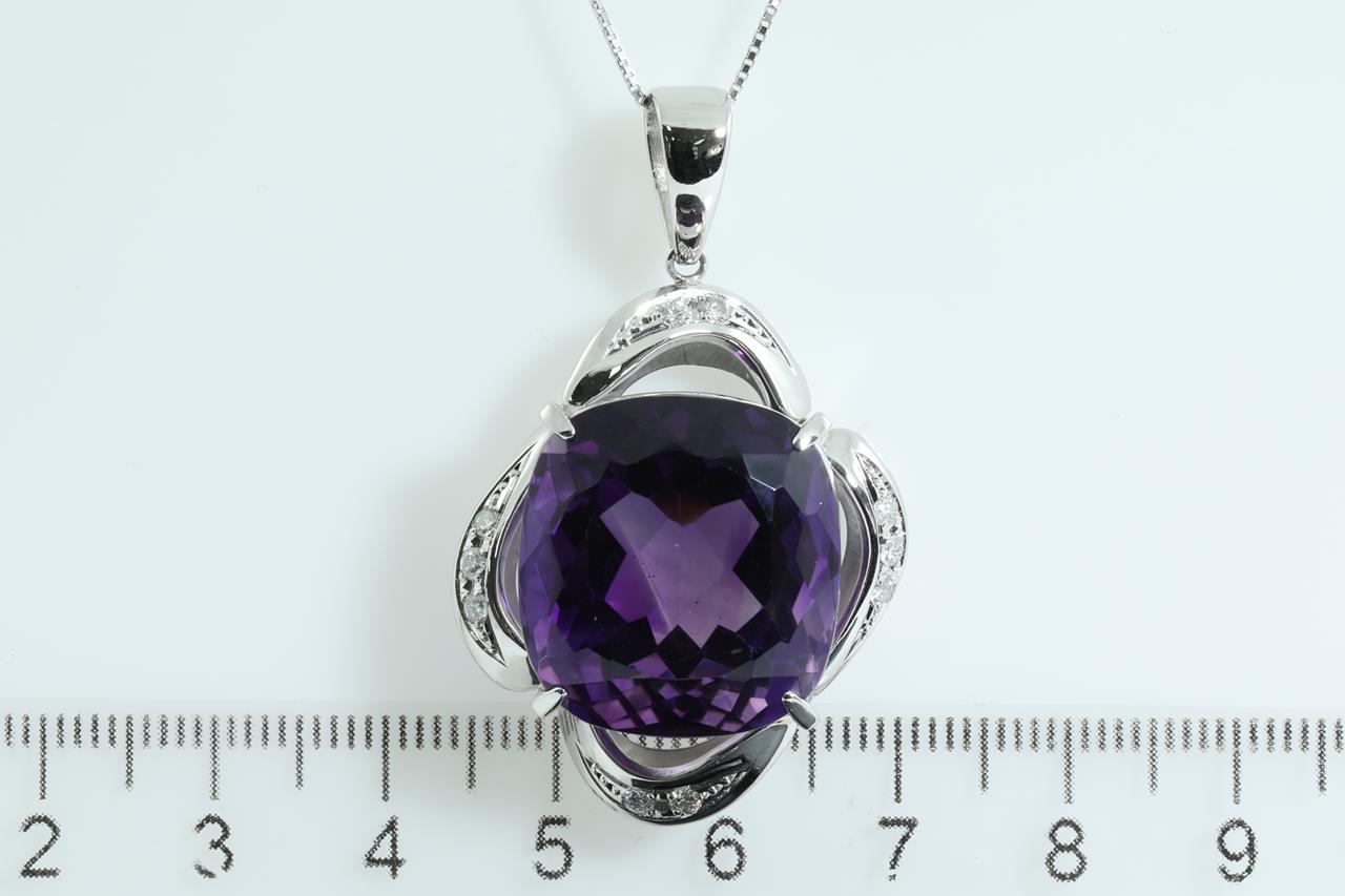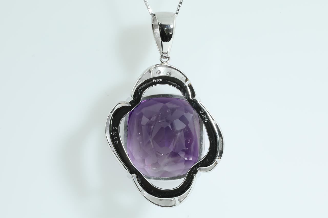 Amethyst and Diamond pendant with cushion cut Amethyst of 31.25ct and Diamonds totalling 0.25cts. Platinum with 18ct white gold 45cm adjustable chain. Weight: 19.7g (Pre-owned)