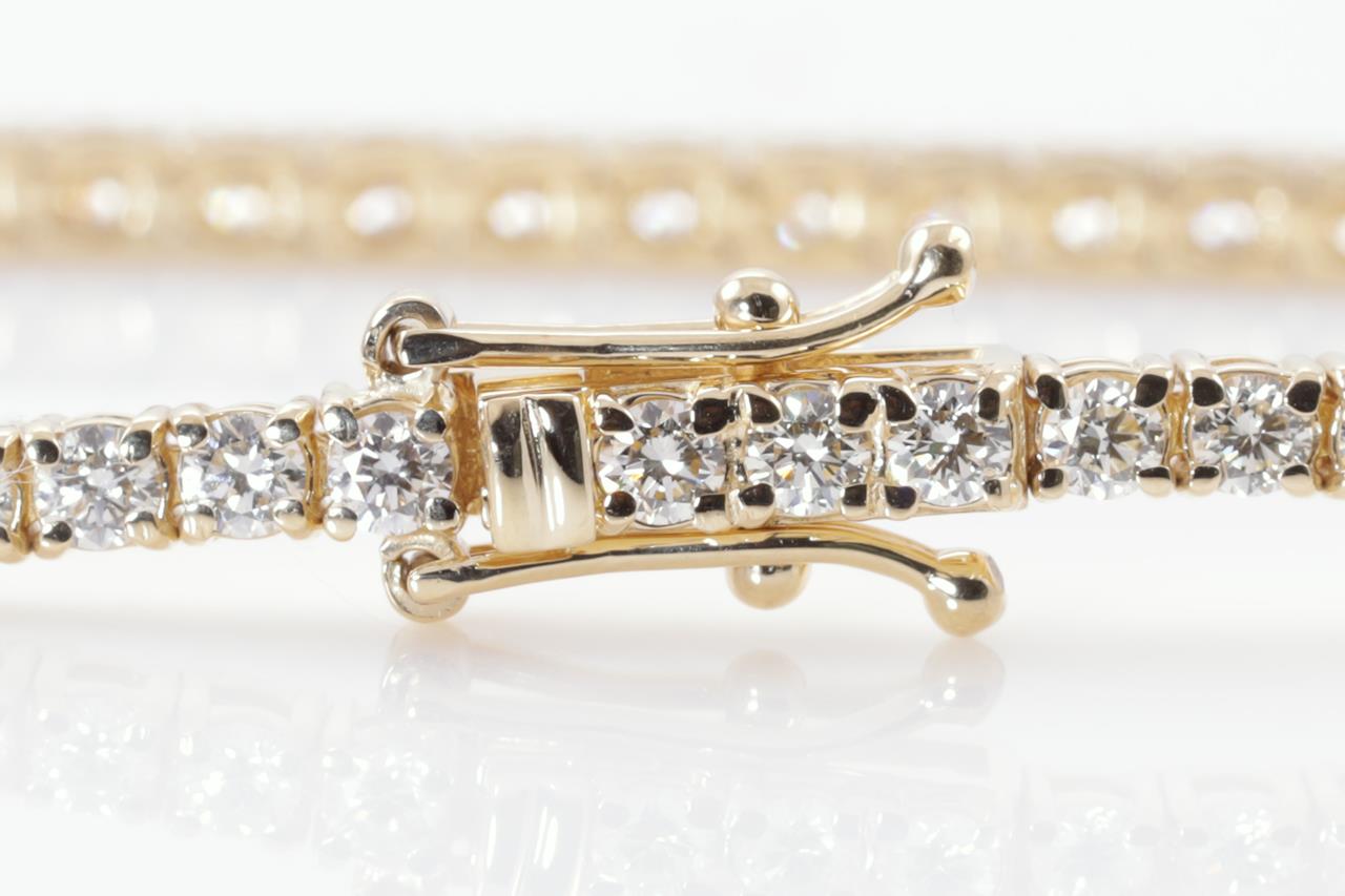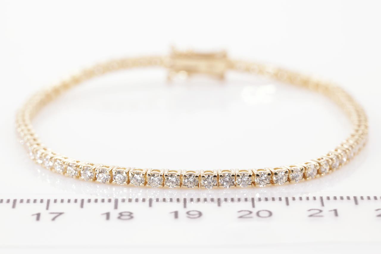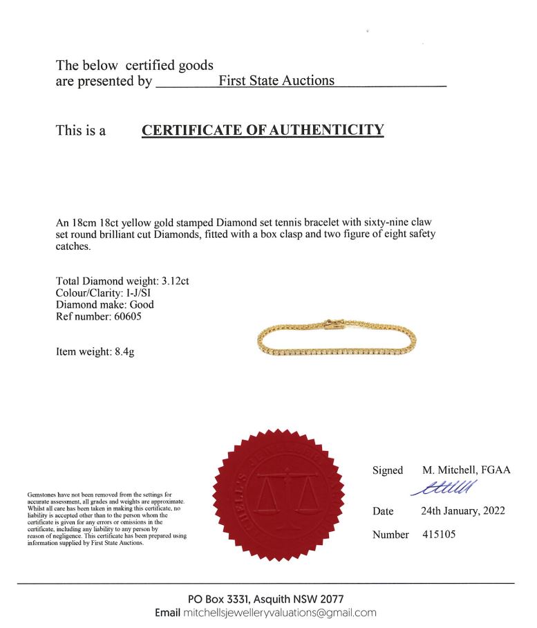 Diamond tennis bracelet with 69 round Diamonds totalling 3.12cts (Estimated grading: I-J SI). 18ct yellow gold. Length: 18cm. Weight: 8.4g. With certificate #415105. (New)