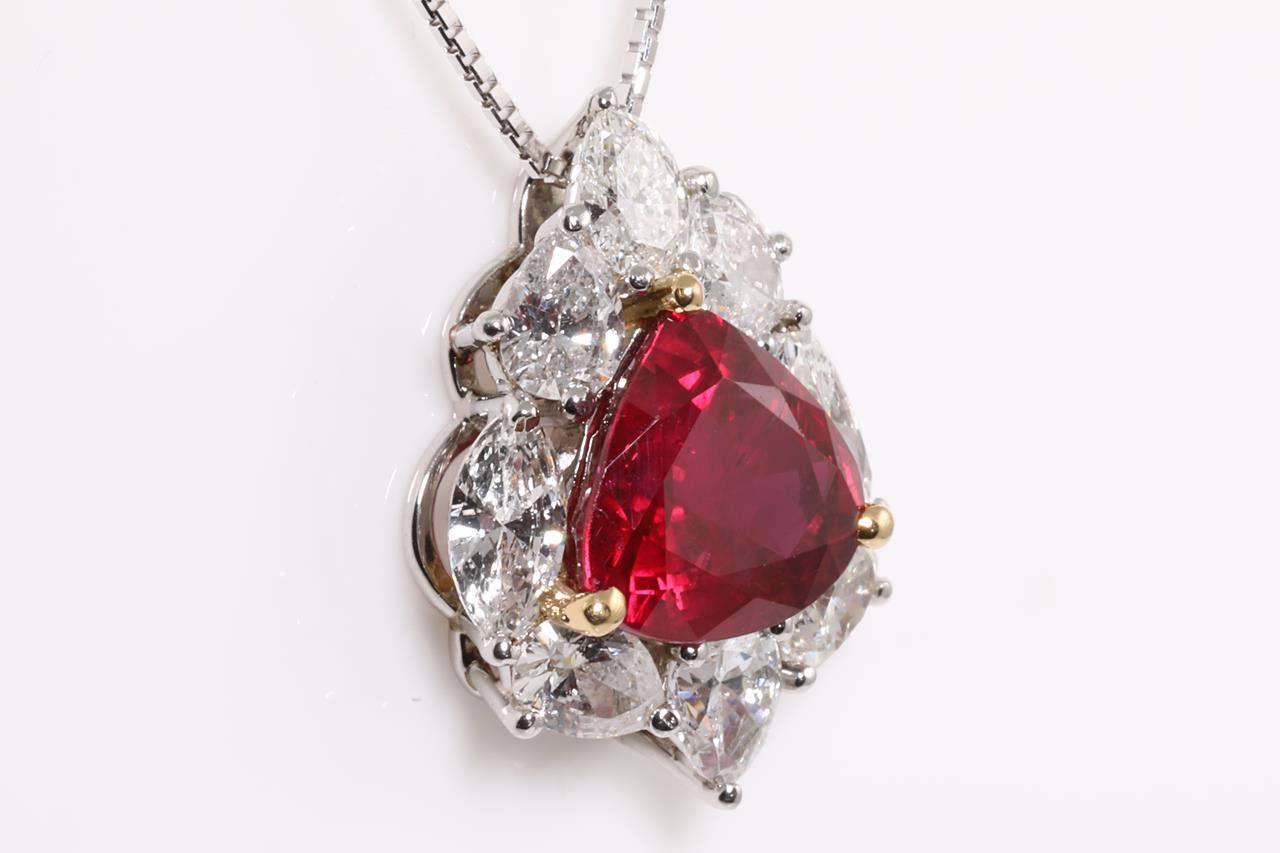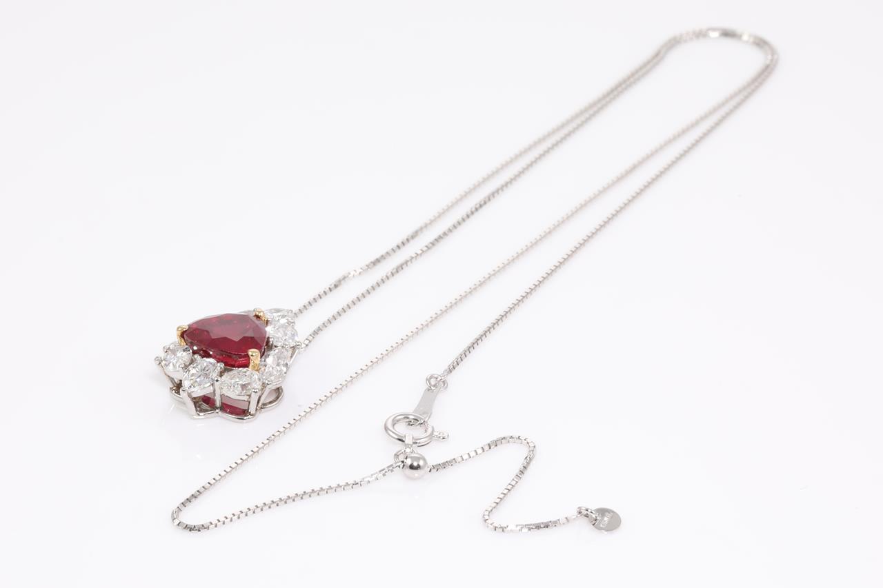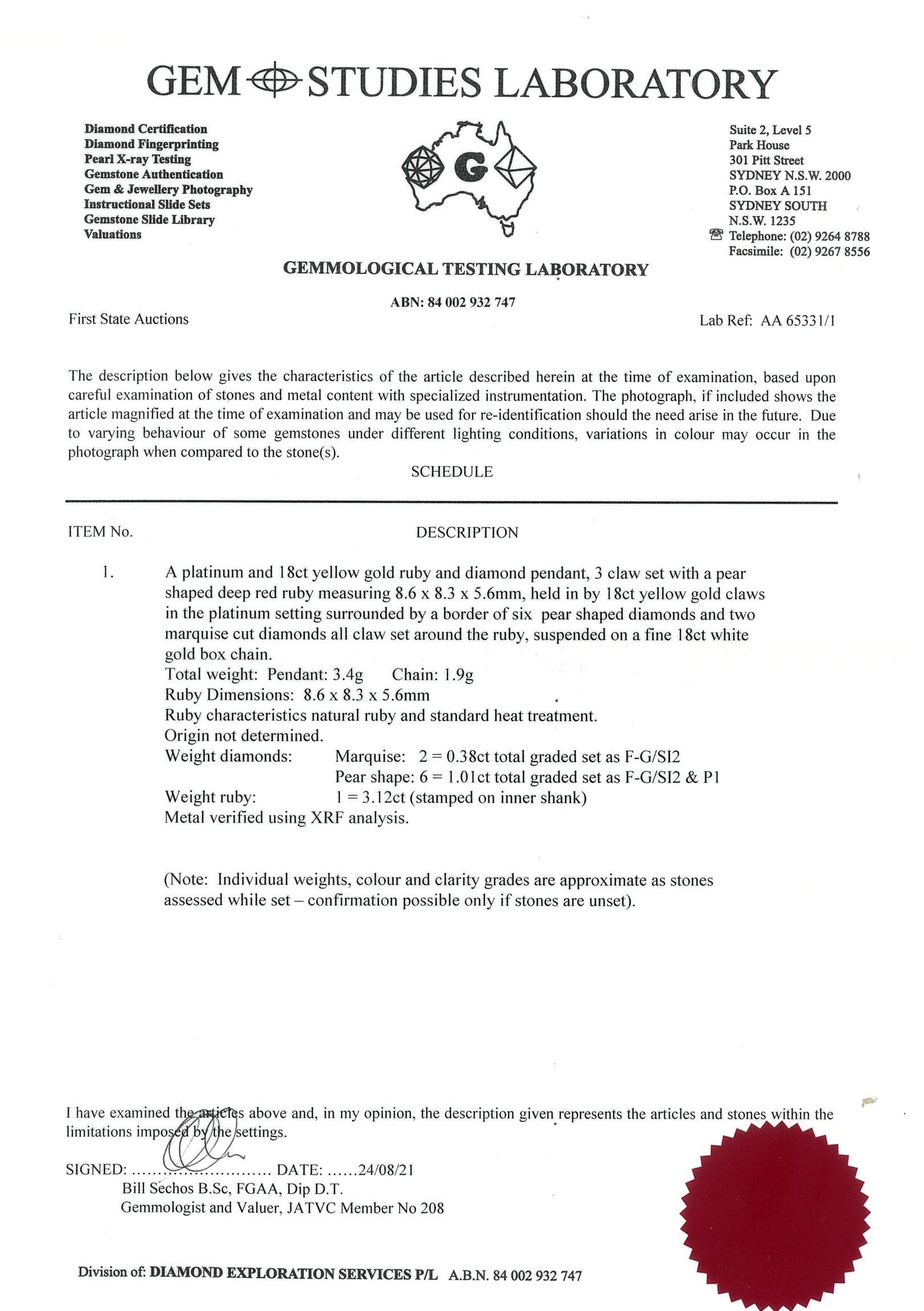 Ruby and Diamond pendant with a pear shape deep Ruby of 3.12ct (with GSL Description #AA 65331/1) and round & marquise cut Diamonds totalling 1.39cts (Estimated grading: G SI). 18ct yellow gold & Platinum with 44cm 18ct white gold adjustable chain. Weight: 5.2g. (Pre-owned)